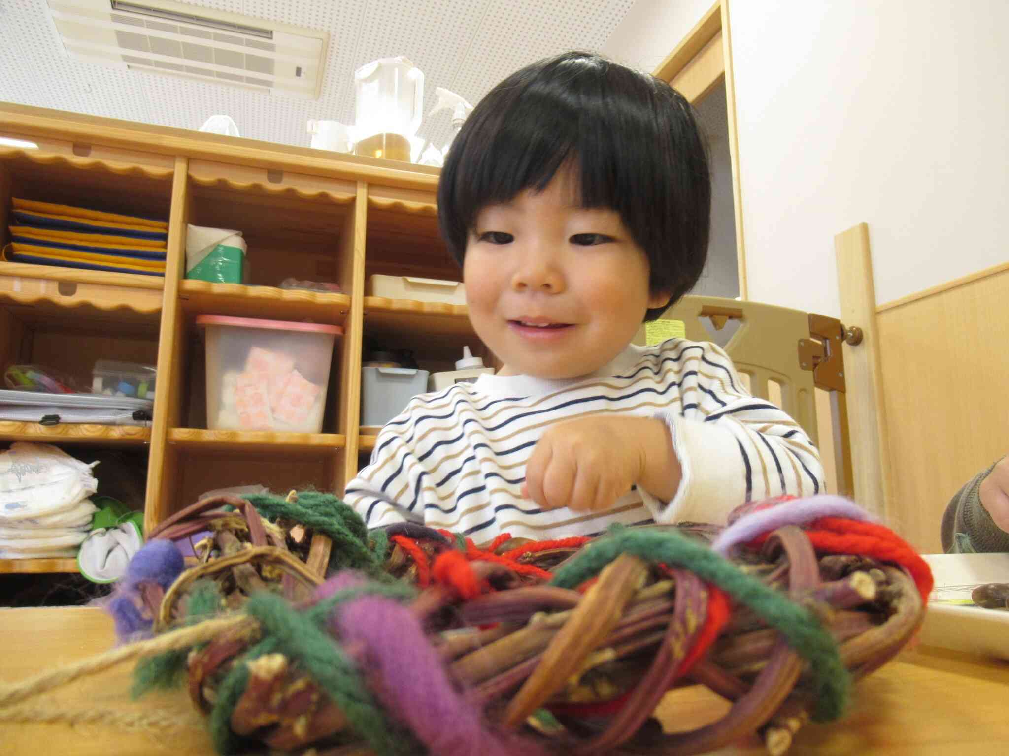 リースはみんなで育てたさつまいものツルを編んだものに、赤・緑・紫の毛糸をくるくると巻きつけます。