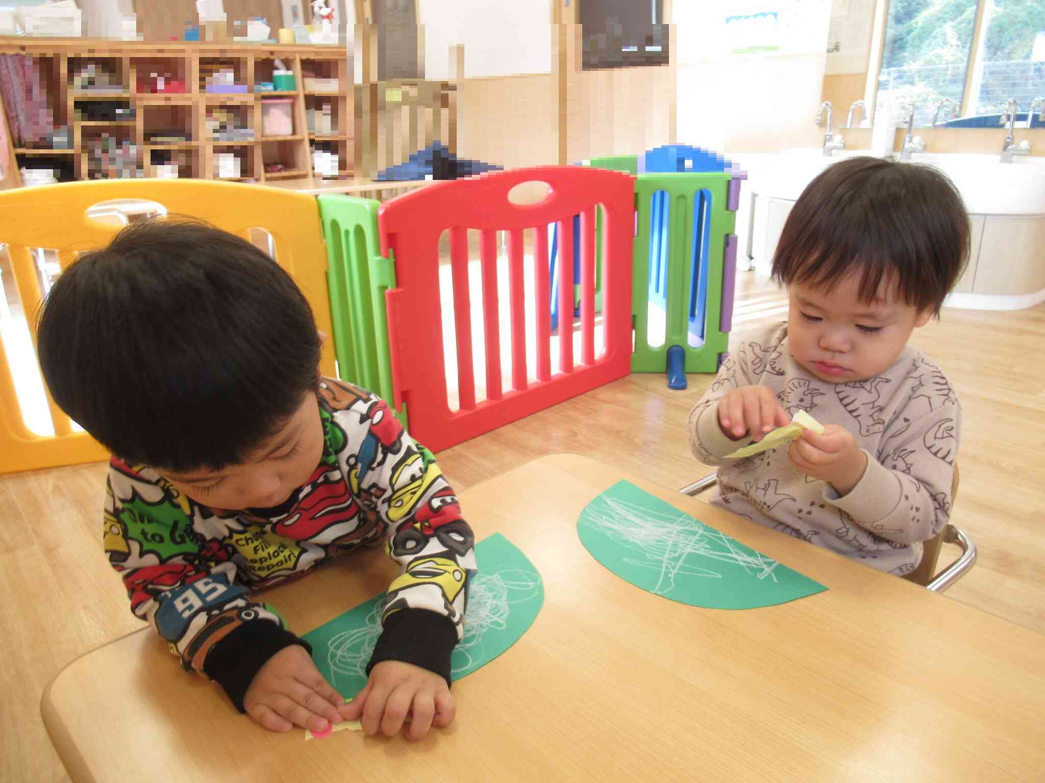 まずは、緑の画用紙にクレヨンで白い飾りを沢山描きました。