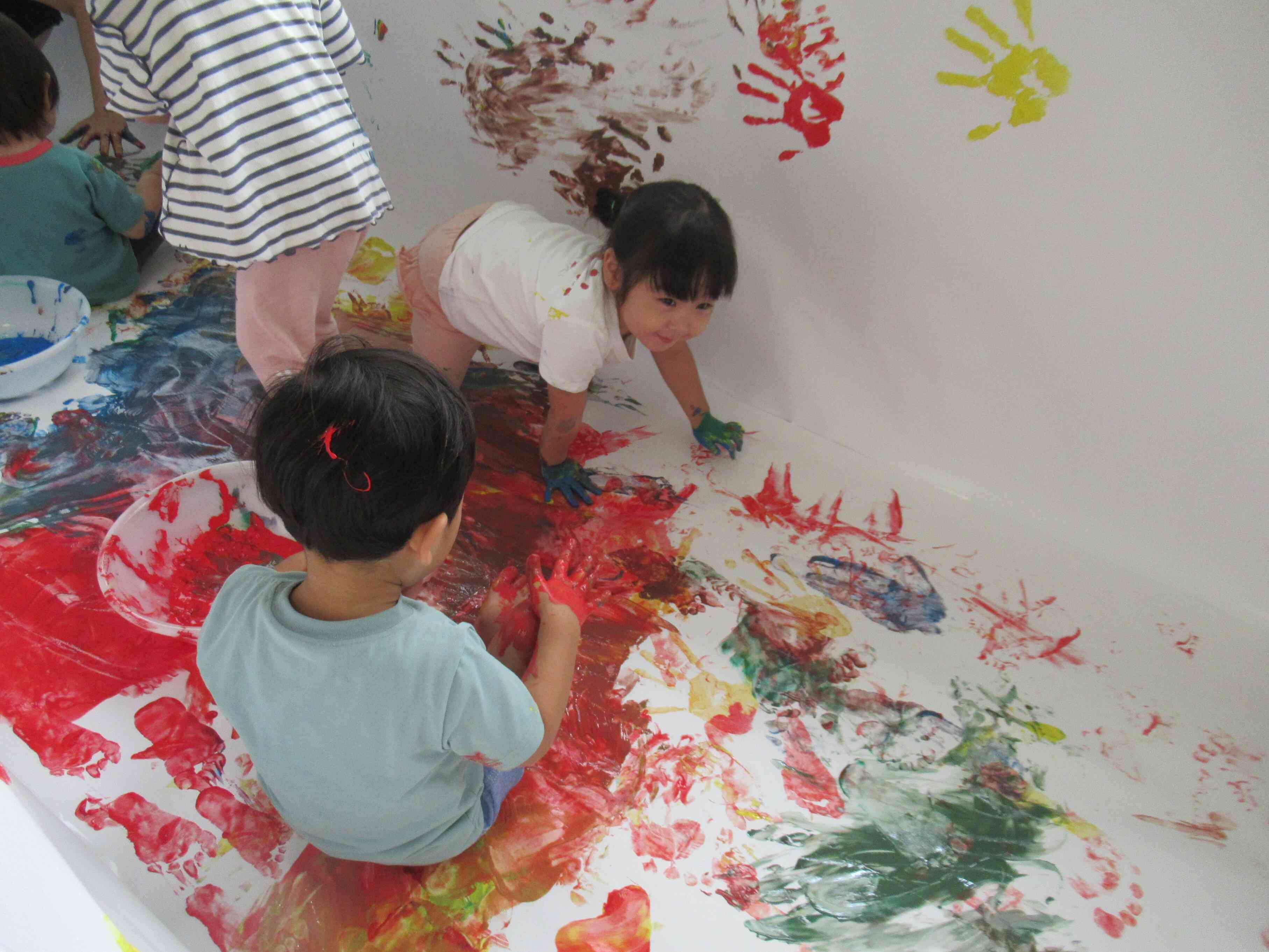 色が混ざり合うと、「あっ緑色になったよ」と嬉しそうに教えてくれました。「みてみて」とニコニコで手のひらについた絵の具を見せてくれたりと、豪快に遊んでいる子どもたちの嬉しそうな表情が伝わり可愛らしいです。