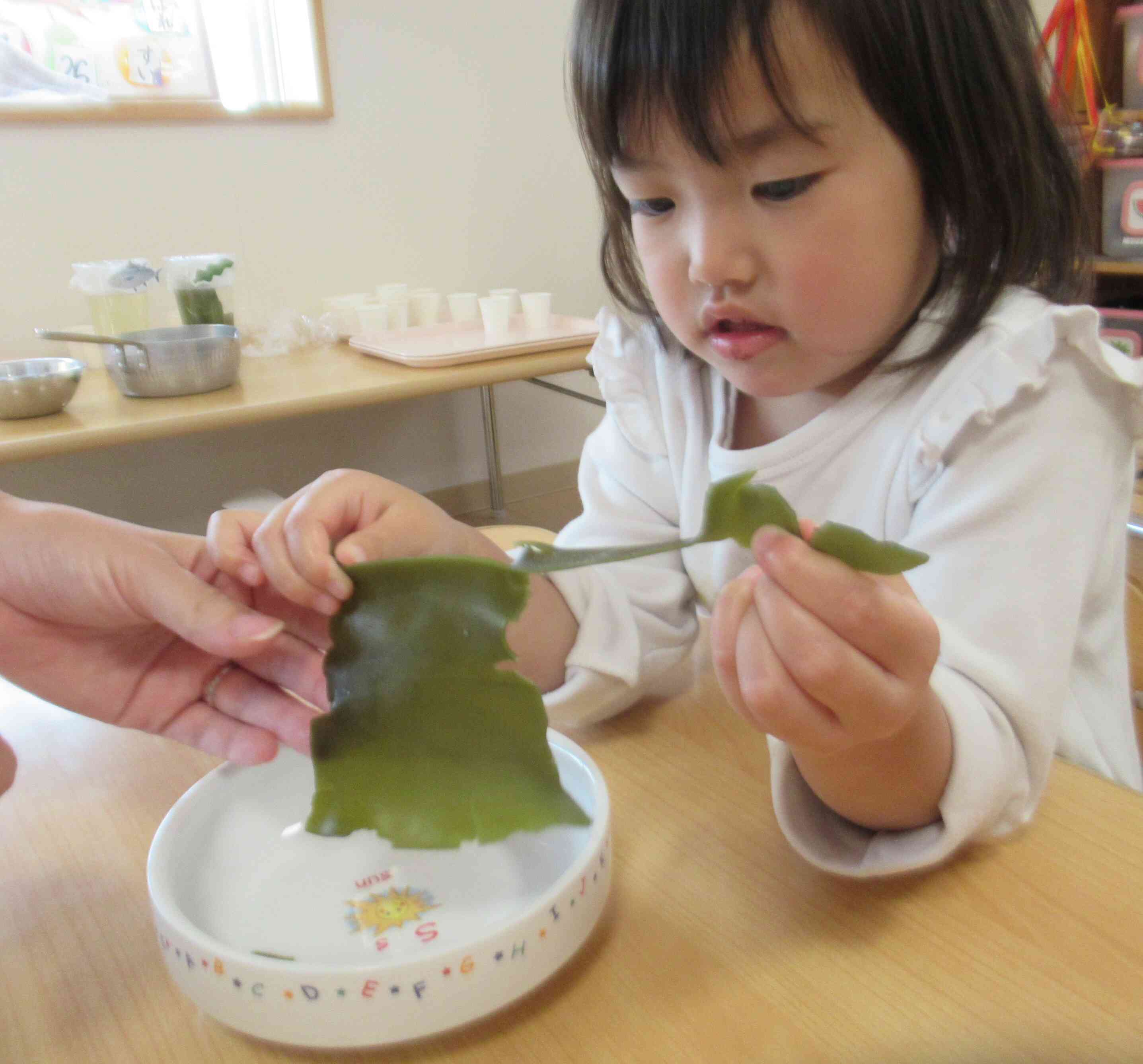 だしが何からできているのかを知るために、実際の食材にも触れてみました。指でつかんだかつお節をヒラヒラ~と動かしてみたり、ワカメや昆布を触って「つるつるしてるね」など感触を楽しんだり、とても興味津々な子どもたちです。実際に給食にも使われていることを知ると、このあとの給食の時間を楽しみにしている様子がありました。