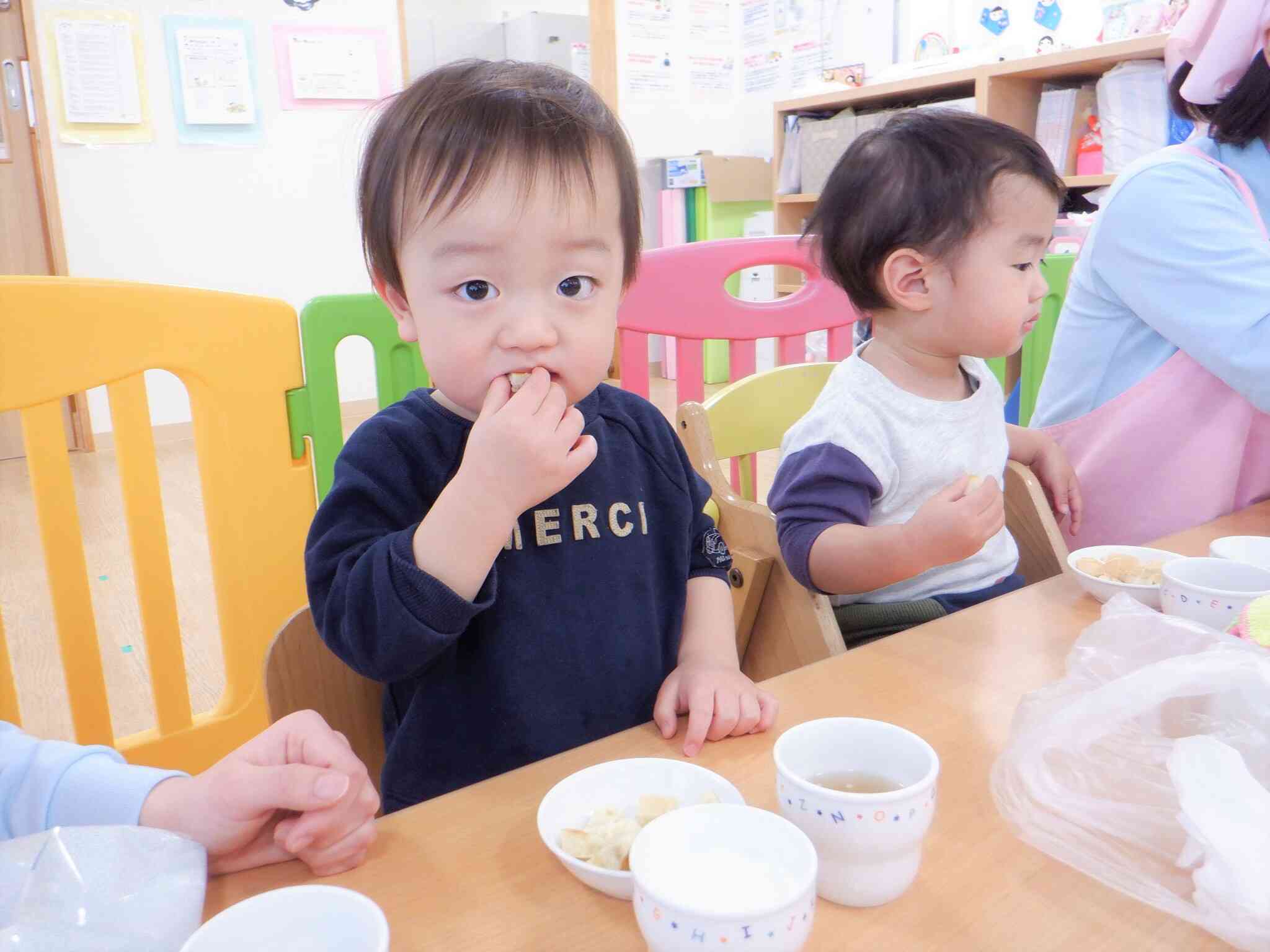 ひよこ組さんも上手に手づかみで食べています。
