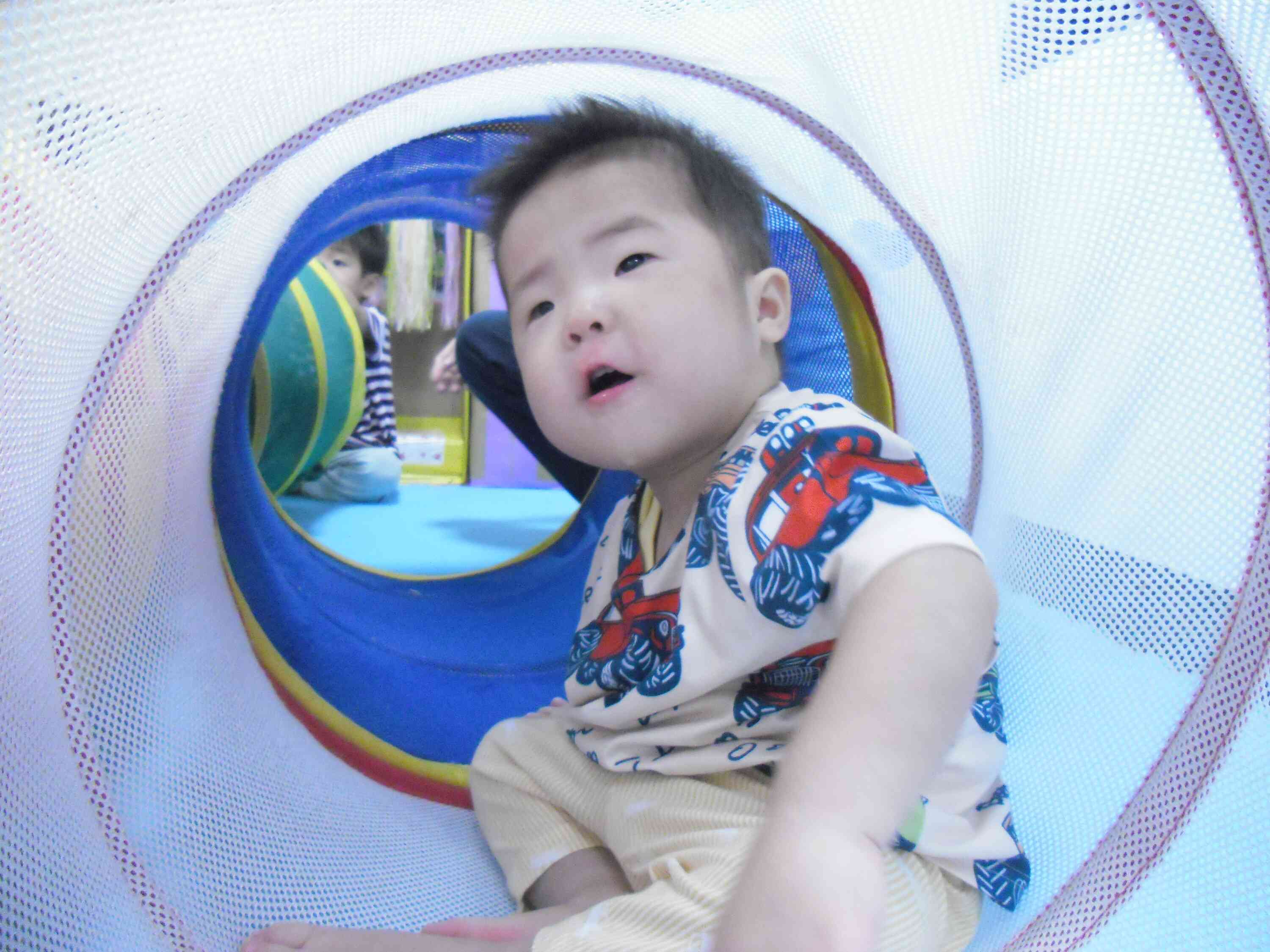 子どもたちは勢いよくトンネルの中に入り、出口ではお友だちと顔を見合わせながら元気いっぱい遊んでいました。はいはいでトンネルをくぐり、体を使って汗をかくほど夢中に楽しむ姿が印象的でした。