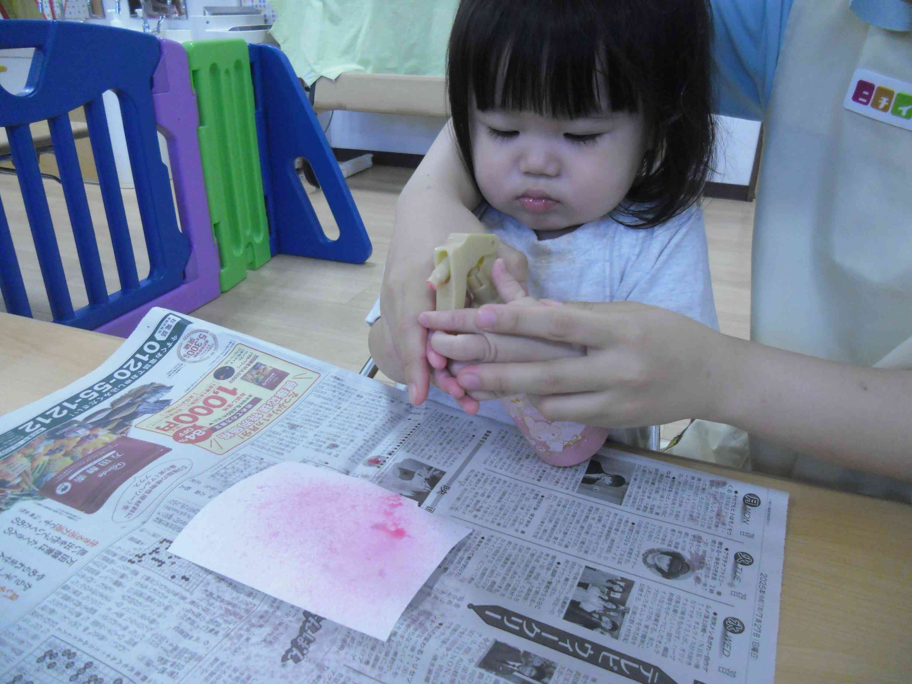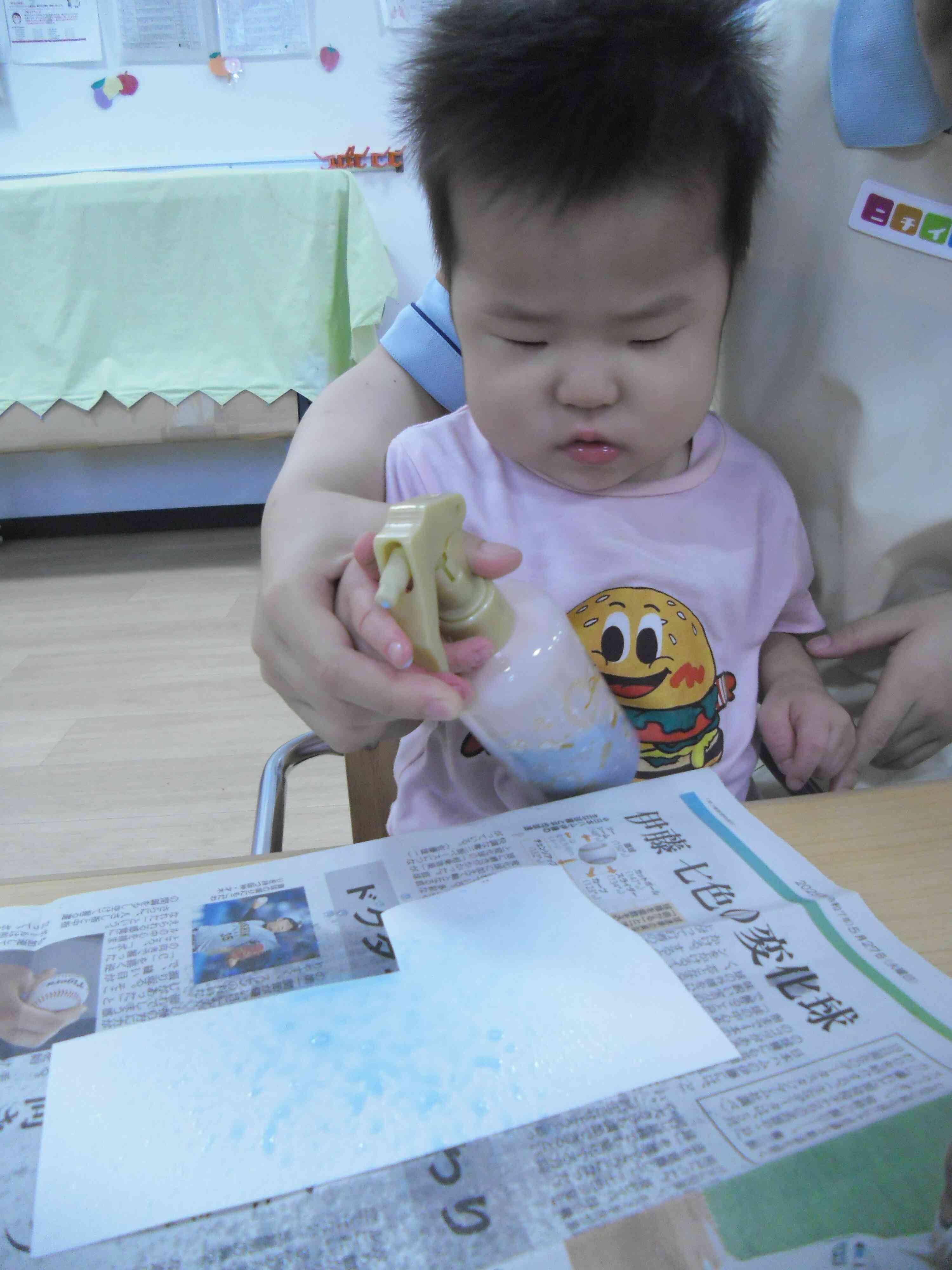 霧吹きを使った製作をしました。両手で霧吹きを握り、画用紙にシュッシュッと吹きかけていました。先生にお手伝いしてもらいながら、色が広がる様子を楽しんでいました。完成が楽しみだね!