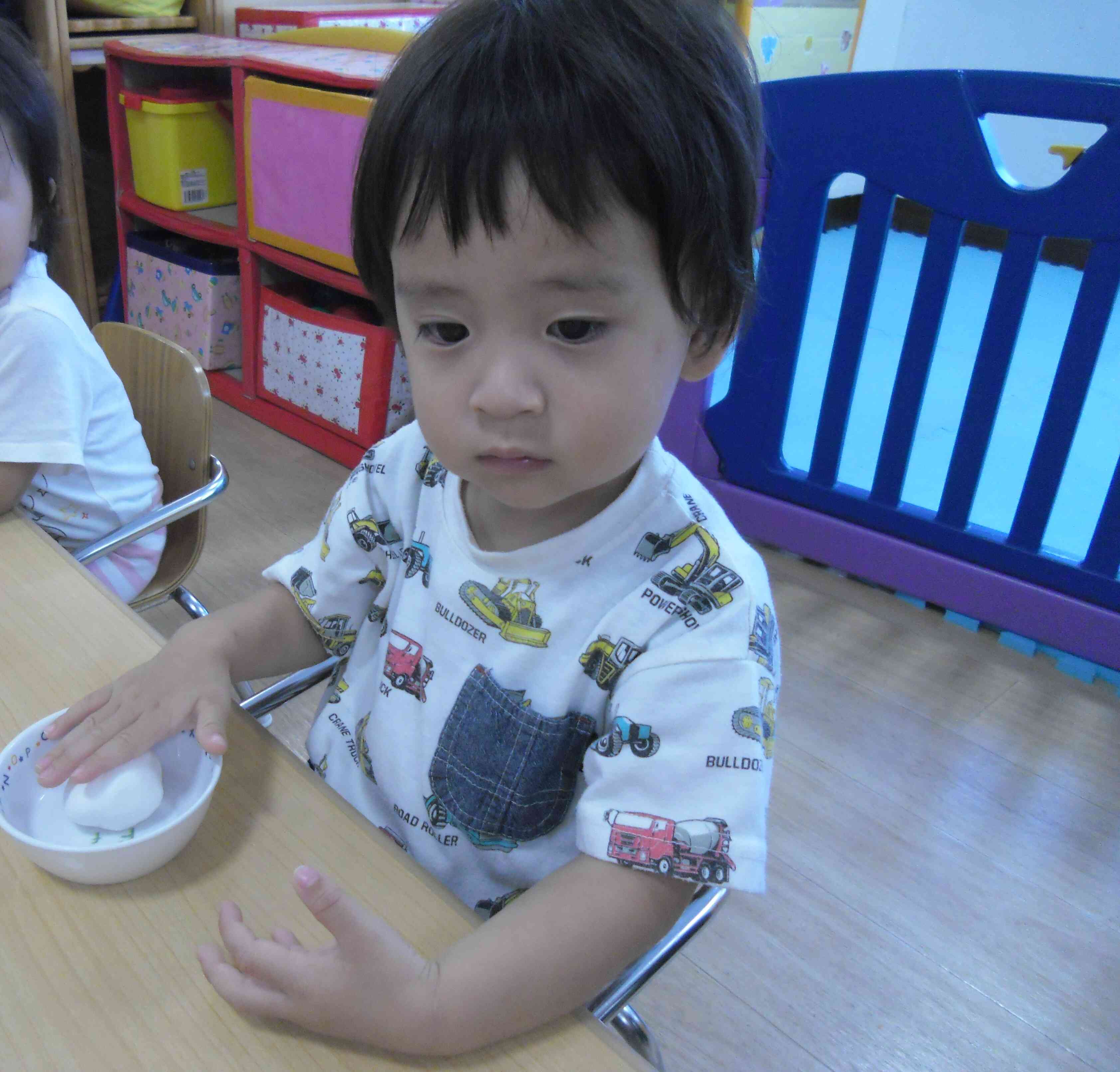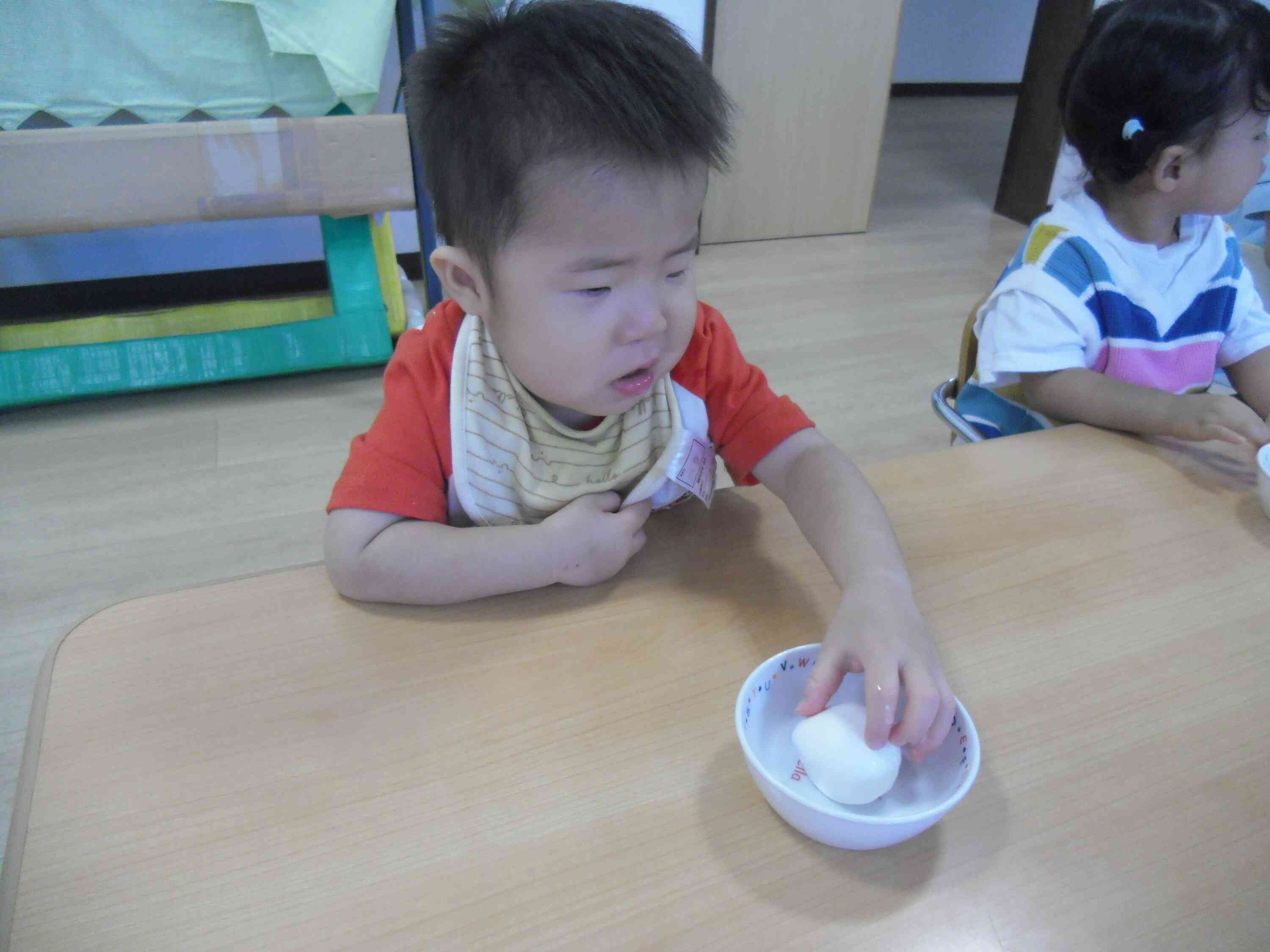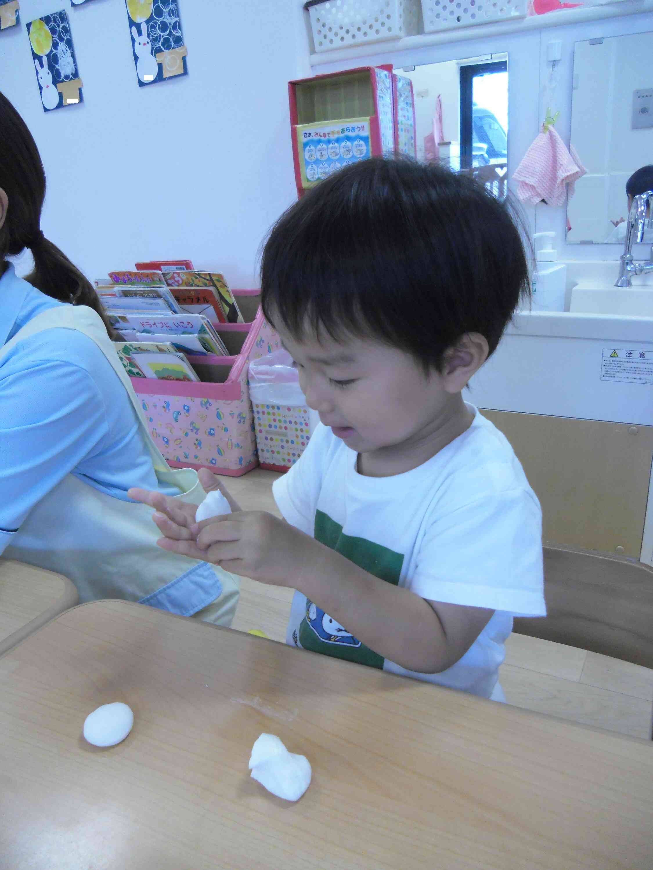 米粉粘土を使ってお団子づくりをしました。米粉粘土の冷たさを手のひらで感じながら、ちぎったり丸めたりして感触あそびに夢中の子どもたち。コロコロと転がして小さなお団子を作って並べたり大きく丸めてみたりと、工夫しながら形づくっていました。