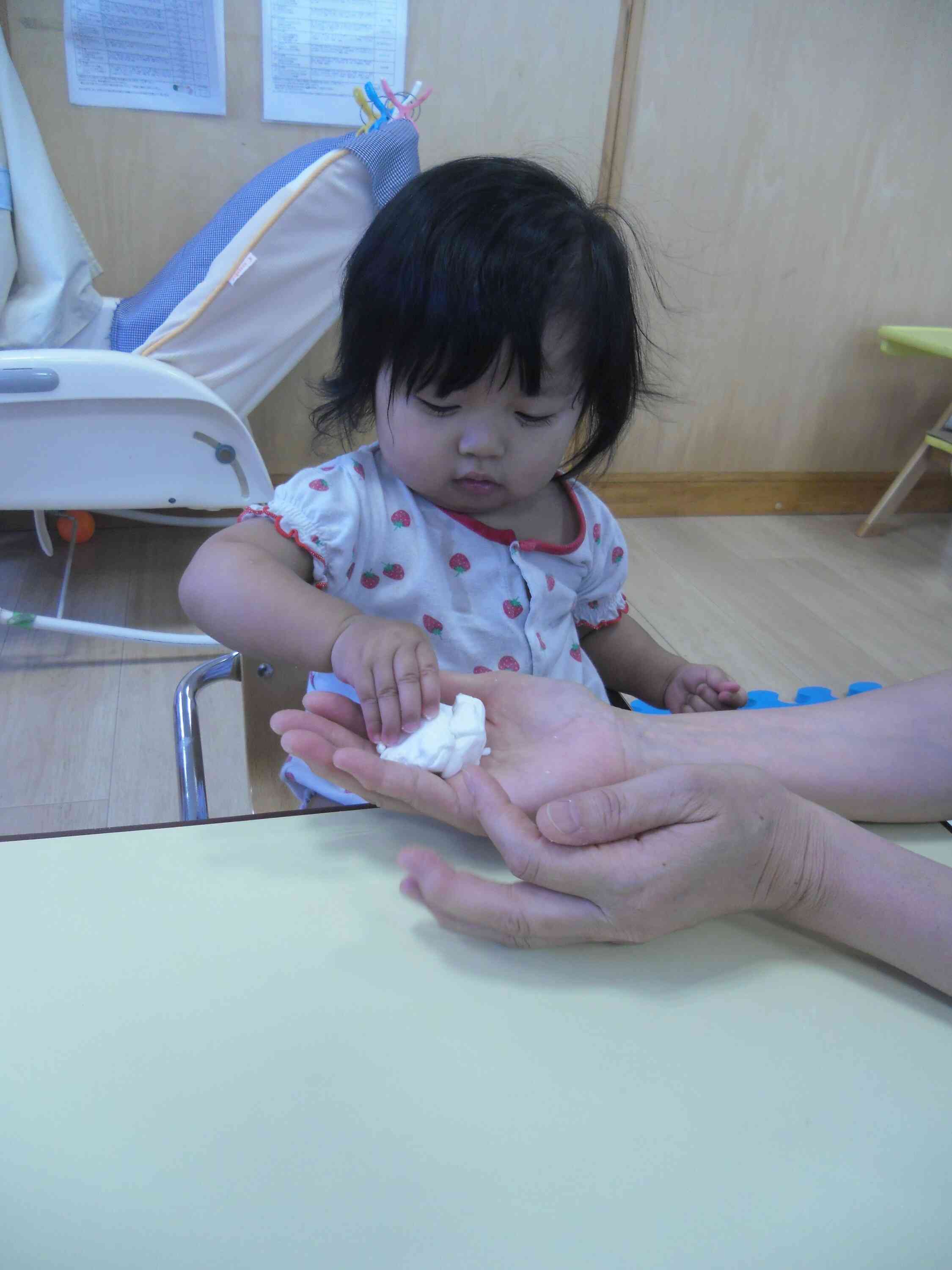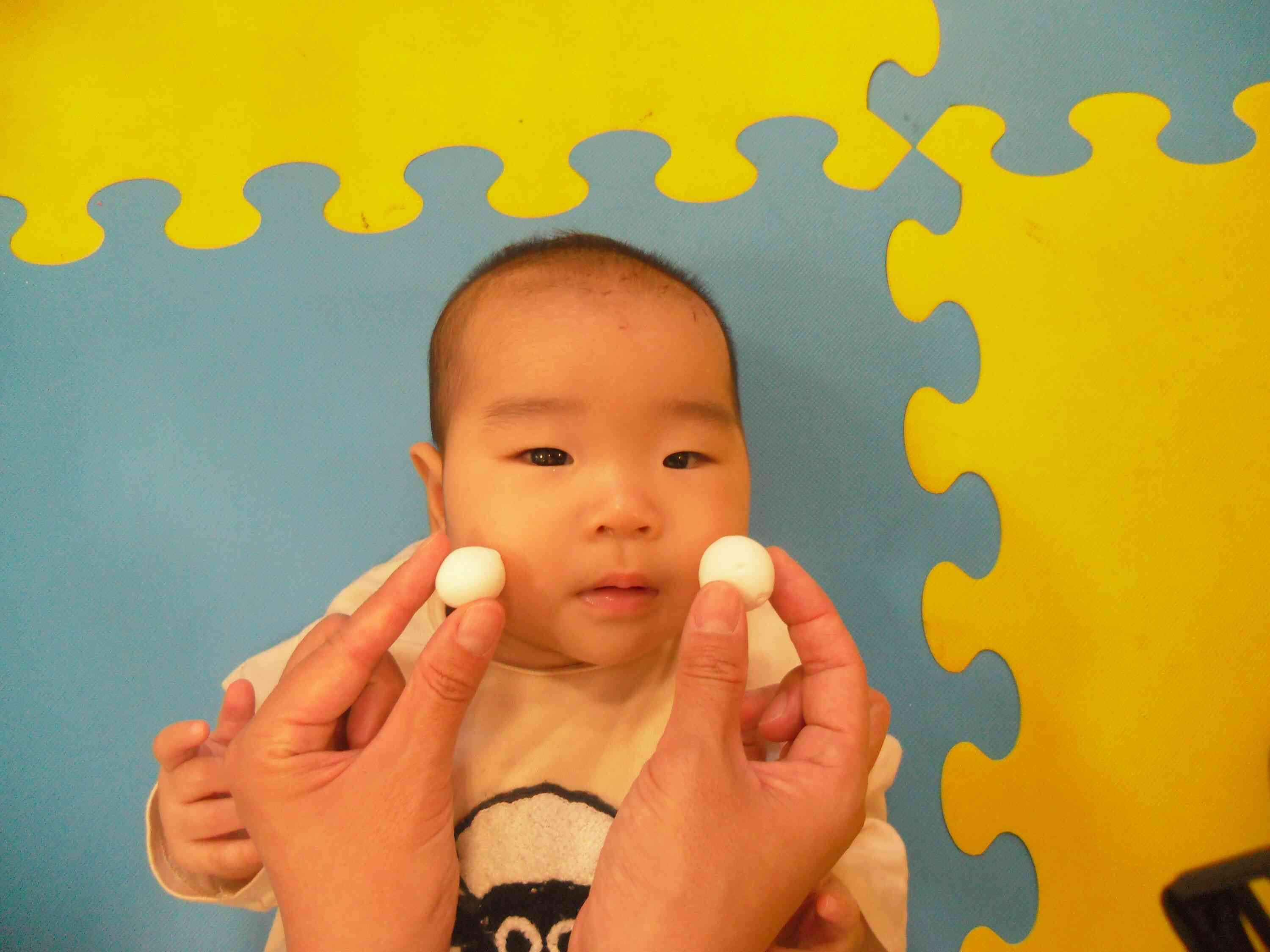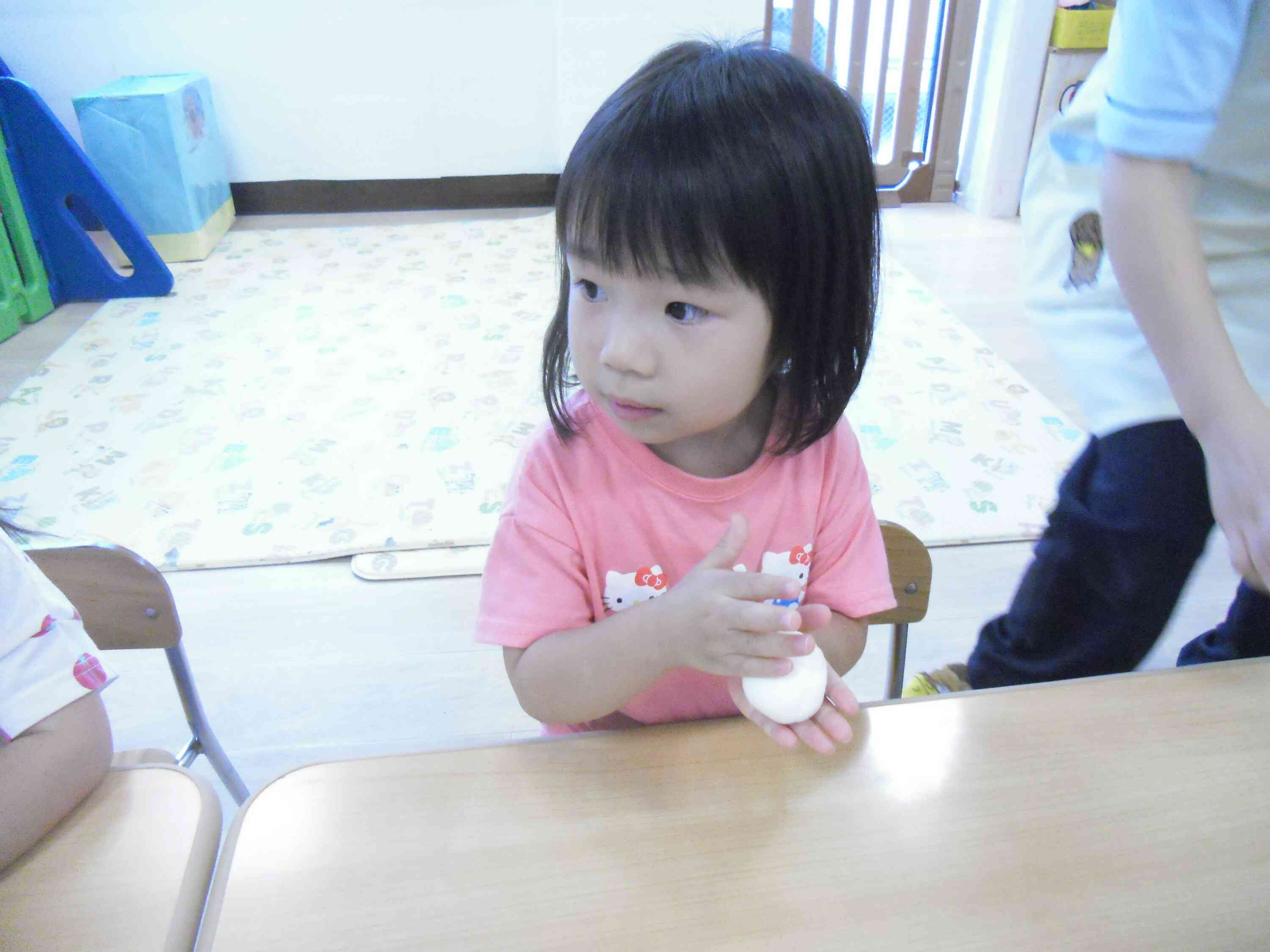 米粉粘土を使ってお団子づくりをしました。米粉粘土の冷たさを手のひらで感じながら、ちぎったり丸めたりして感触あそびに夢中の子どもたち。コロコロと転がして小さなお団子を作って並べたり大きく丸めてみたりと、工夫しながら形づくっていました。