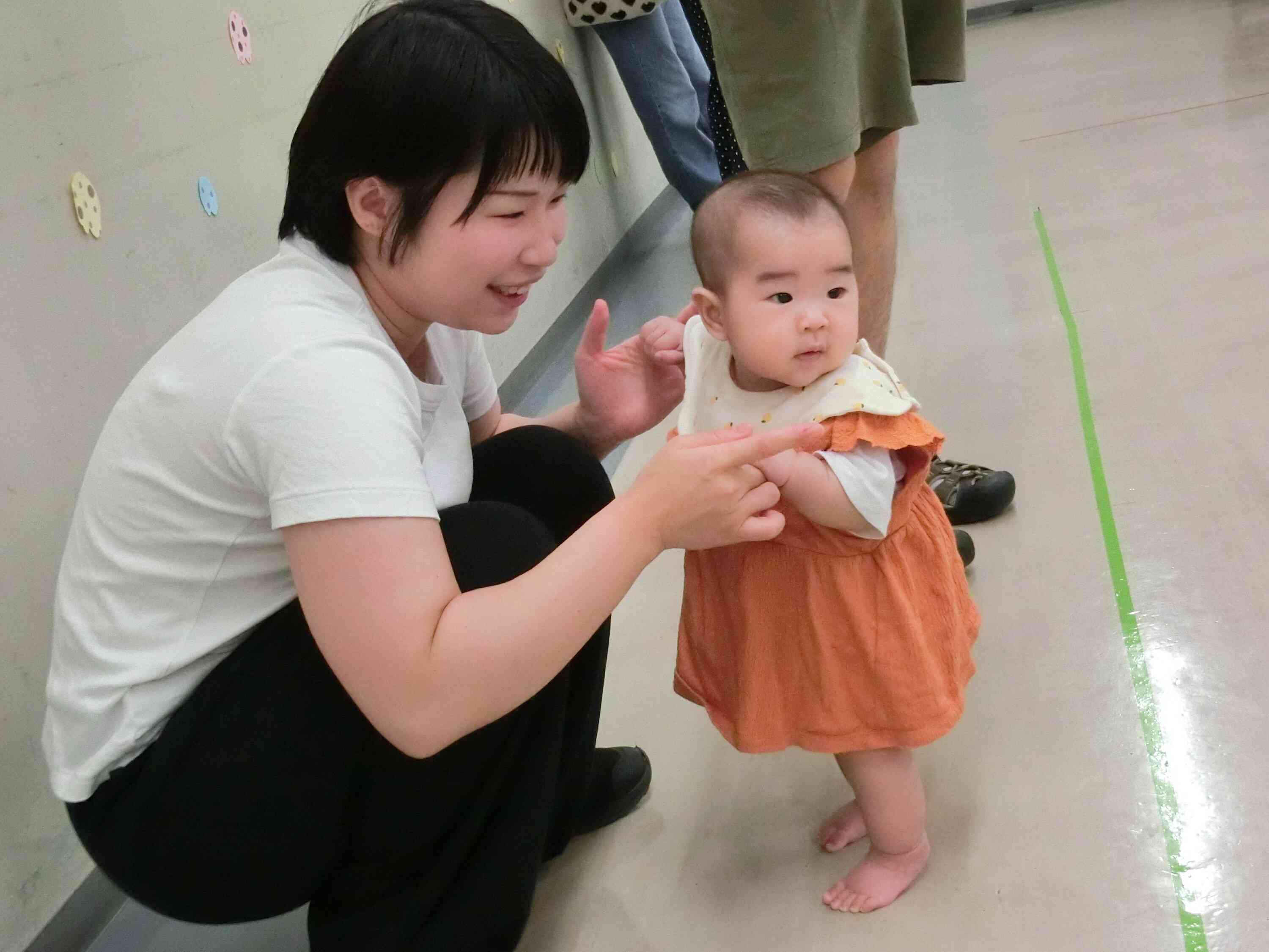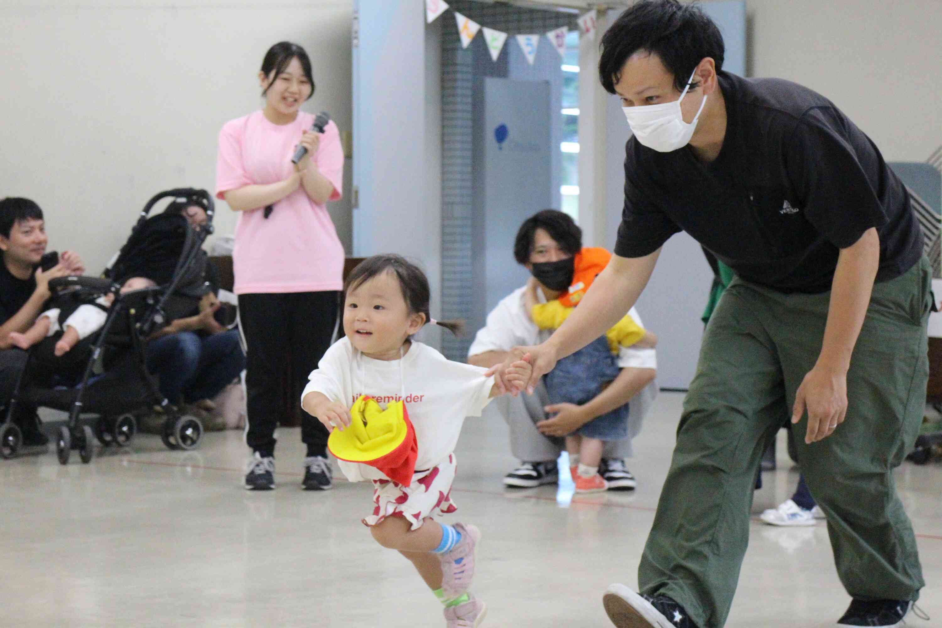 1歳児さんと2歳児さんはかけっこをしました。1歳児さんはお父さんお母さんと一緒に、2歳児さんはゴールで待つお父さんお母さんのところまで「よ~い、どん!」。