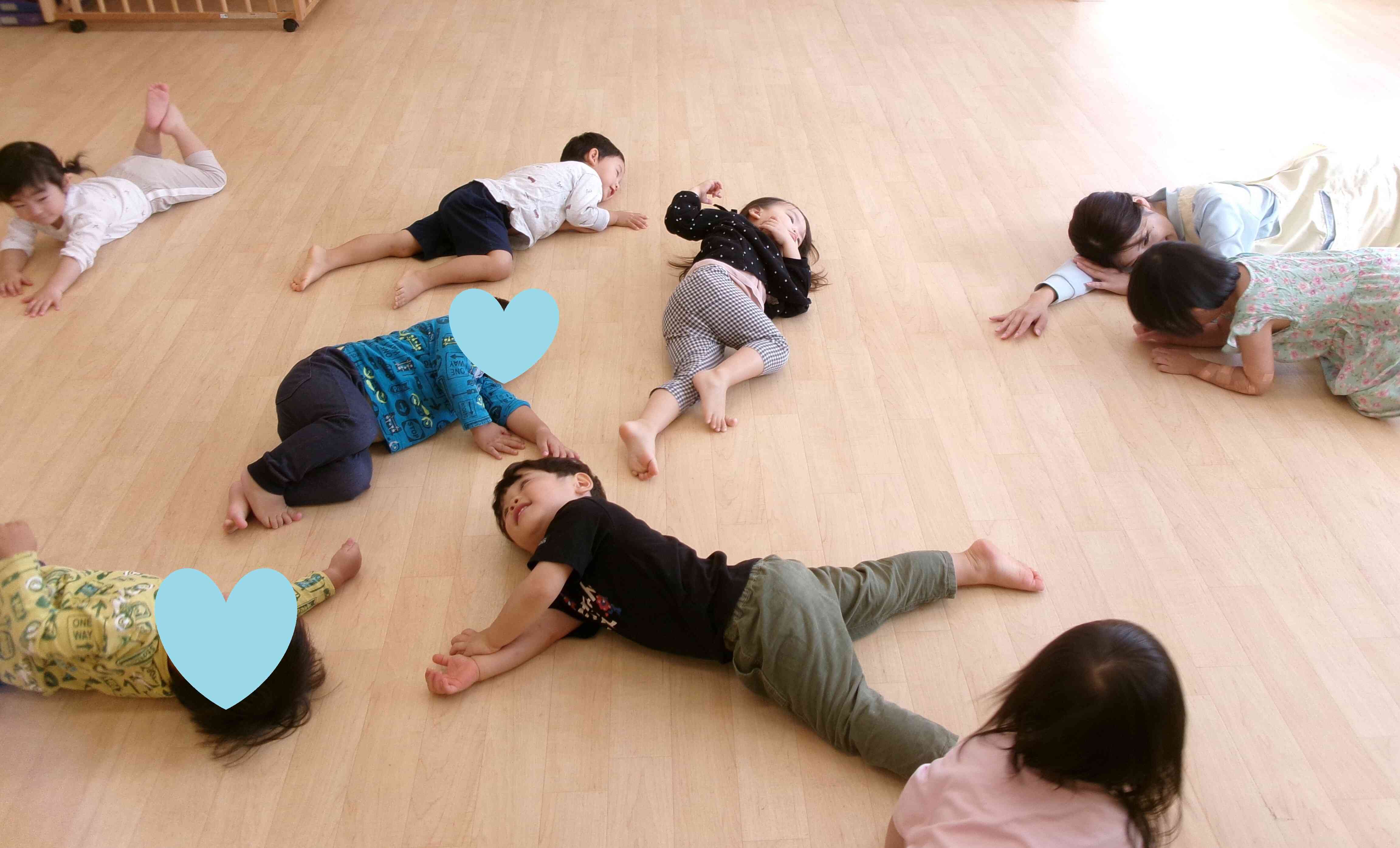 楽器を楽しんだ後は、先生のピアノの音に合わせてくまさんになったりジャンプしたりゴロゴロしてみたり。