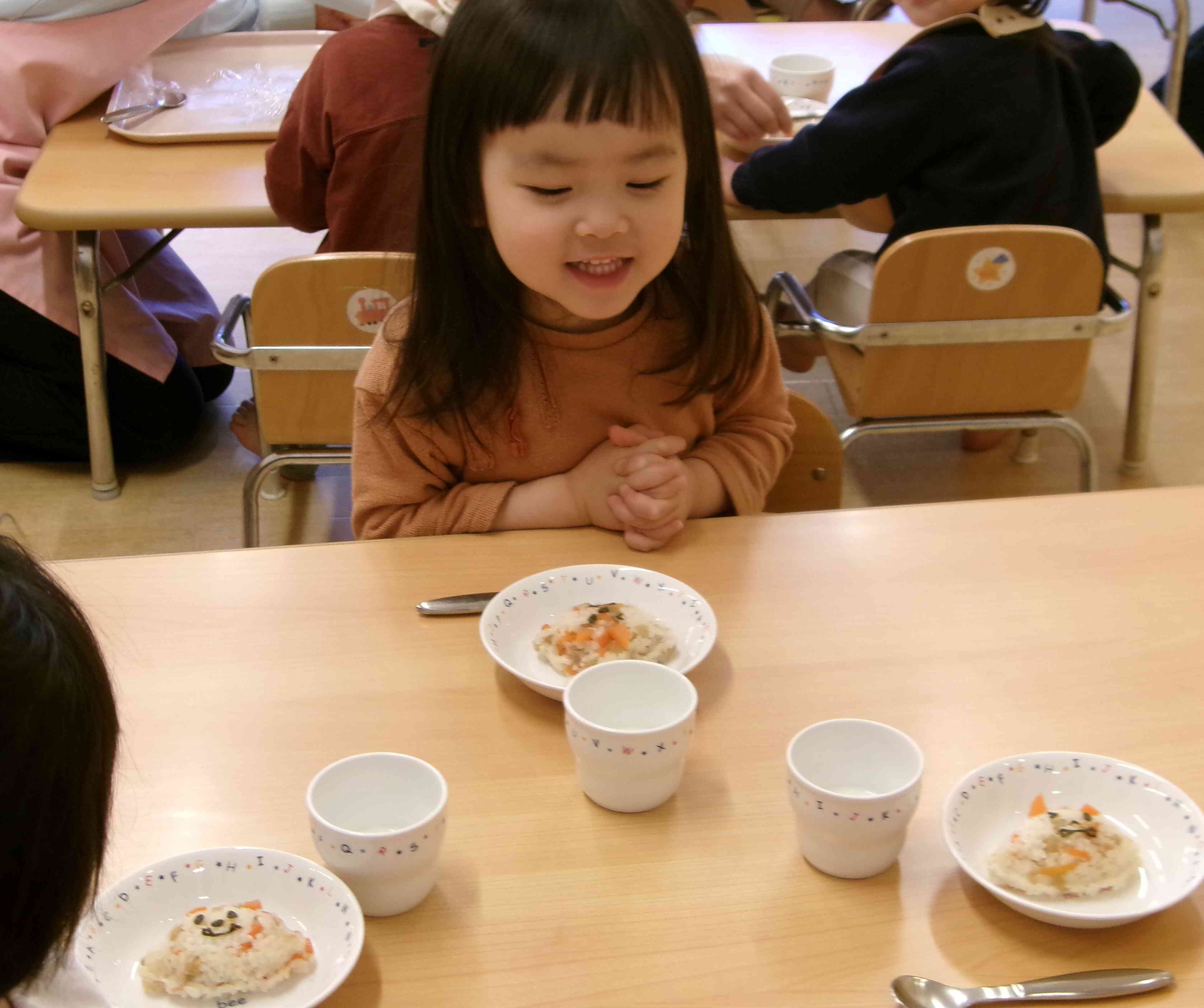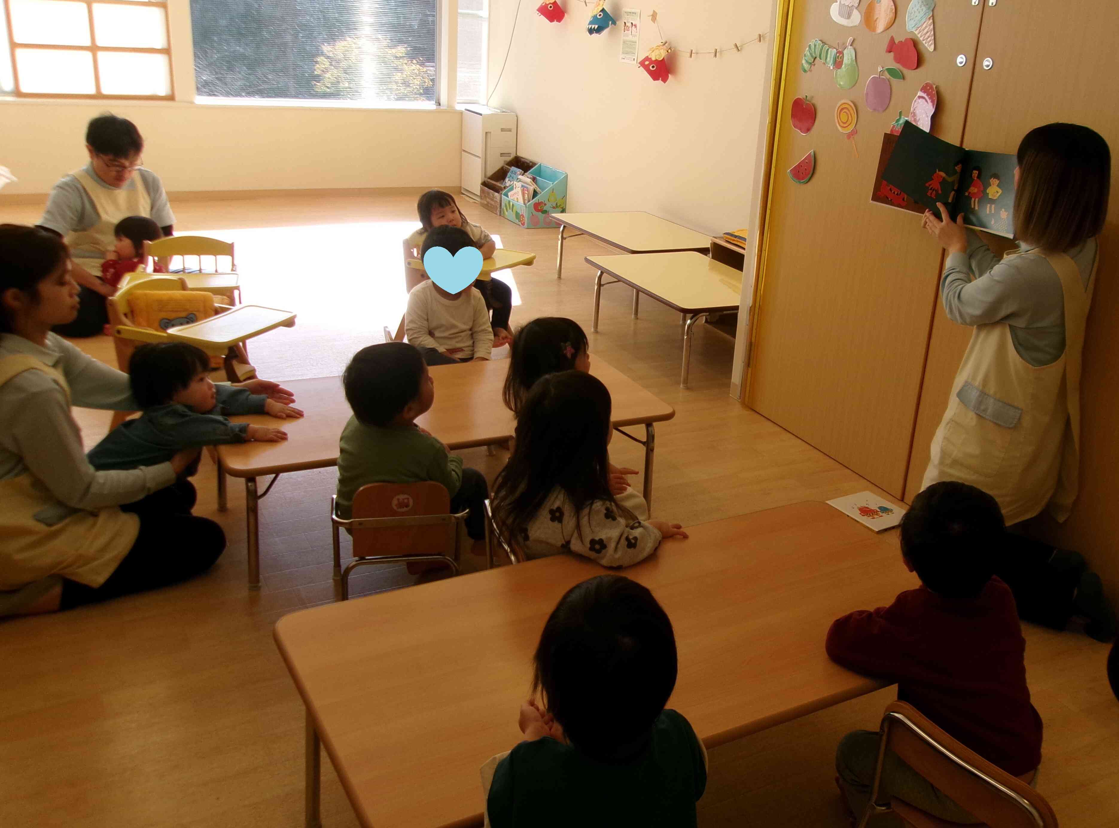 先生のお話や絵本の読み聞かせを興味深そうに聞き入るお友達。