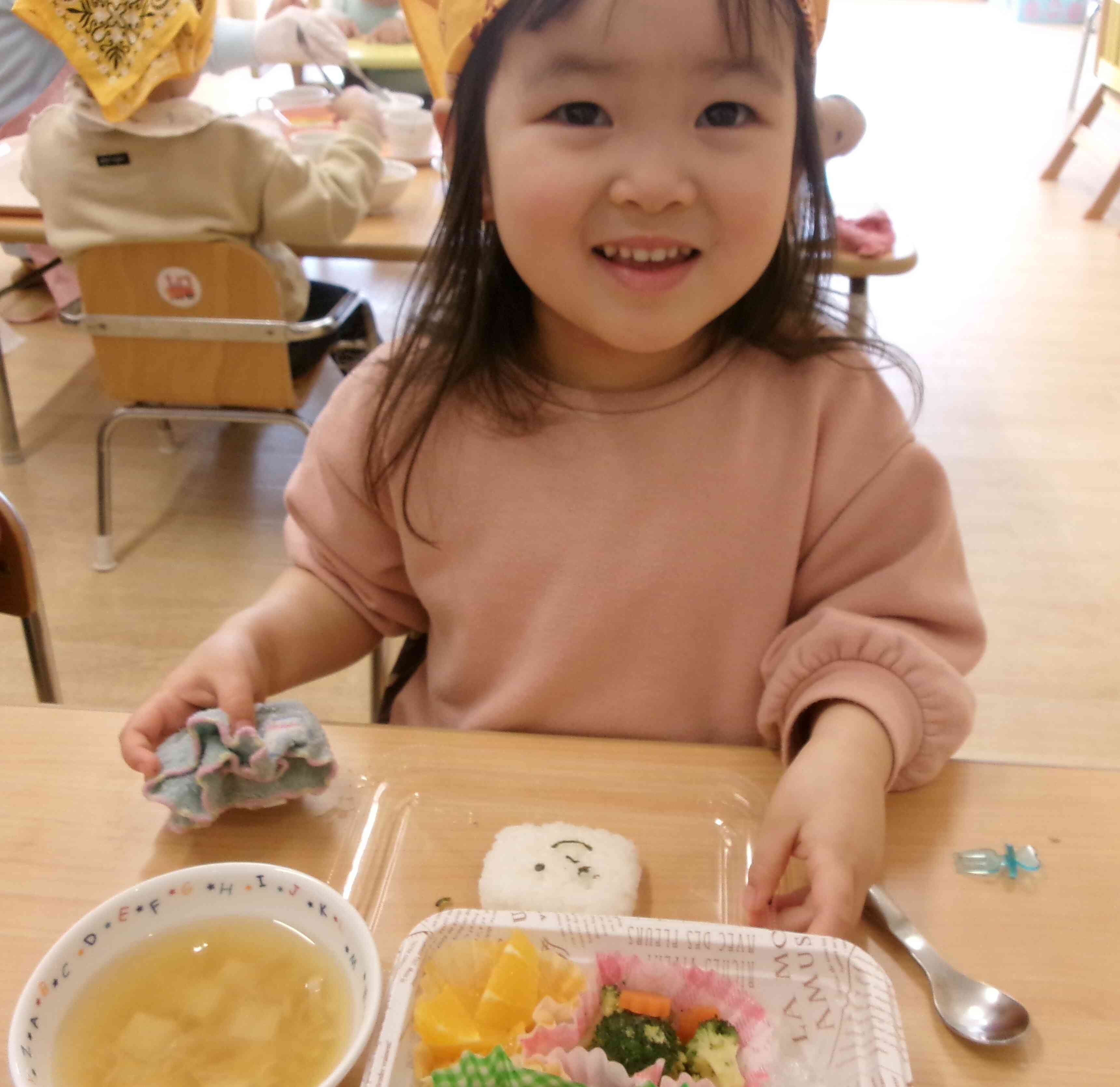 うさぎ組(2歳児)はラップに包まれたごはんを自分たちの