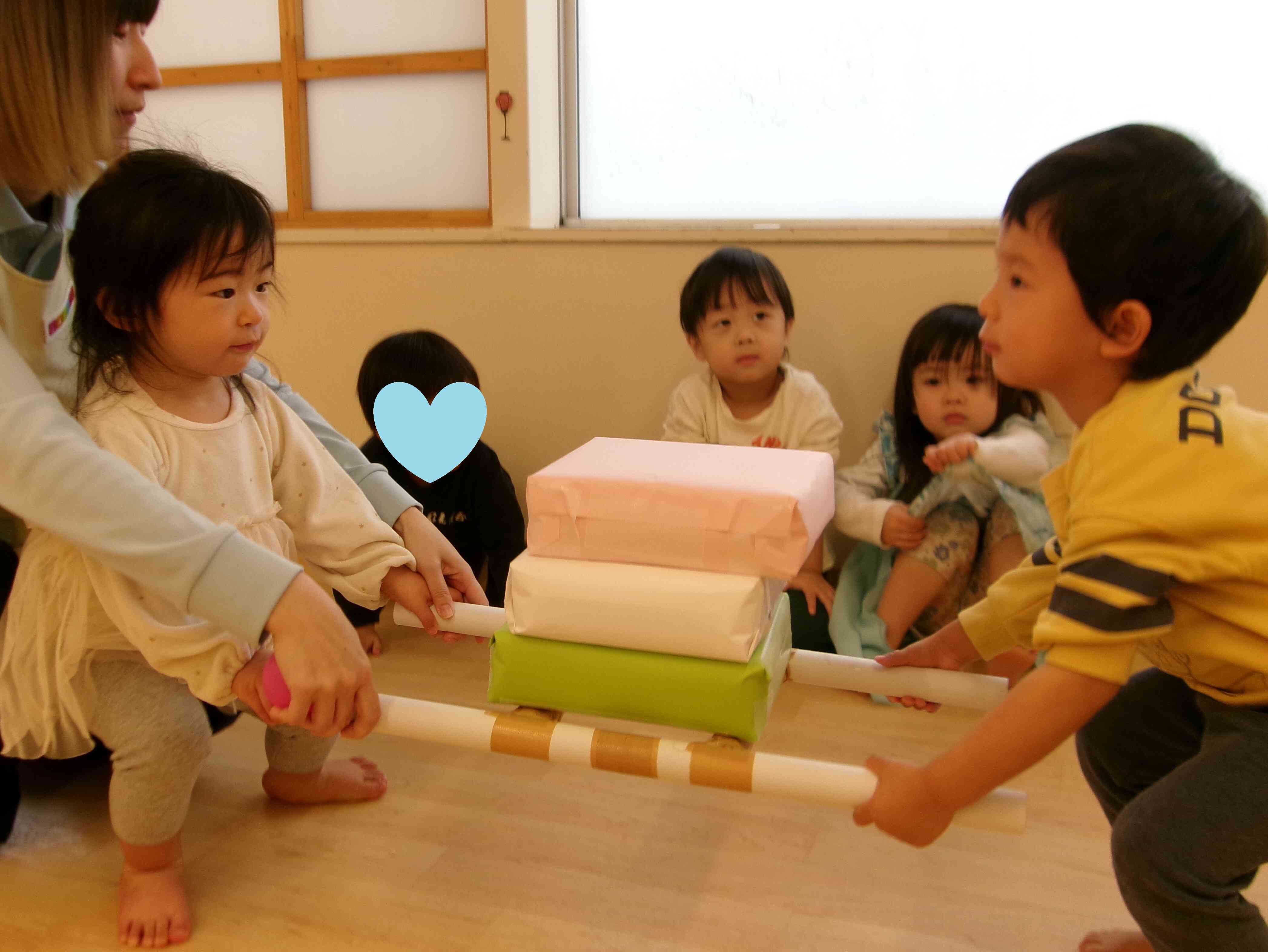 あひる組(1歳児)とうさぎ組(2歳児)はひしもち運びゲームとおひなさま探しゲームをしました。