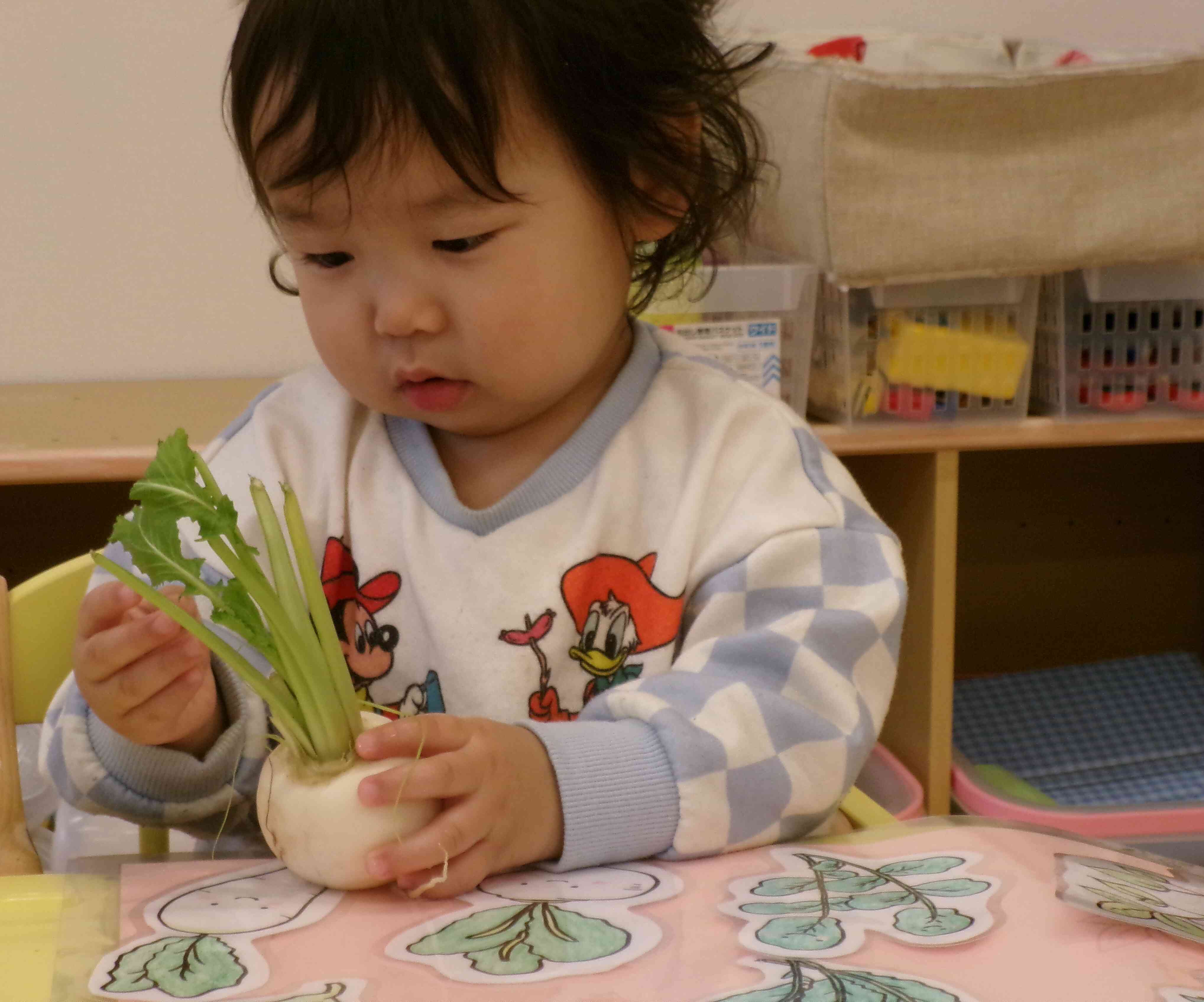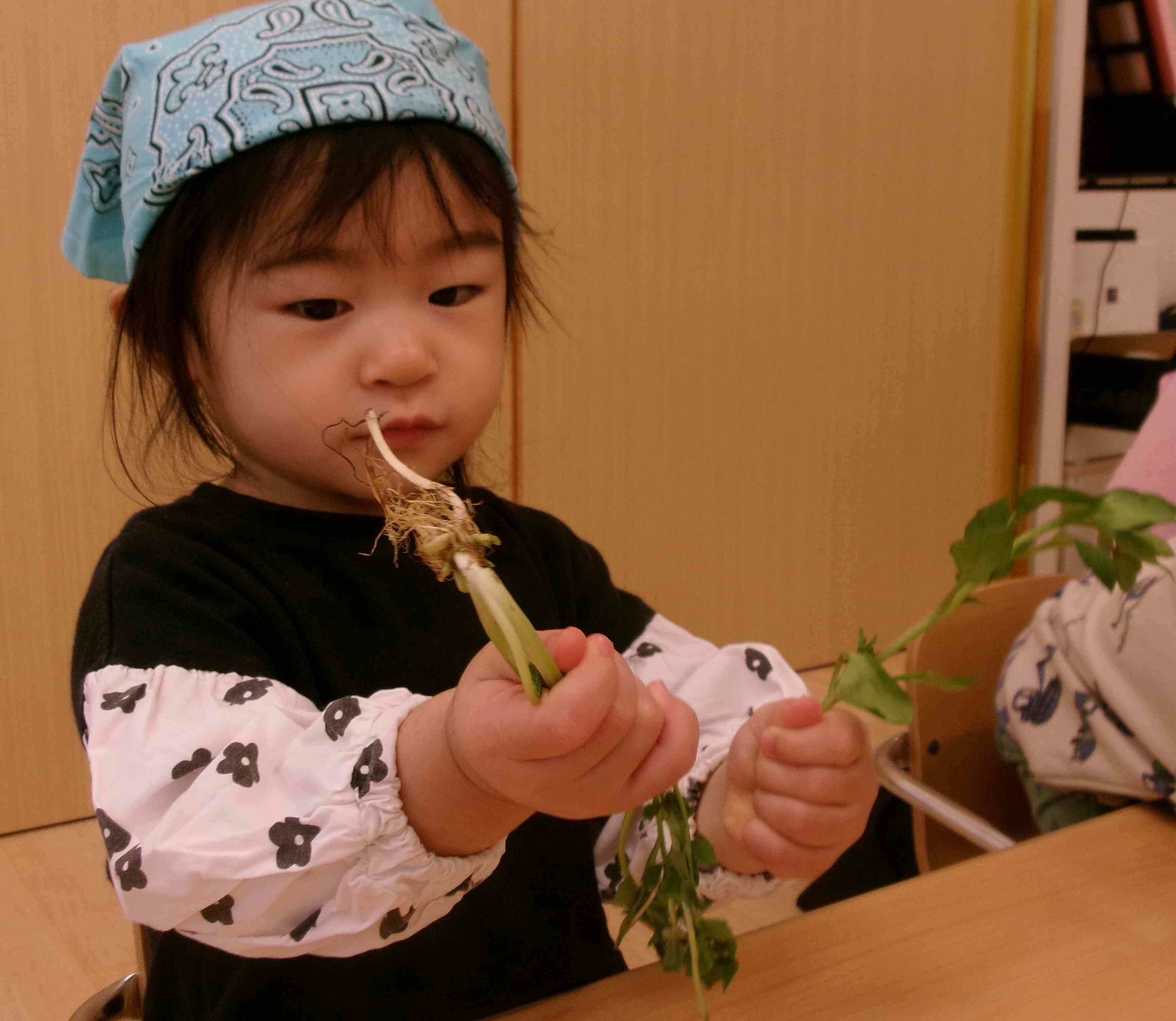 栄養士の先生のお話を聞いてから、実際に七草を触ってみました!
