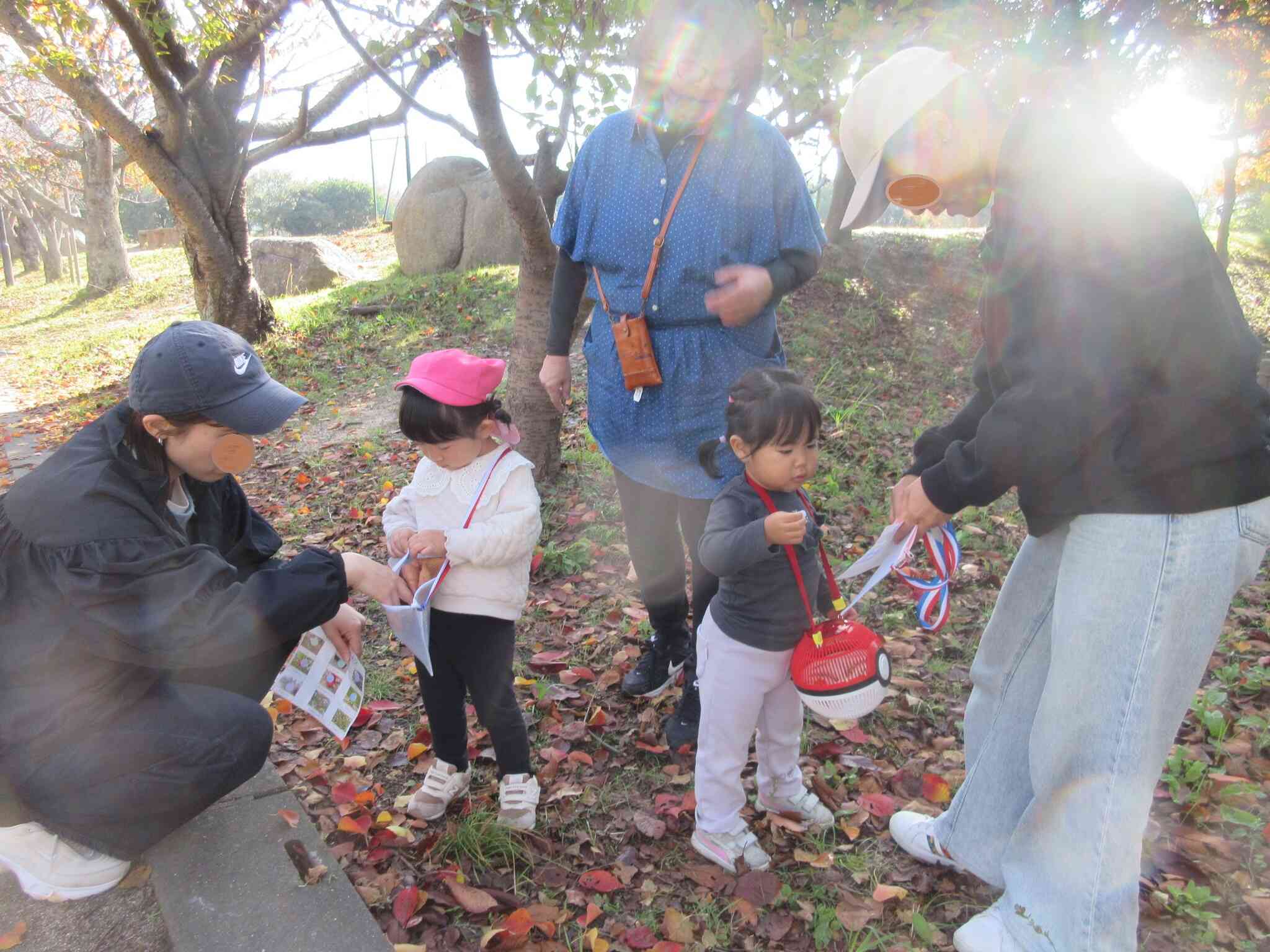 公園の植物探しゲームをして、どんぐりや松ぼっくりなど木の実や葉っぱを探しました。