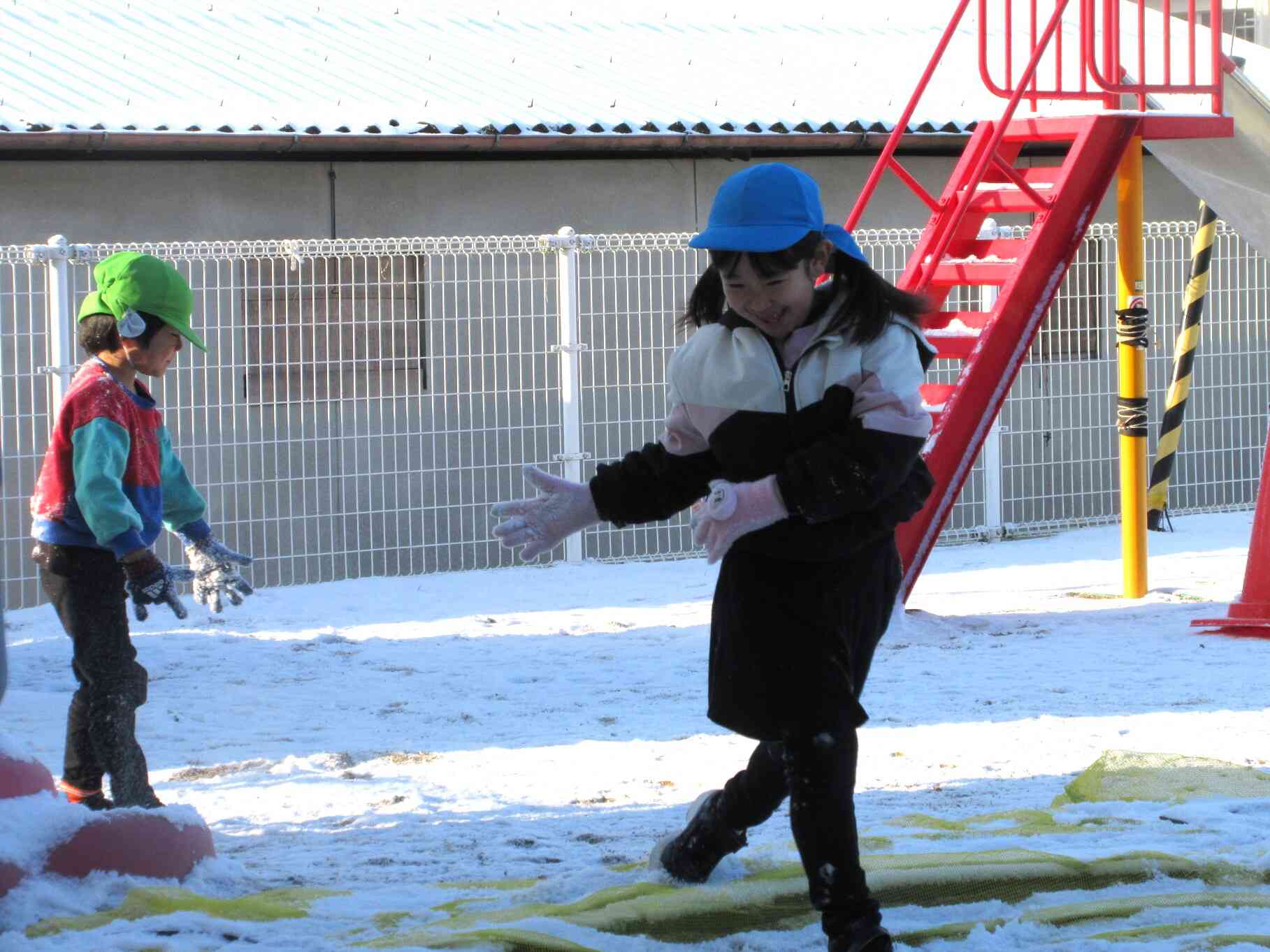 子ども達は真っ白い雪の絨毯が広がった園庭を見て、朝からうずうず。