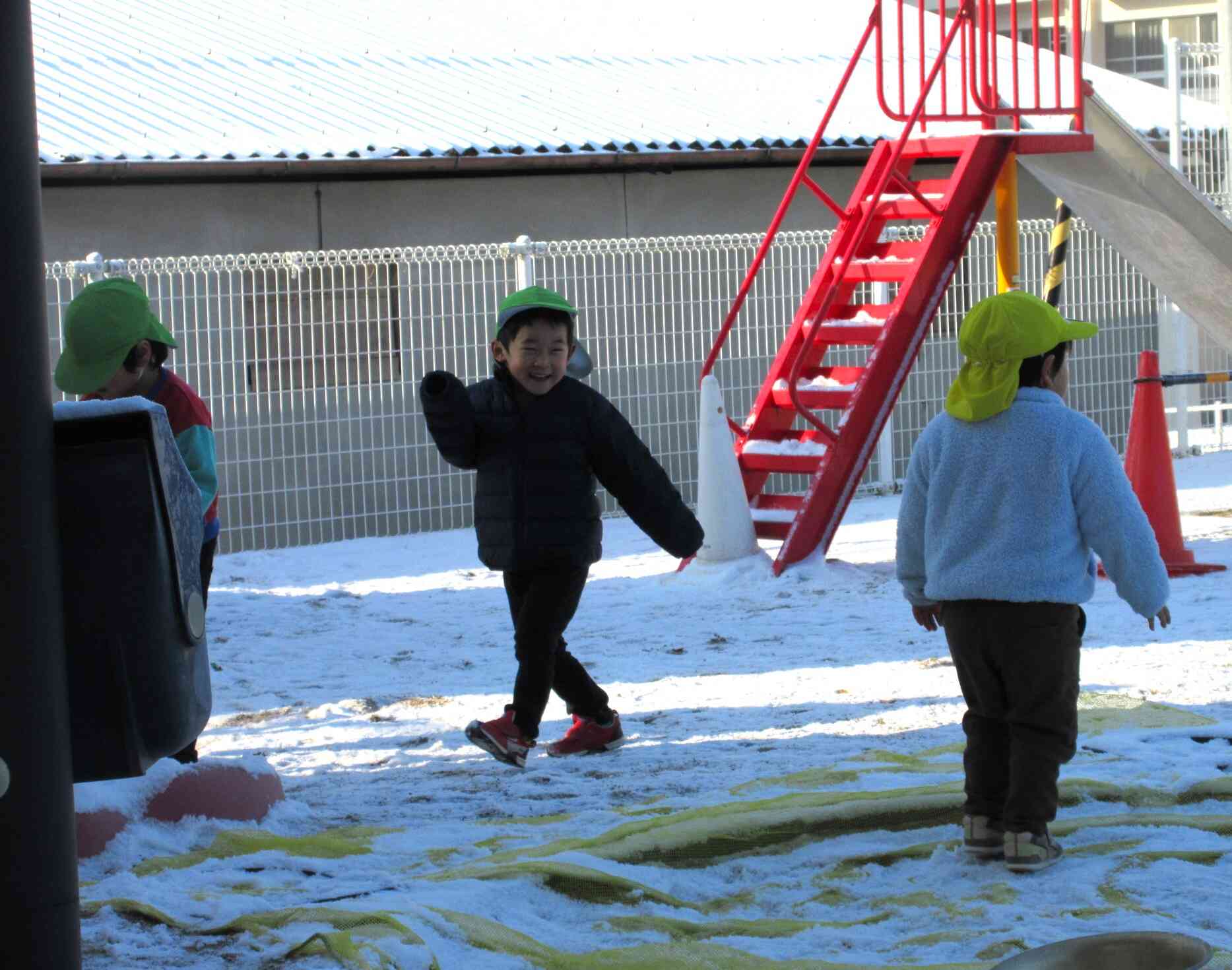 園庭に駆け出し、新雪に足跡を付け、サクサクという雪の音を楽しみます♪