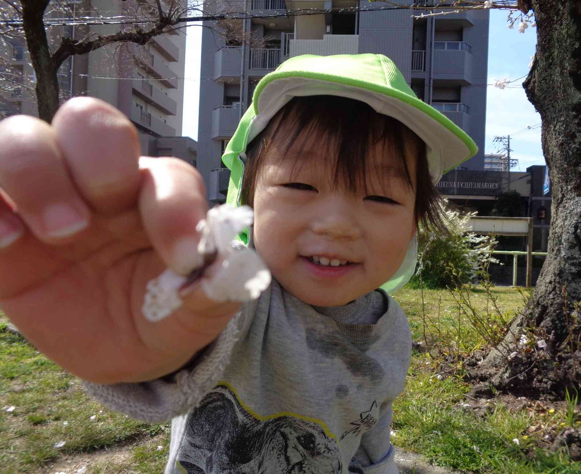 桜の木の近くで朝おやつを食べました♪