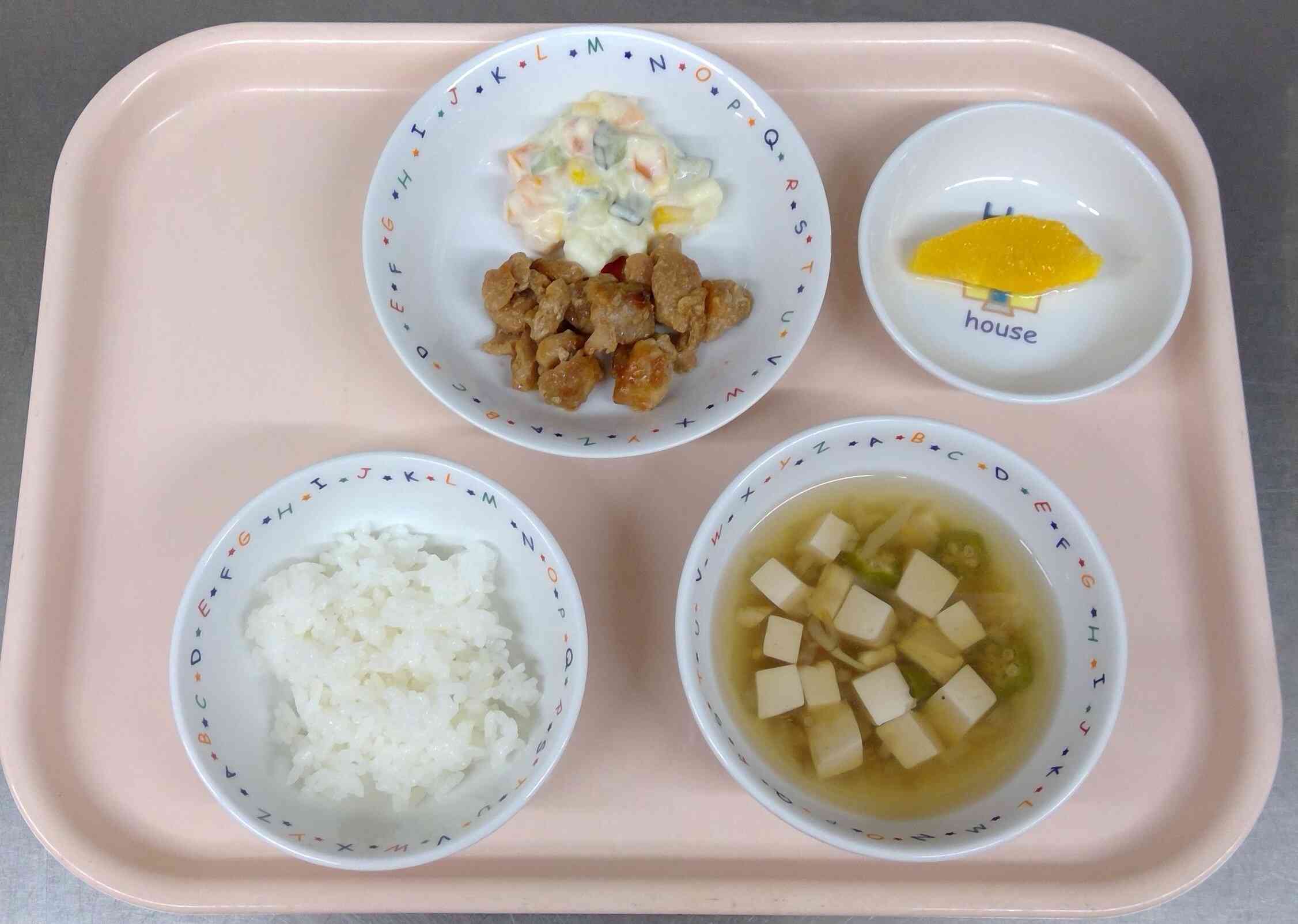 ご飯 さつまいものおみそ汁 チキン南蛮 しらすサラダ オレンジ