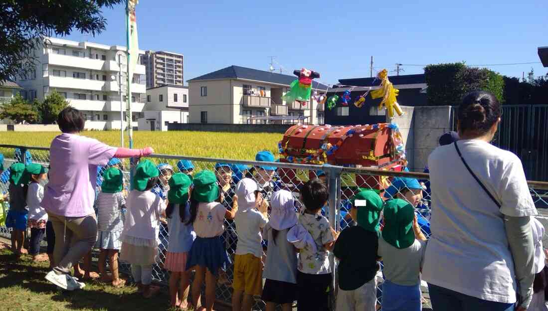 中学生のお兄さんお姉さんたちの勇ましい掛け声と共に、金色の大きな大きなお神輿が園庭に入ってきました。