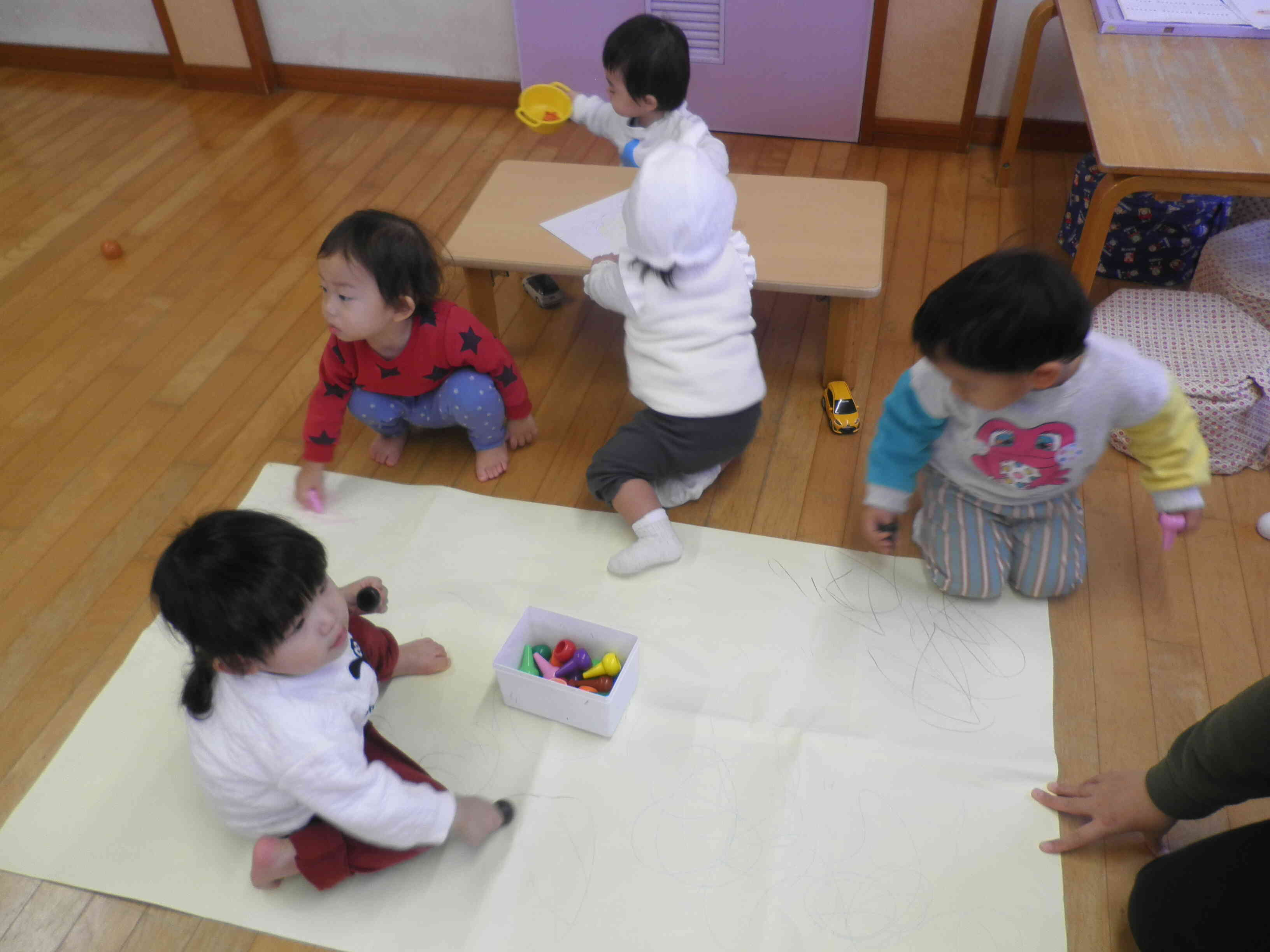お母さんたちがペンを持って作業をしていて、子どもたちも何か描きたい様子だったので大きな紙にみんなでお絵描きを楽しみました♪