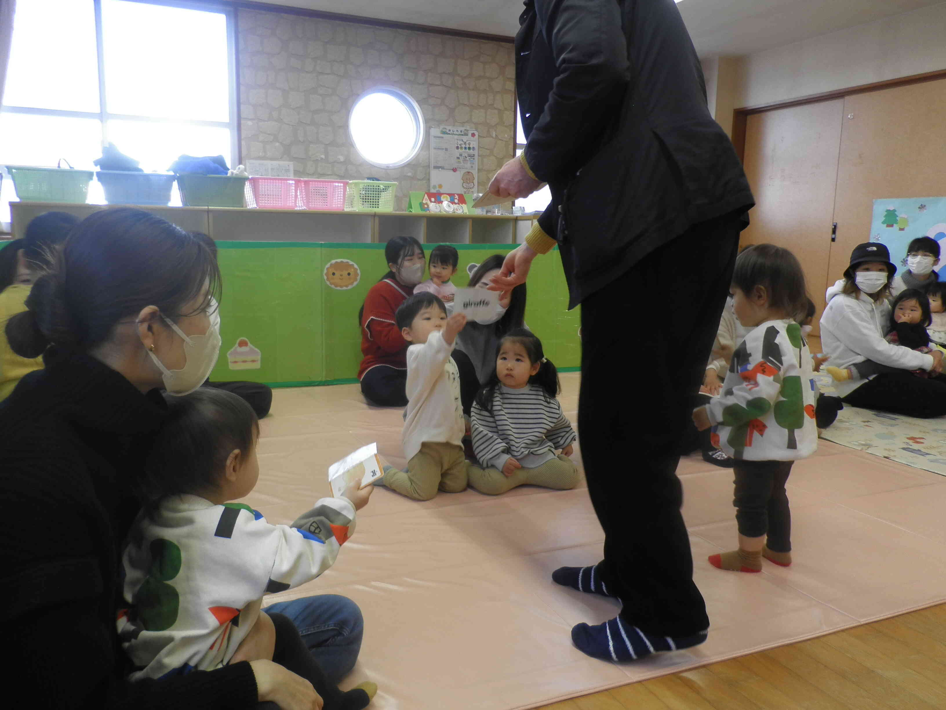 ギター演奏でのABCソングやカードを使った動物や色の単語を学んでいきました。