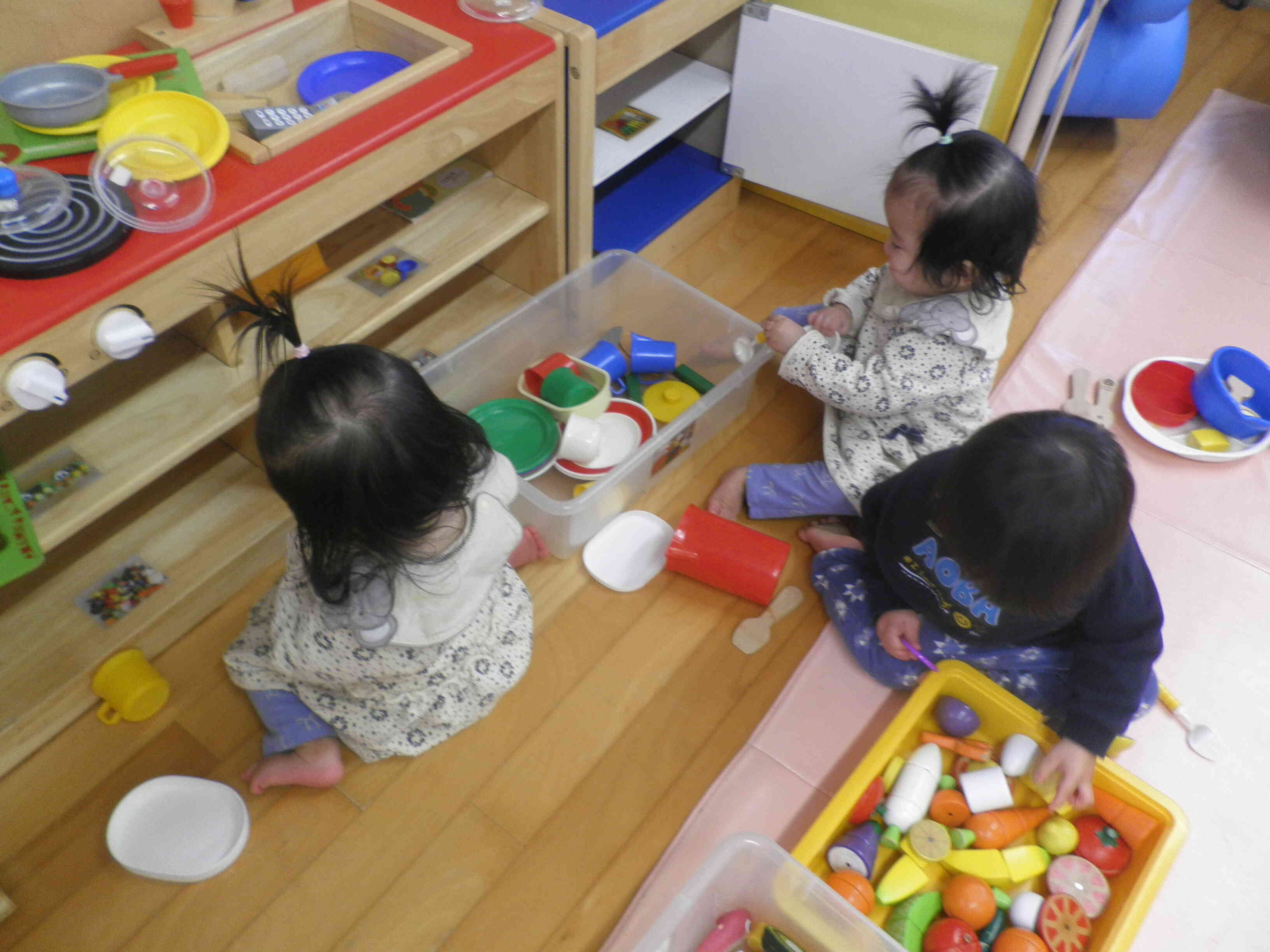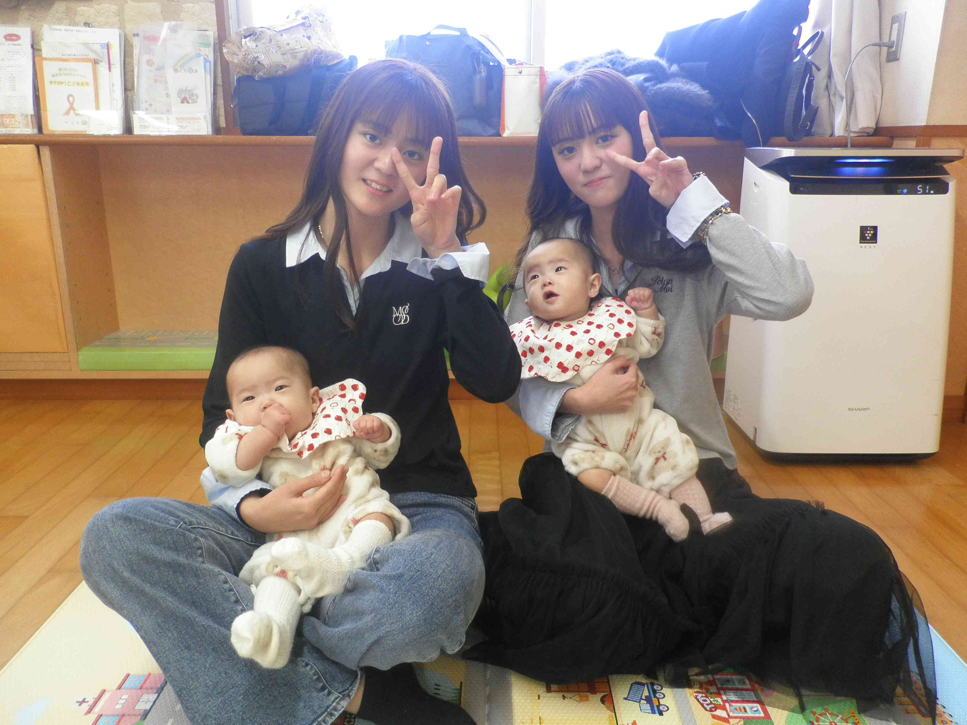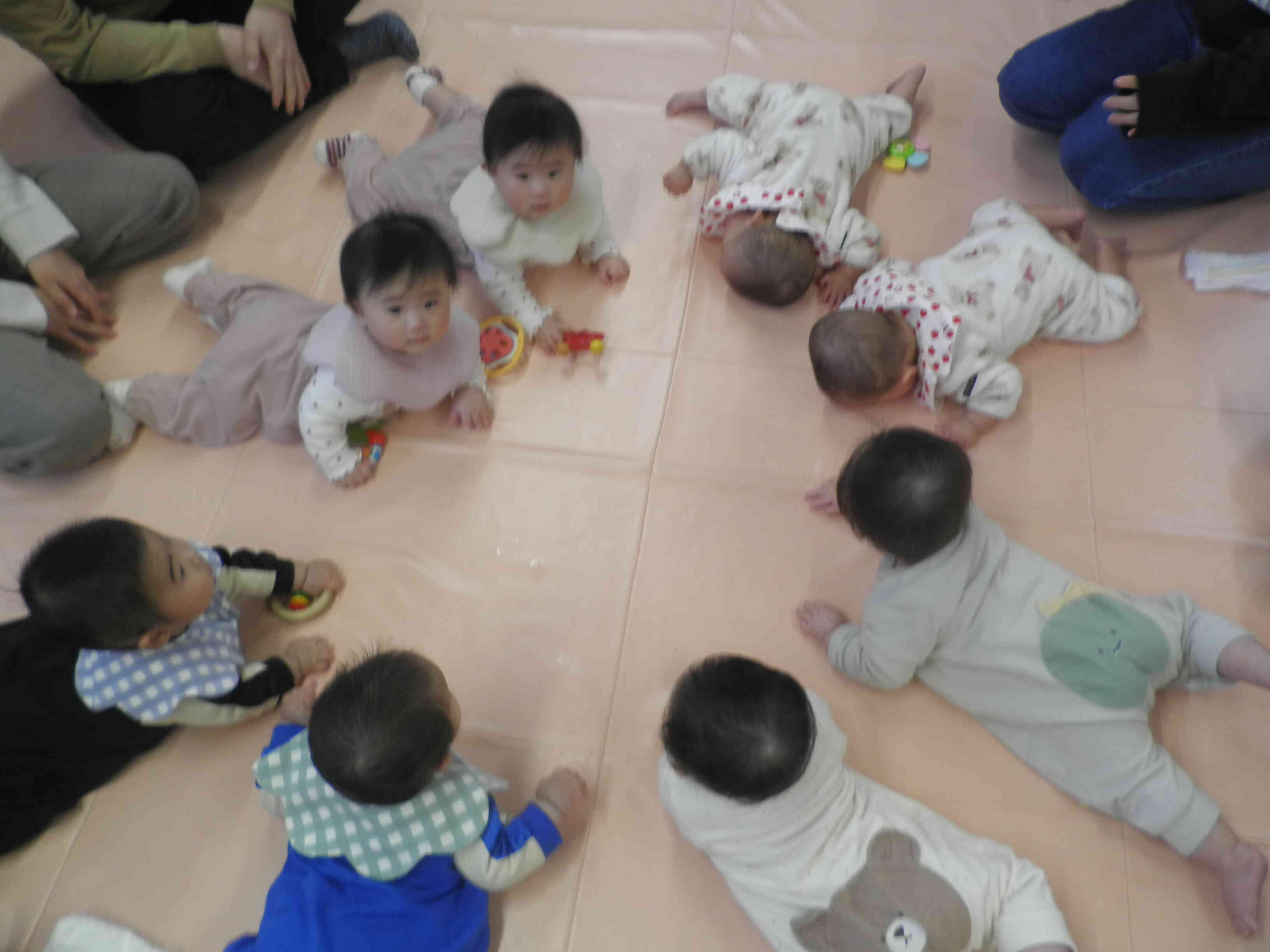 6、7か月の双子ちゃんが4組遊びに来ていたので、みんなで輪になって遊んでいる姿がとっても可愛かったです♡