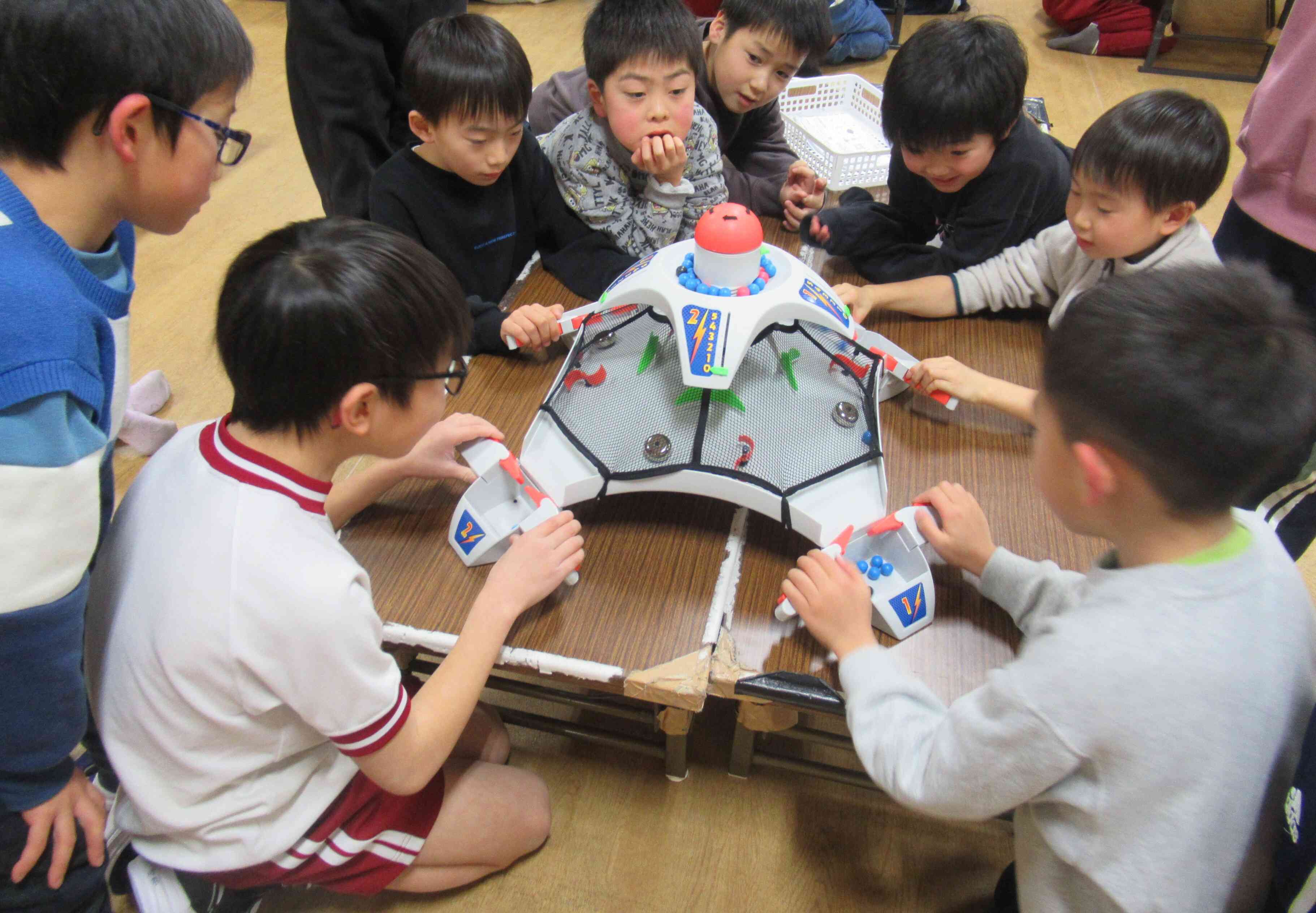 アメリカンバトルドームに熱中する子どもたち。自分のエリアにボールが入ってこないよう必死に弾き返します。