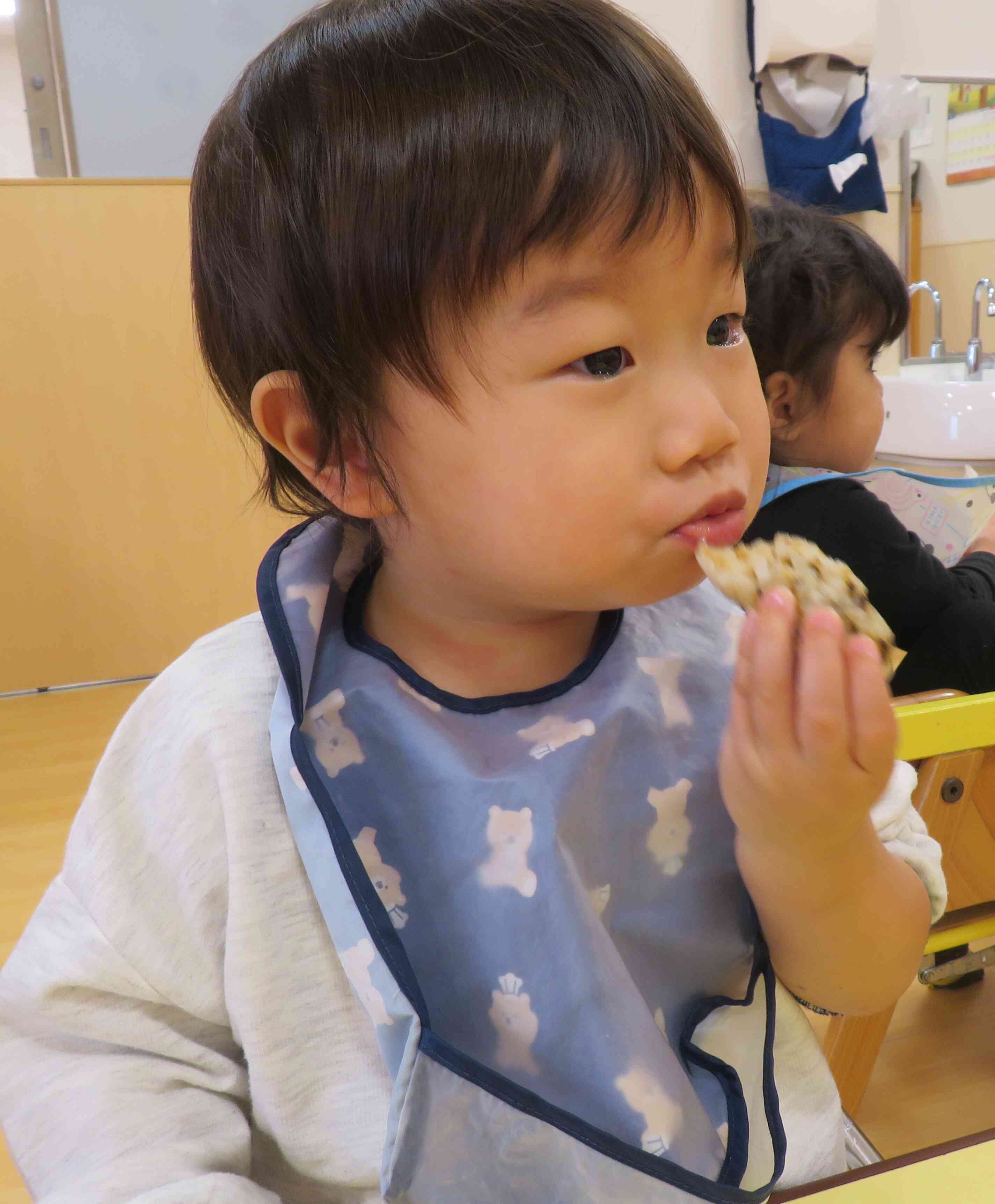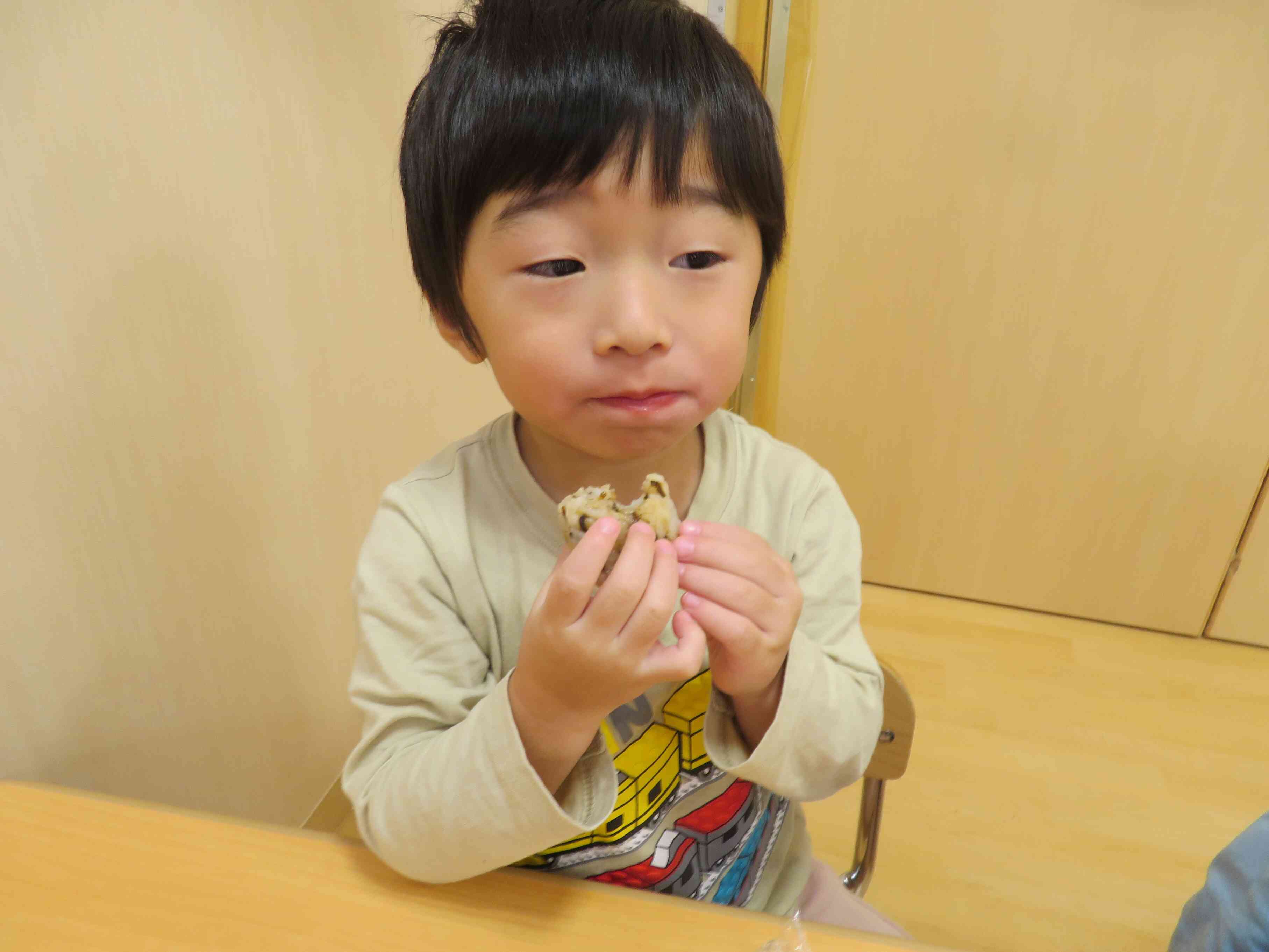 作ったおにぎりをお口いっぱいにほおばるお友だち☆