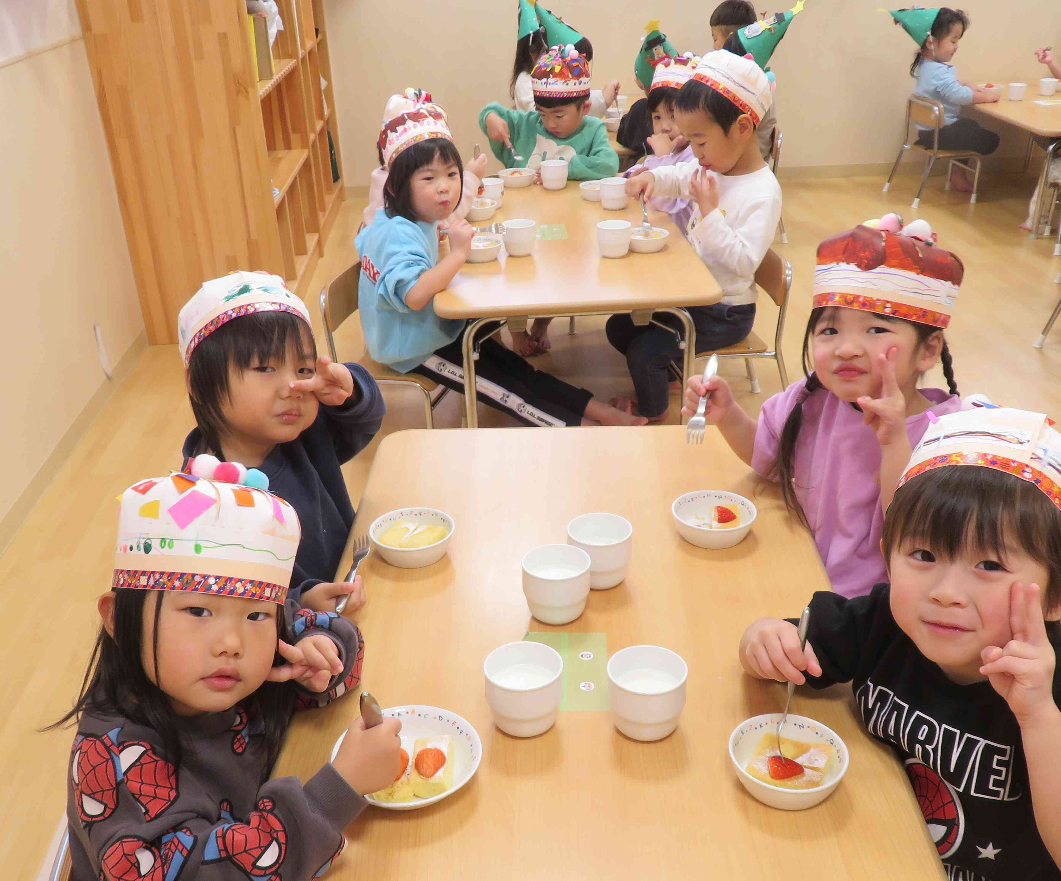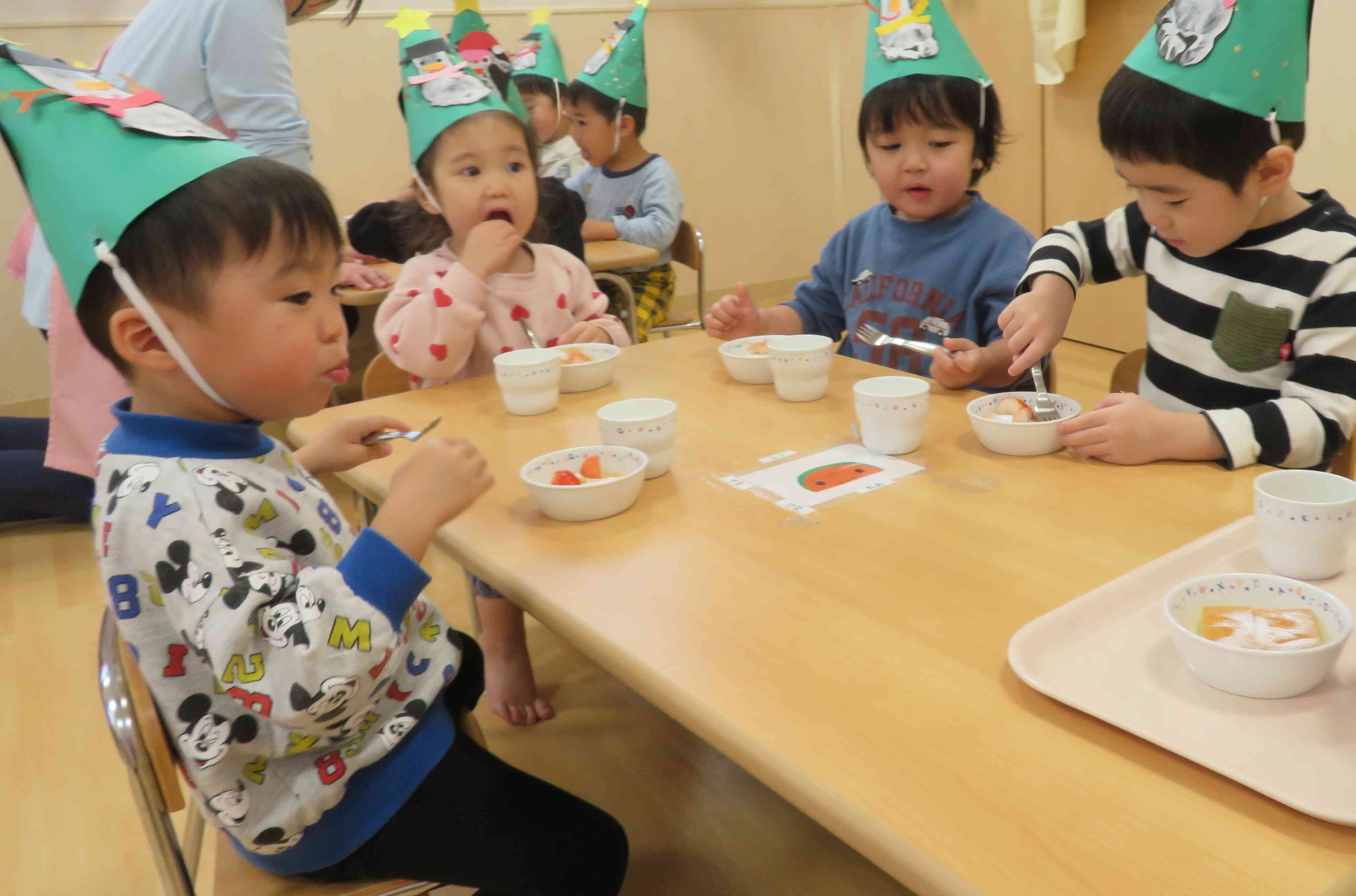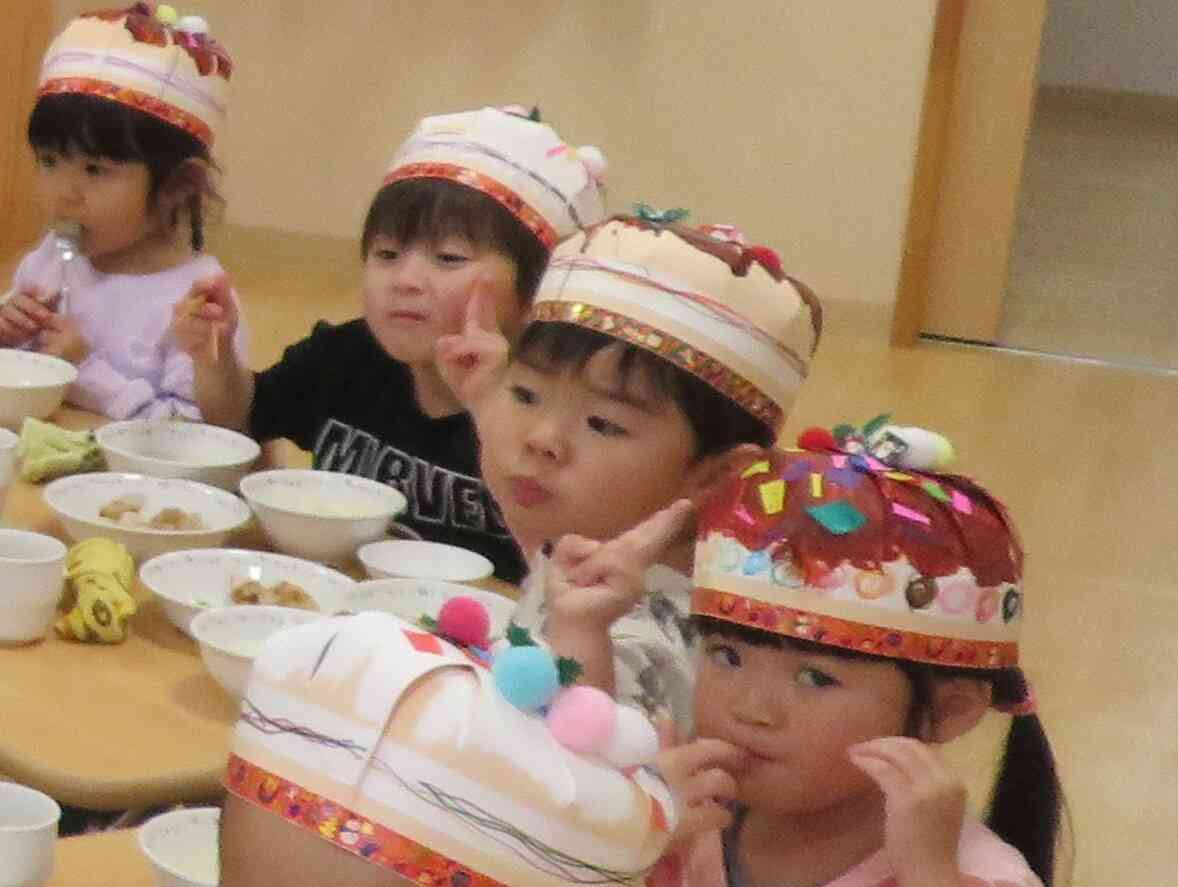 おいしそうな帽子をかぶって、みんなでおいしく給食を食べました(^O^)