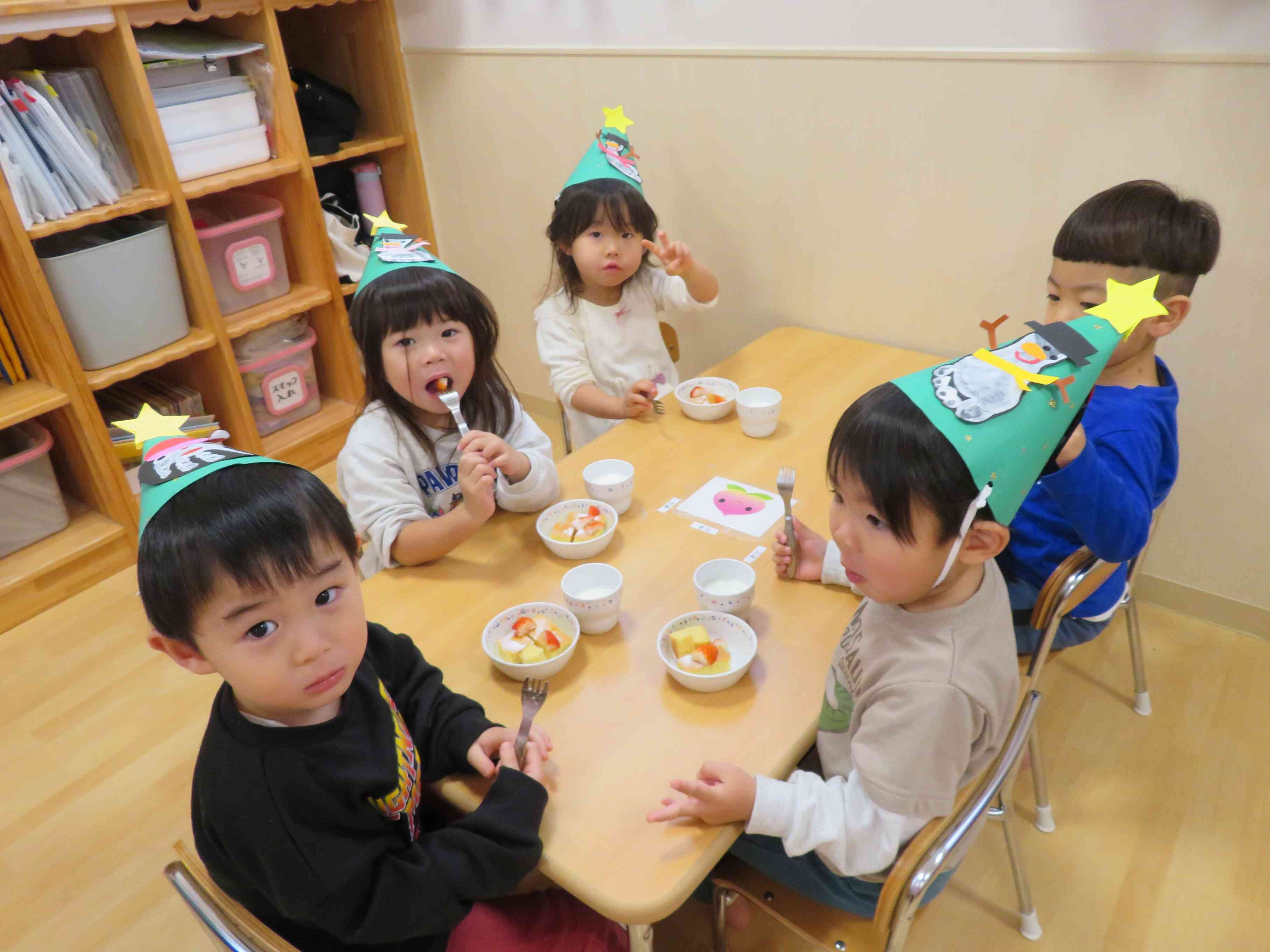 りす組さんとうさぎ組さんで一緒におやつを食べました。