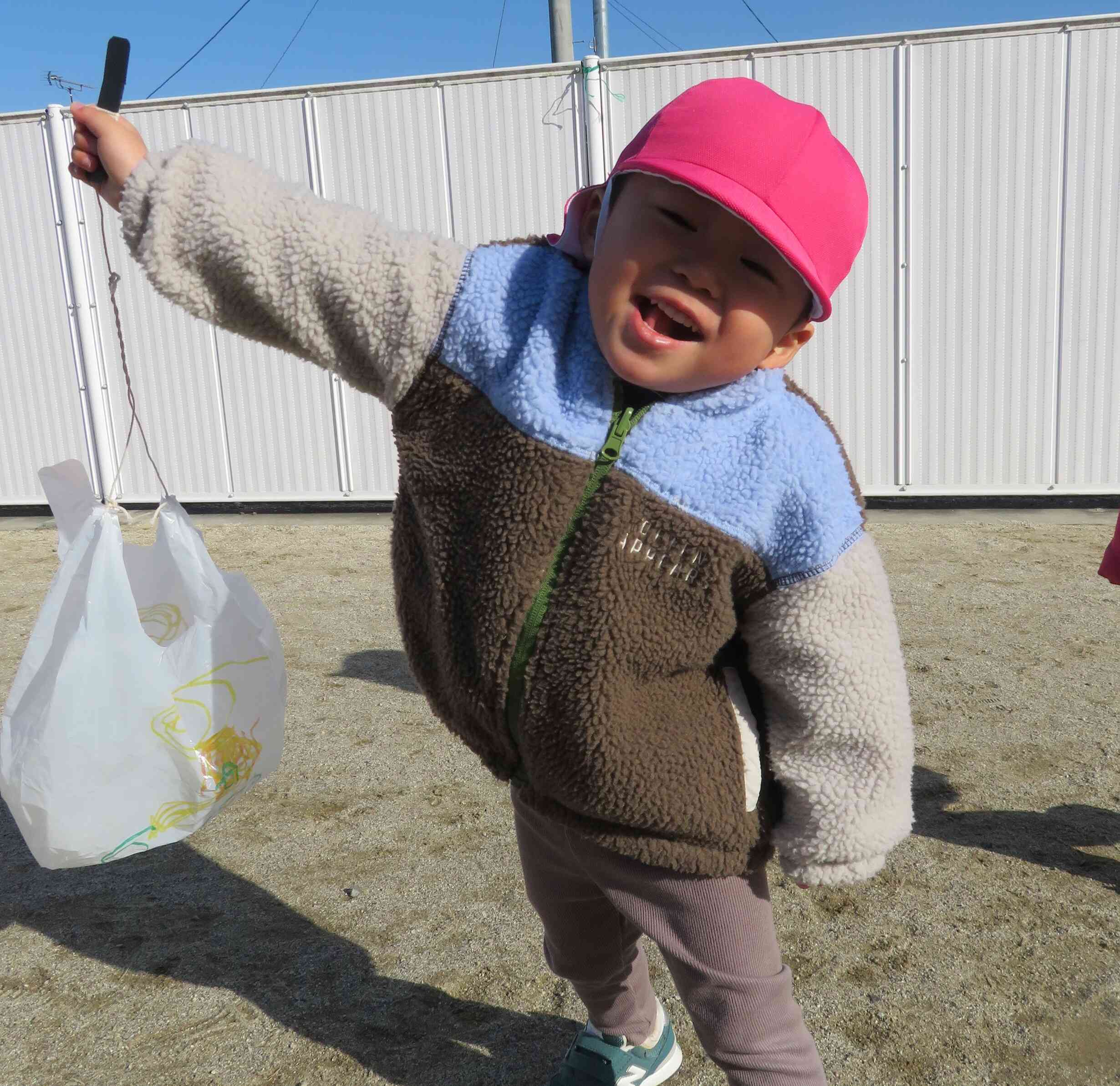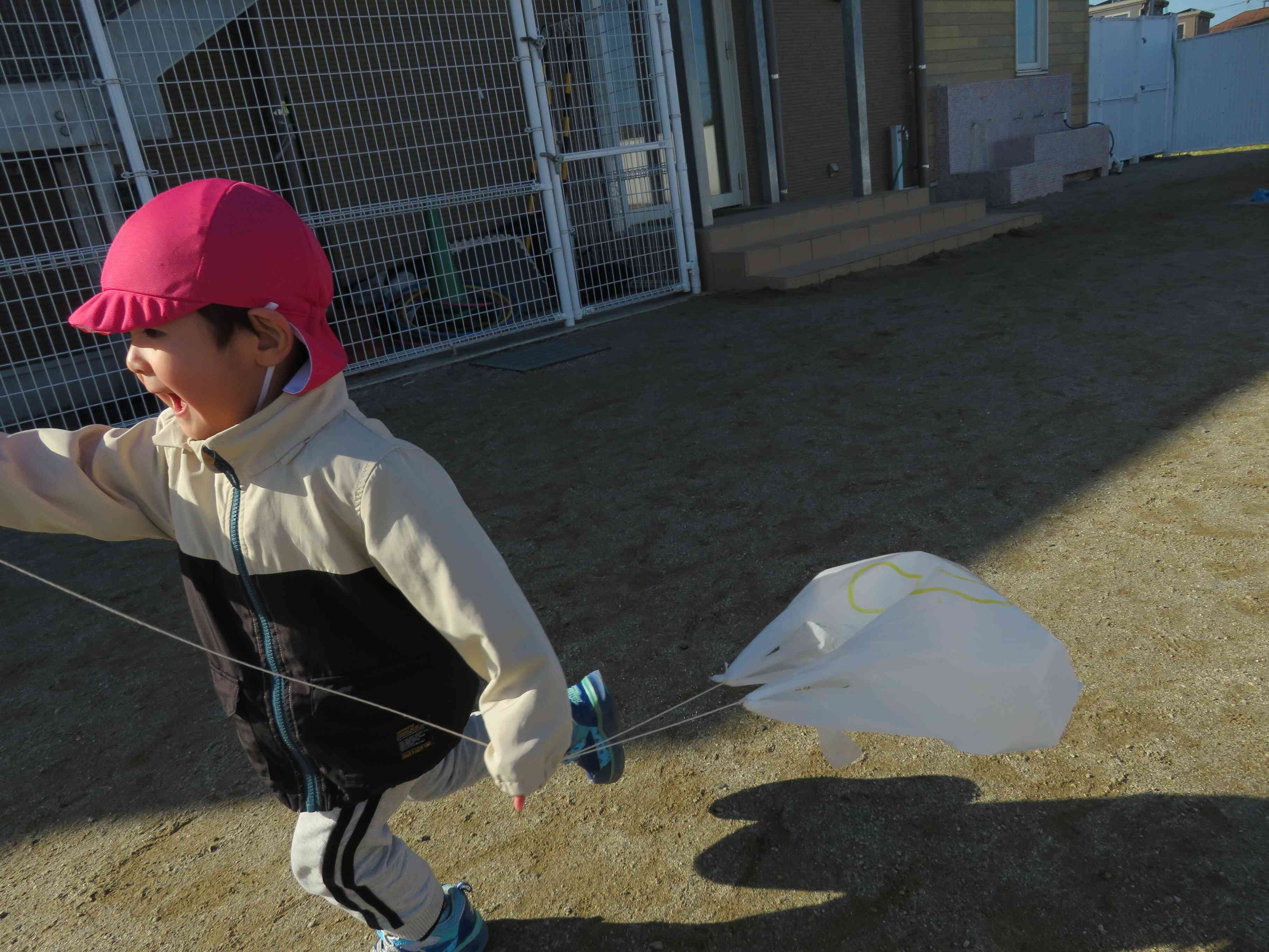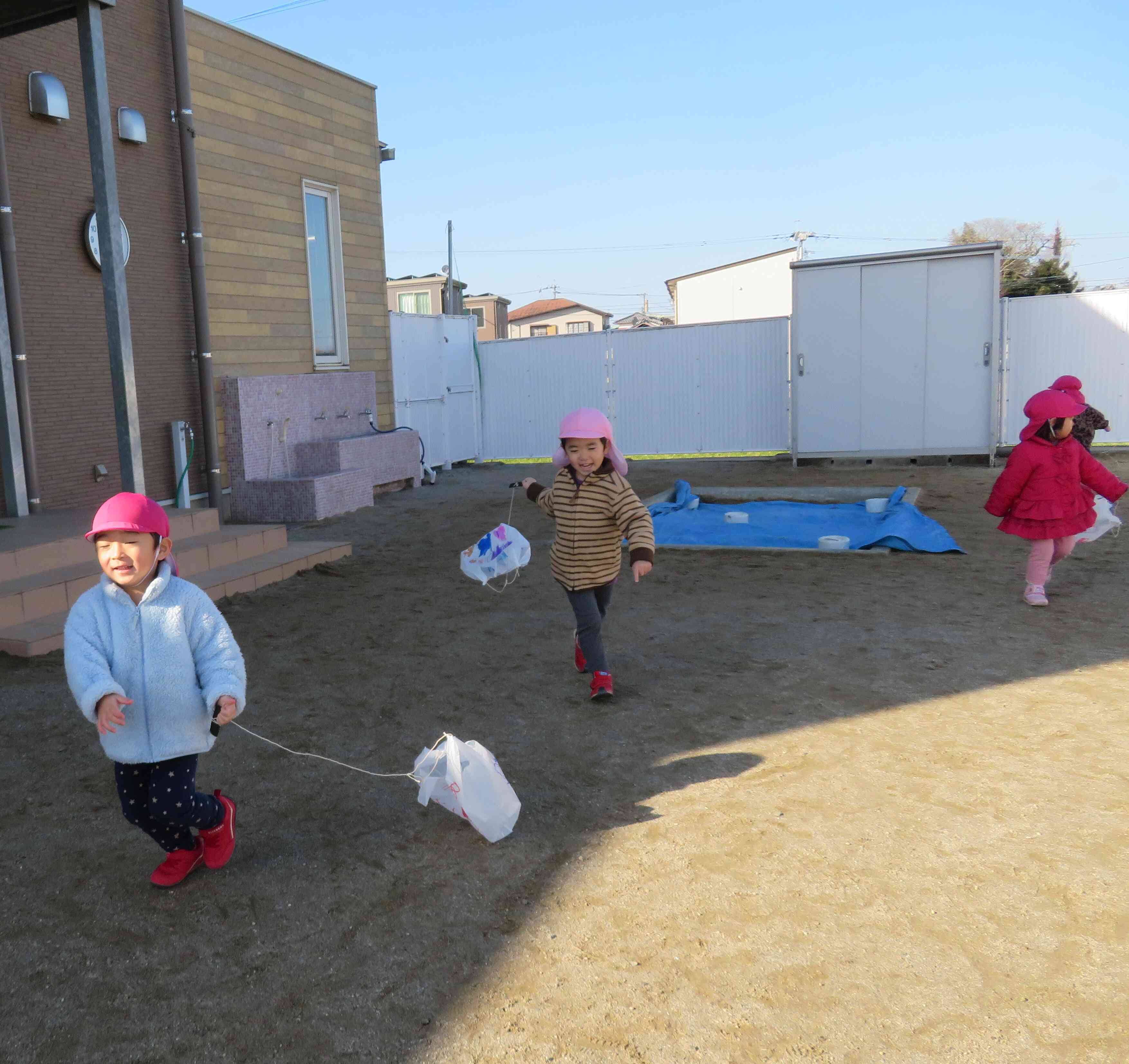 青空が広がり、とっても良いお天気のこの日、「凧あげをしよう!」と園庭に出たうさぎ組の子どもたち。