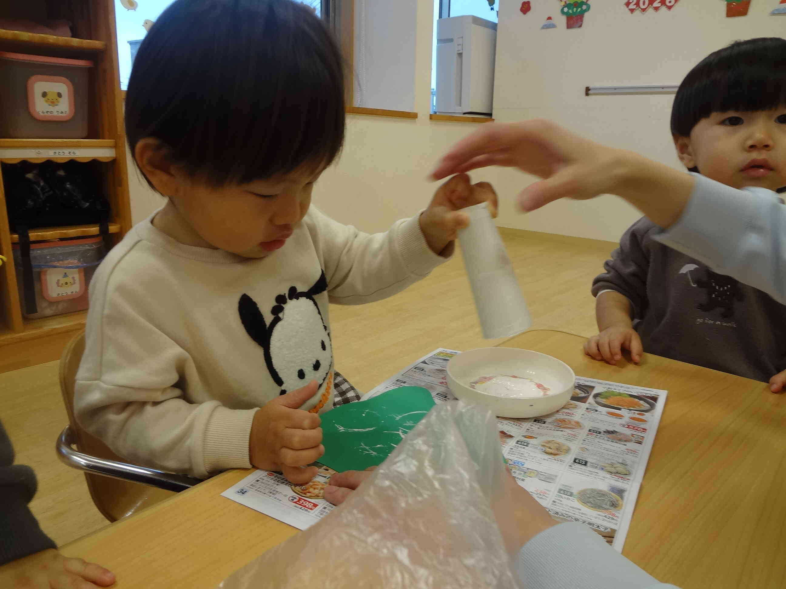 お手本を見ながら小さな手で一生懸命シールを貼る姿がとっても可愛いですね^^