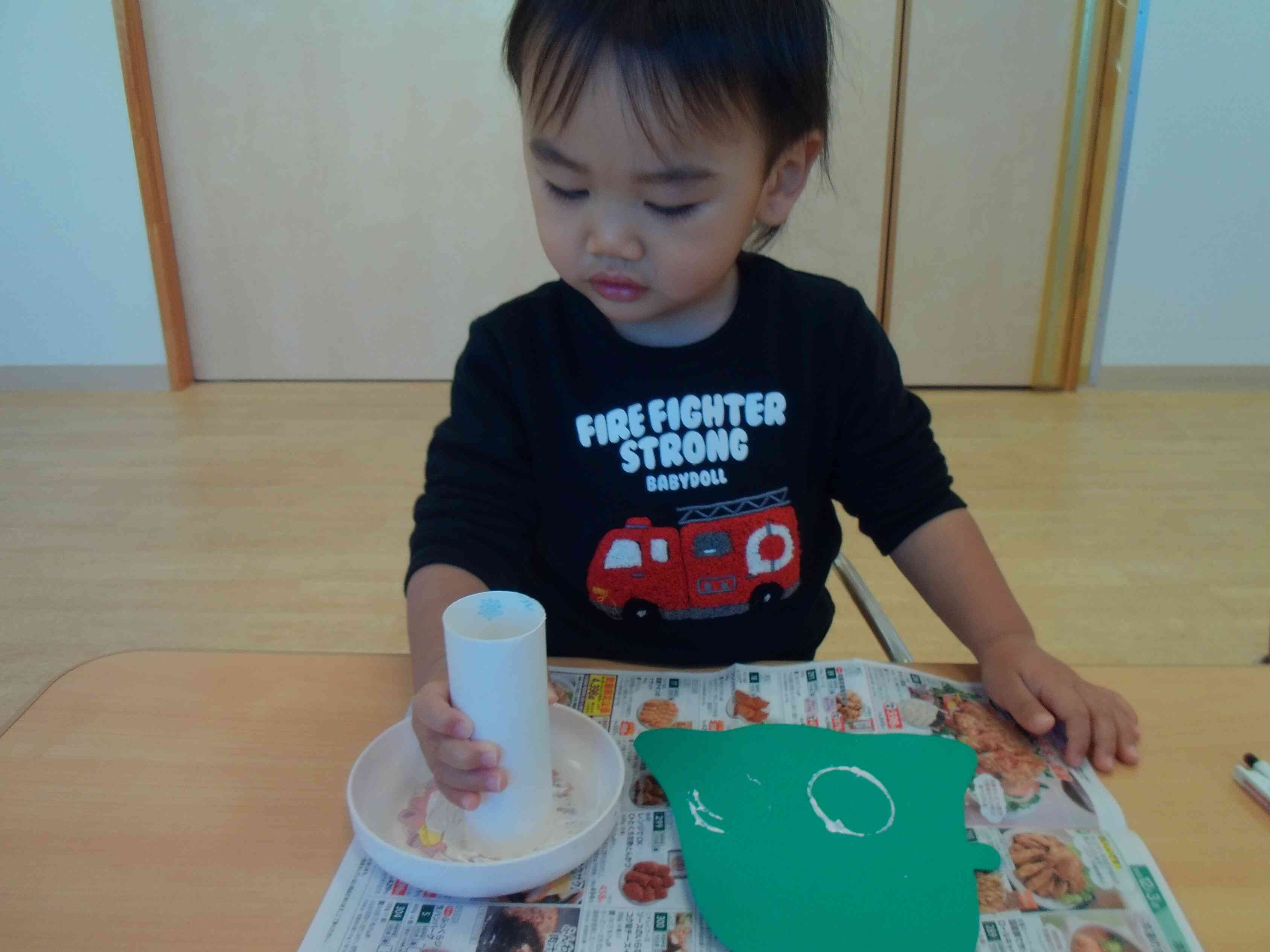 あひる組さんは緑の画用紙に、トイレットペーパーの芯を使ってスタンプしました!