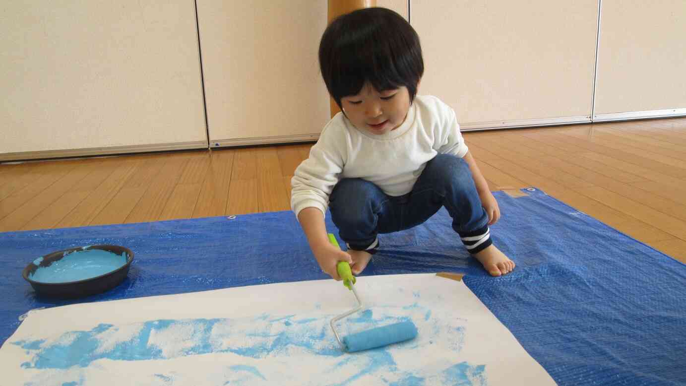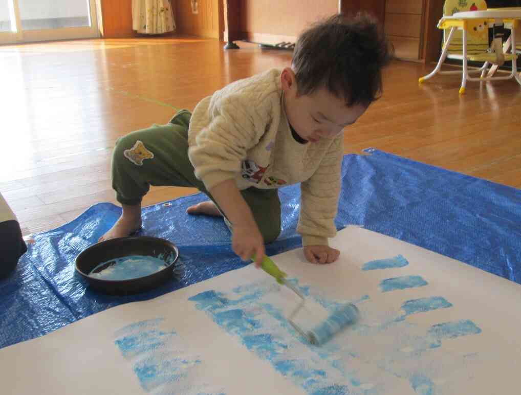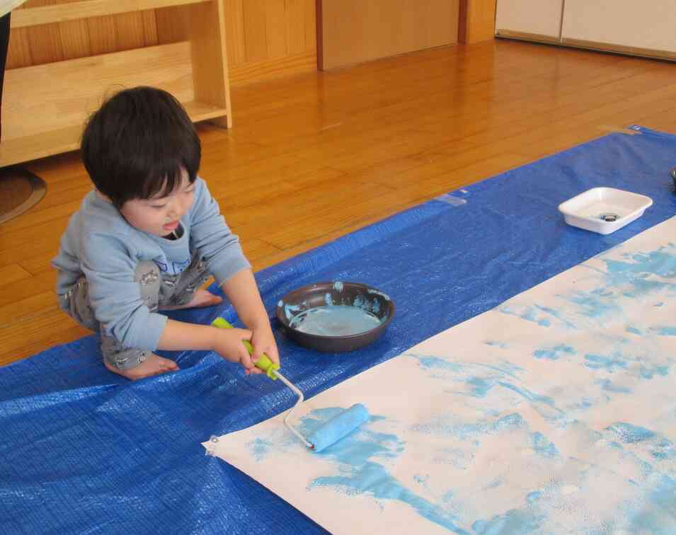 大きな模造紙にローラーを使って絵の具を塗りました。