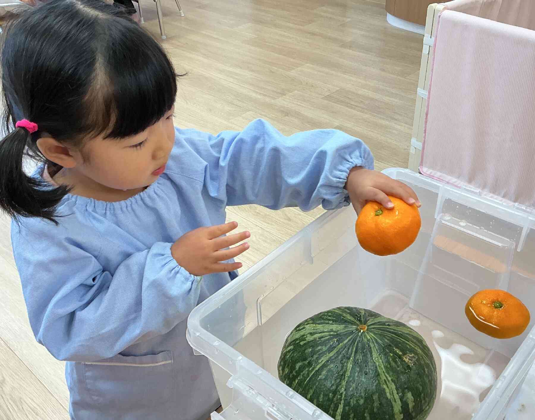 水槽に野菜・果物をいれてみました。水しぶきや浮き沈みする野菜をみて面白そうでした。真剣に様子を観察しています。