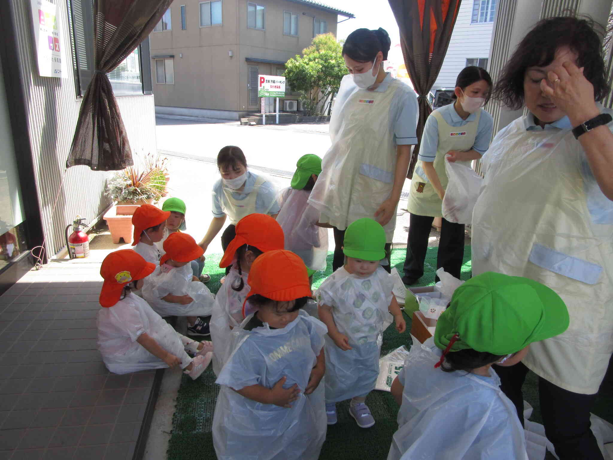 ビニール袋を着るのが初めてだっだので、戸惑う子や嫌がる子もいましたが、周りが着ていくとちゃんと着る事が出来ていましたよ。