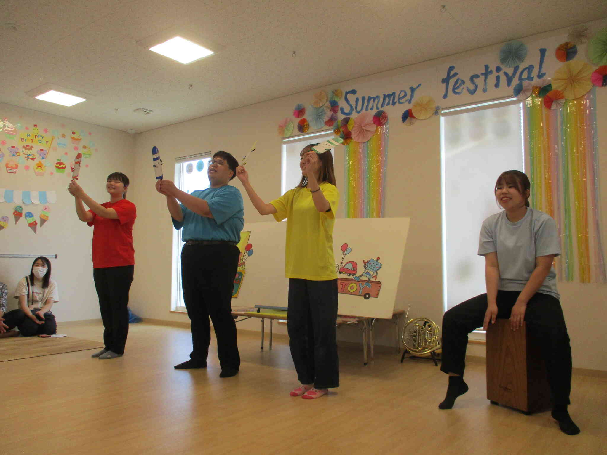 子どもたちの知っている曲を、鍵盤ハーモニカやホルン、カホン、ピアノなどでの演奏で音楽の世界に引き込まれて行きました。