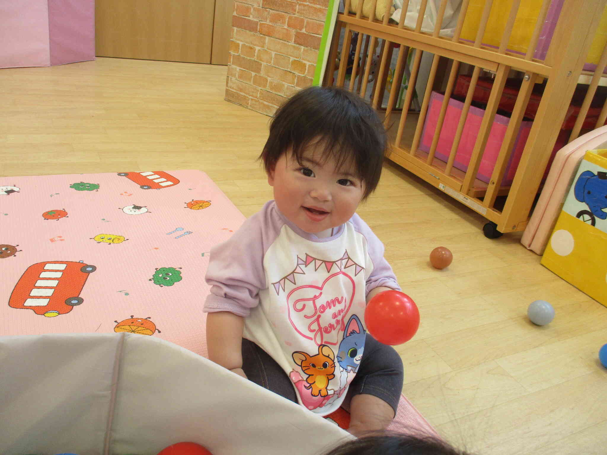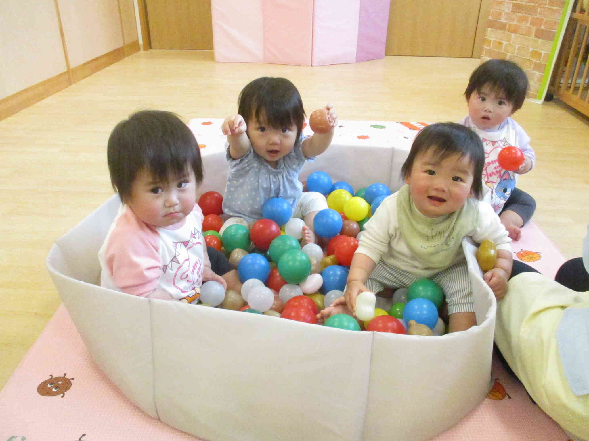 0歳児さんがボールプールの中にドボ~ン!たくさんのボールが気持ちよくニコニコで入っていました。