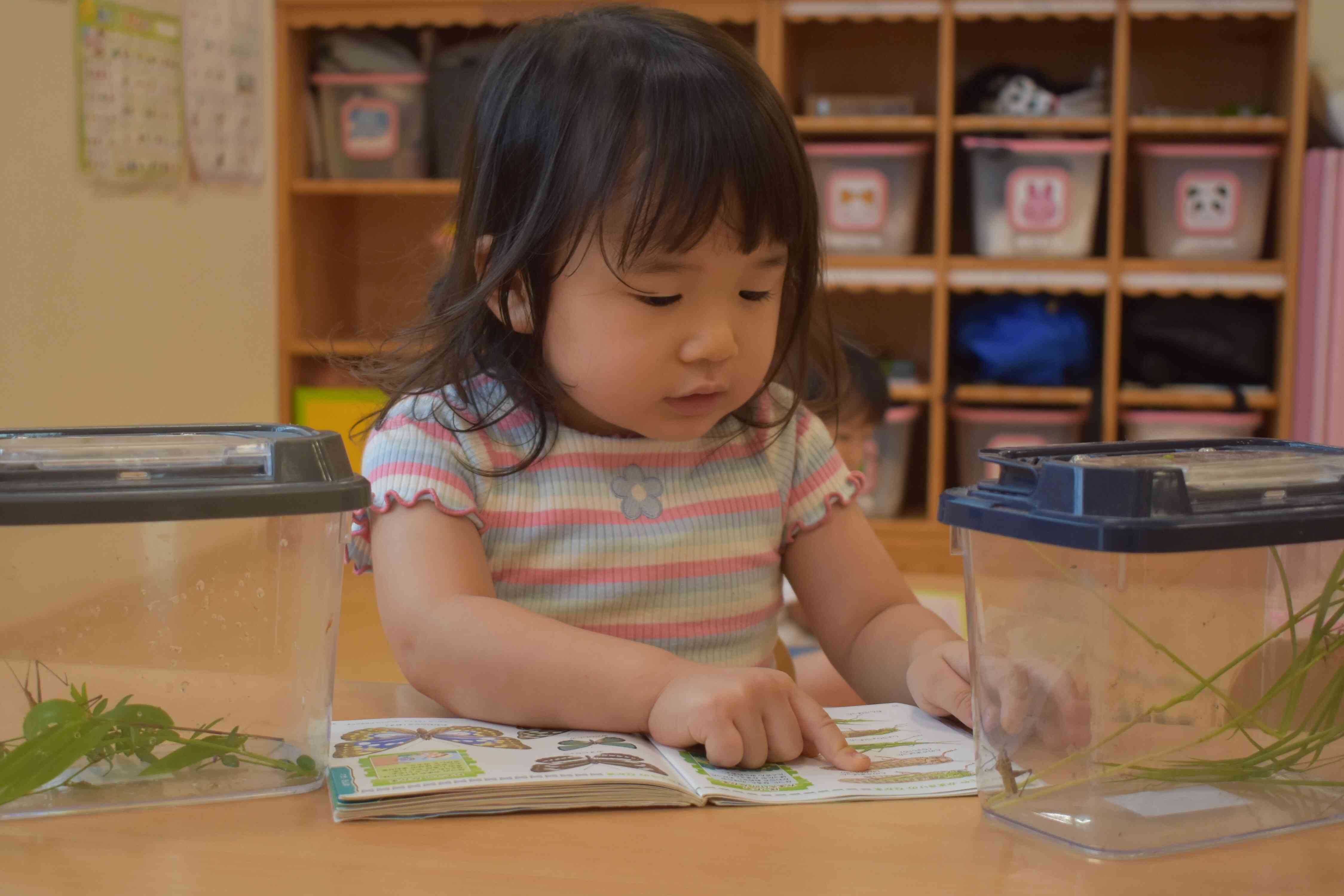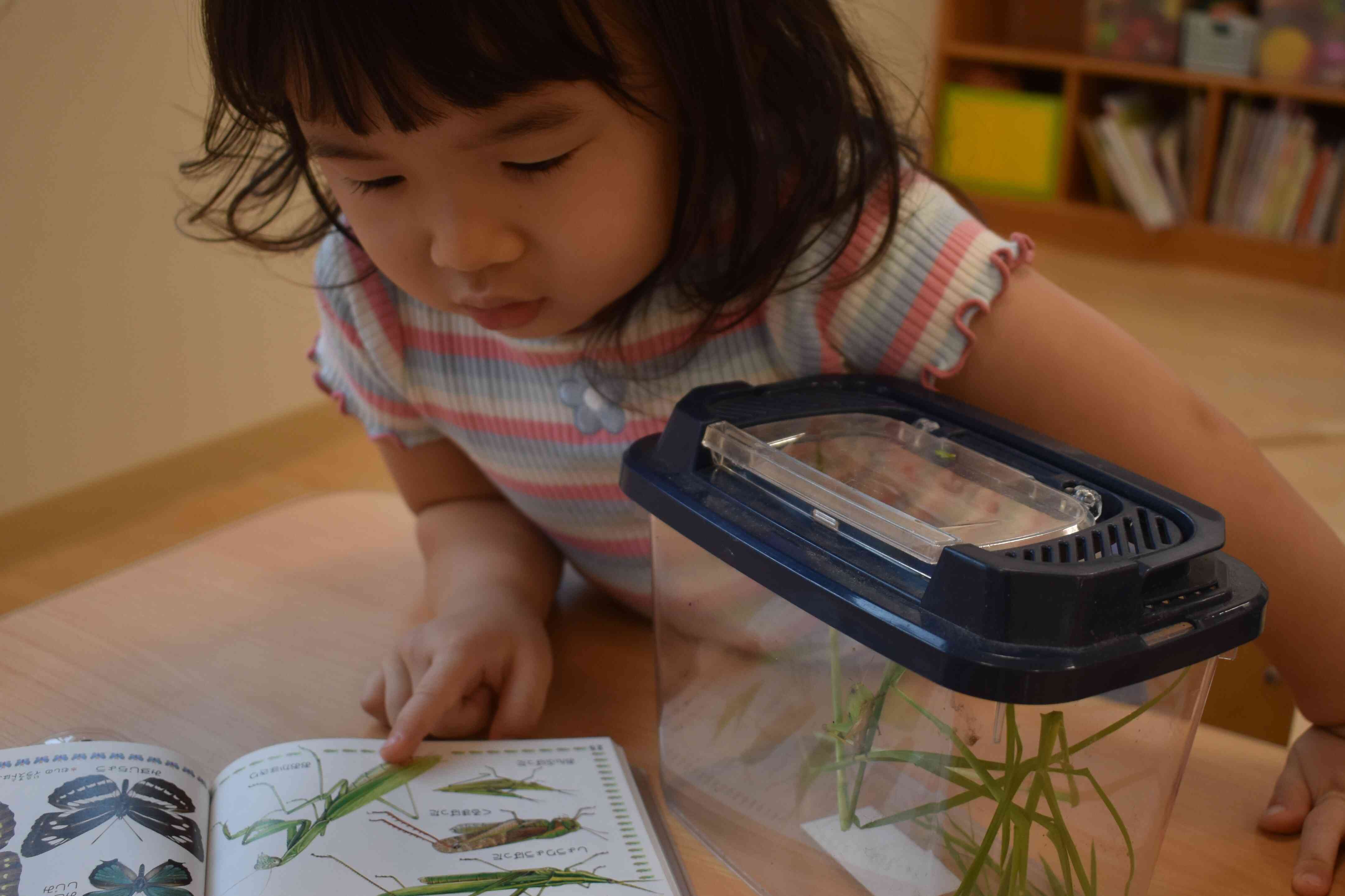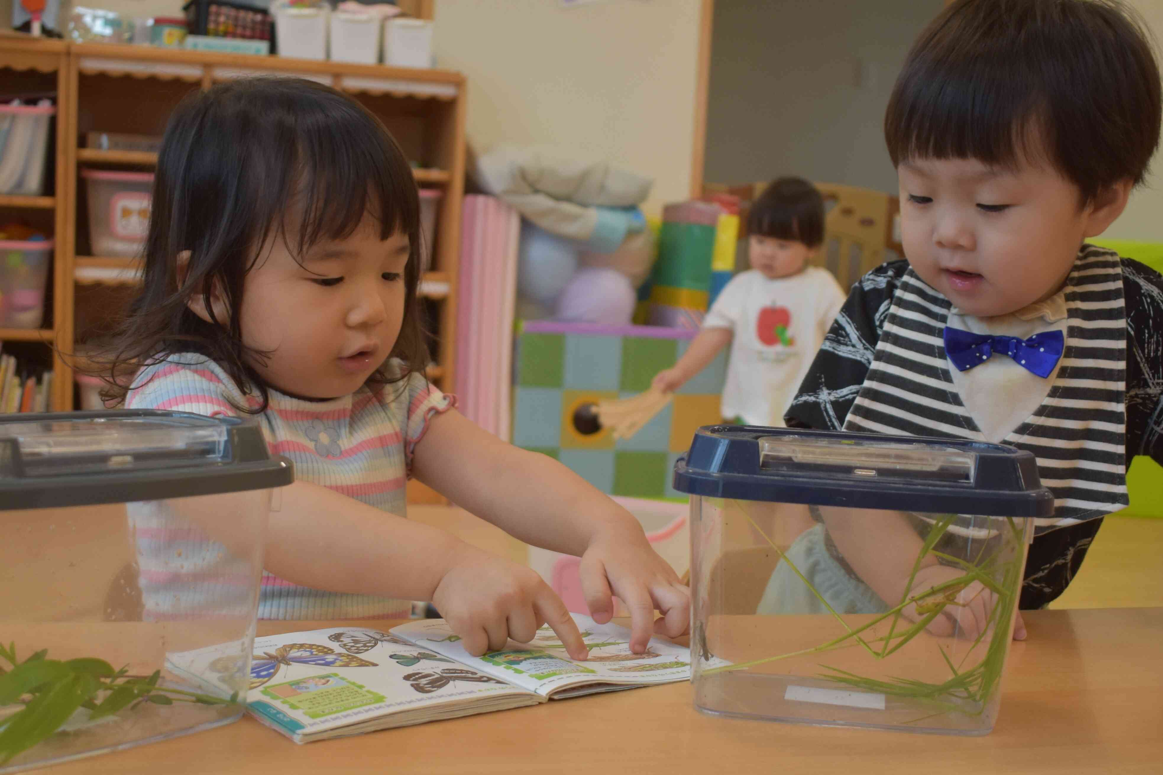 「トノサマバッタだね」と図鑑の字を読んでもらうと「トノサマバッタだって」とみんなで盛り上がっていました。