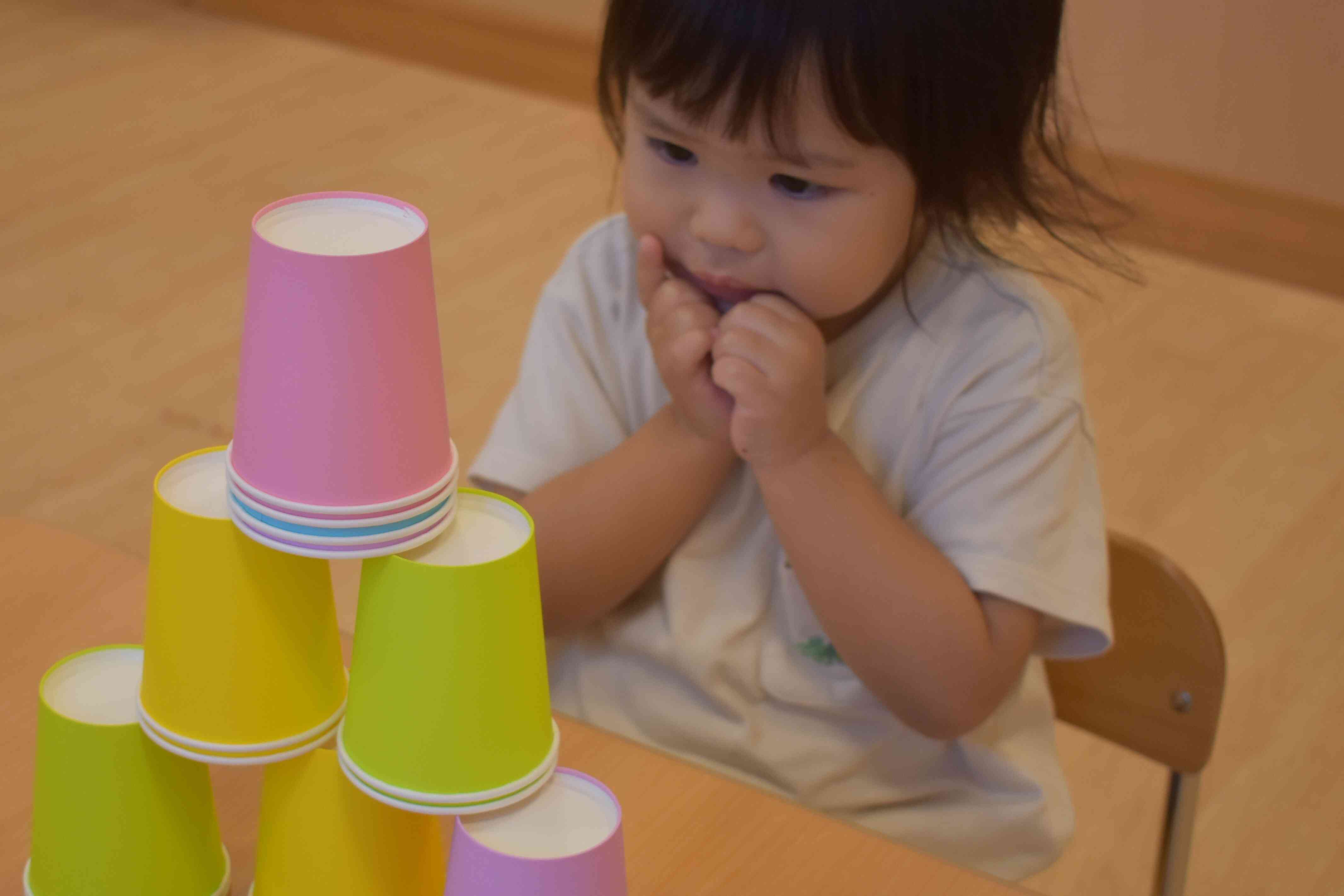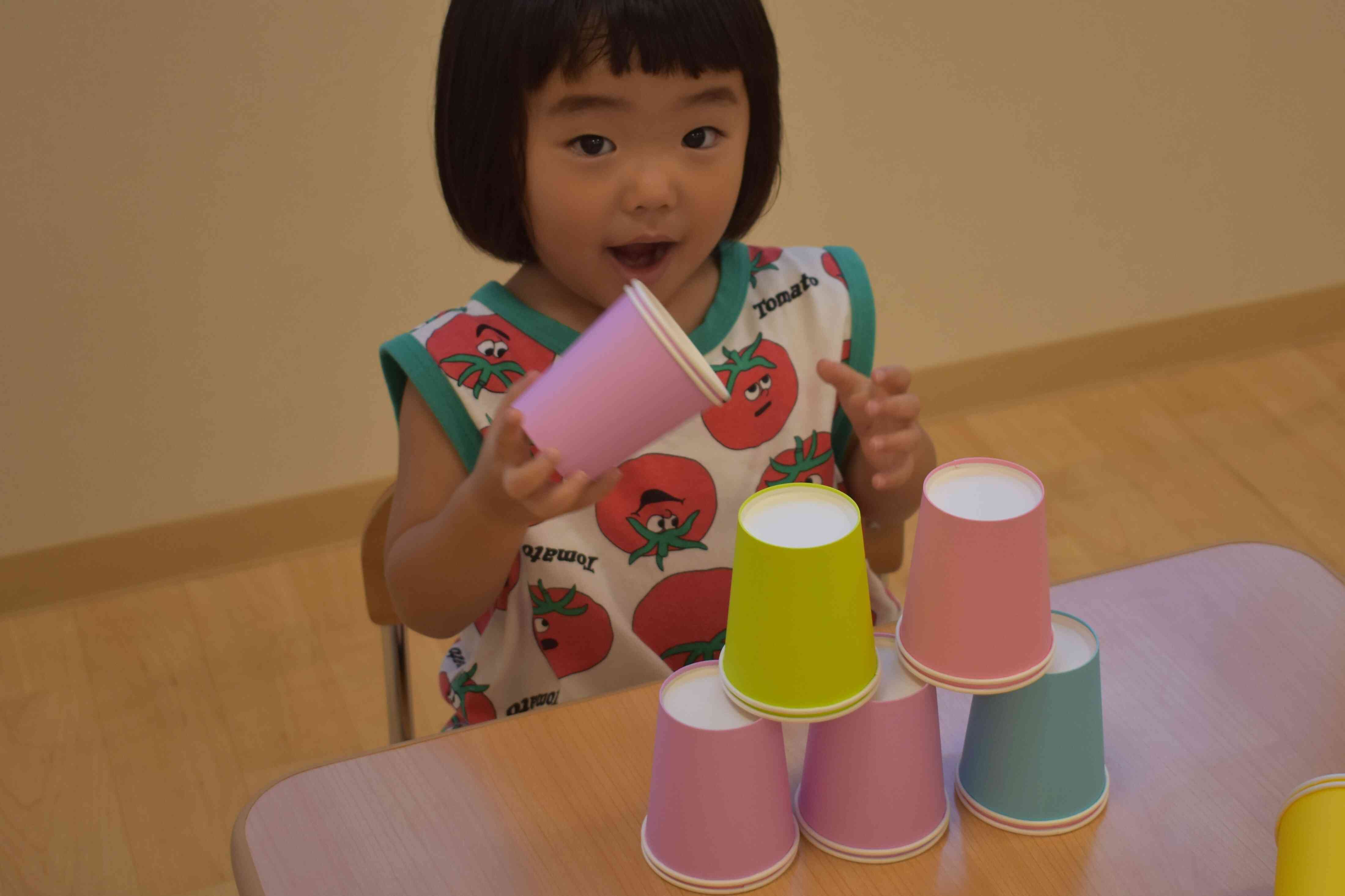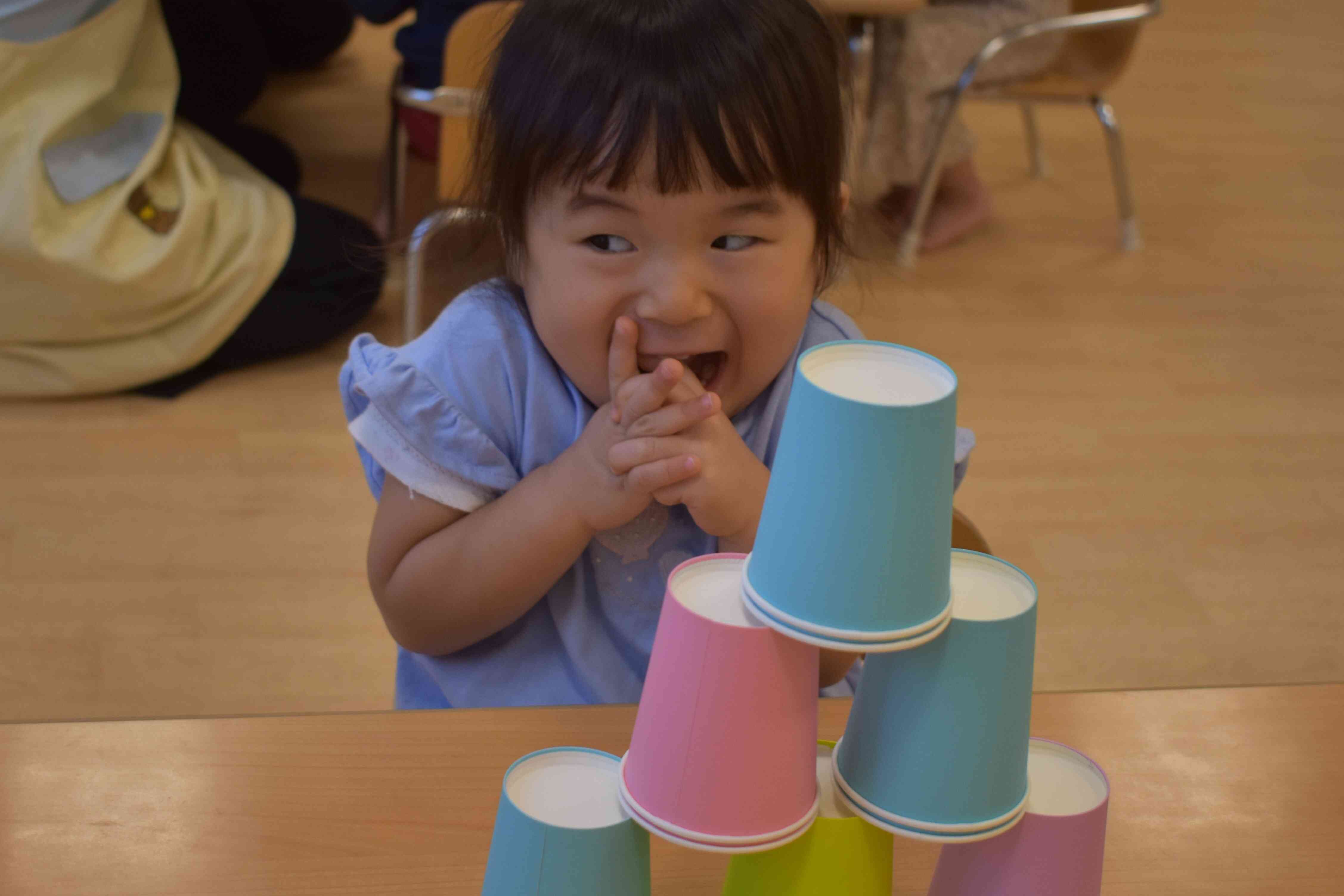 自分の好きな色のカップで作ったタワーを自慢げに見せてくれました。