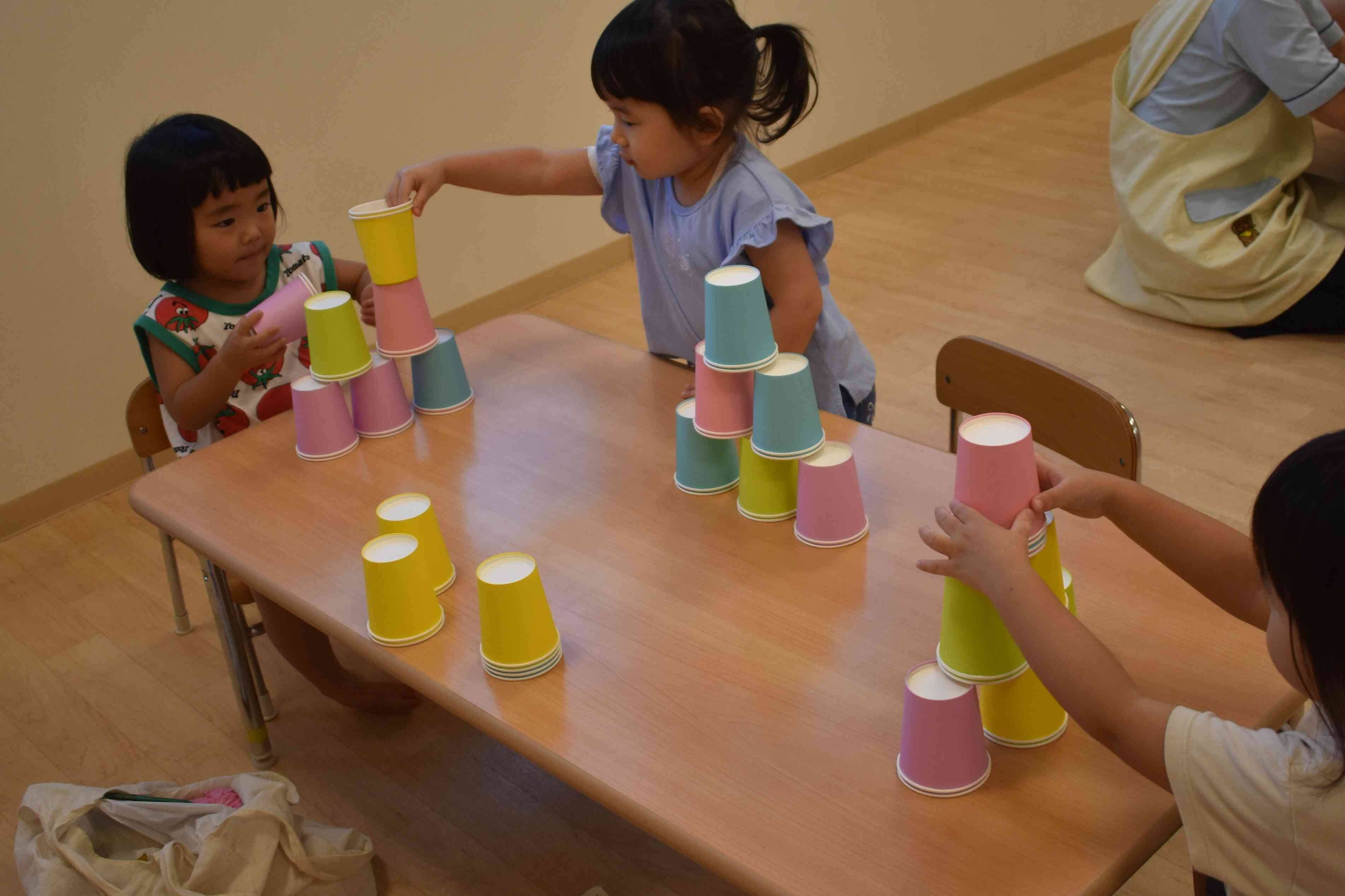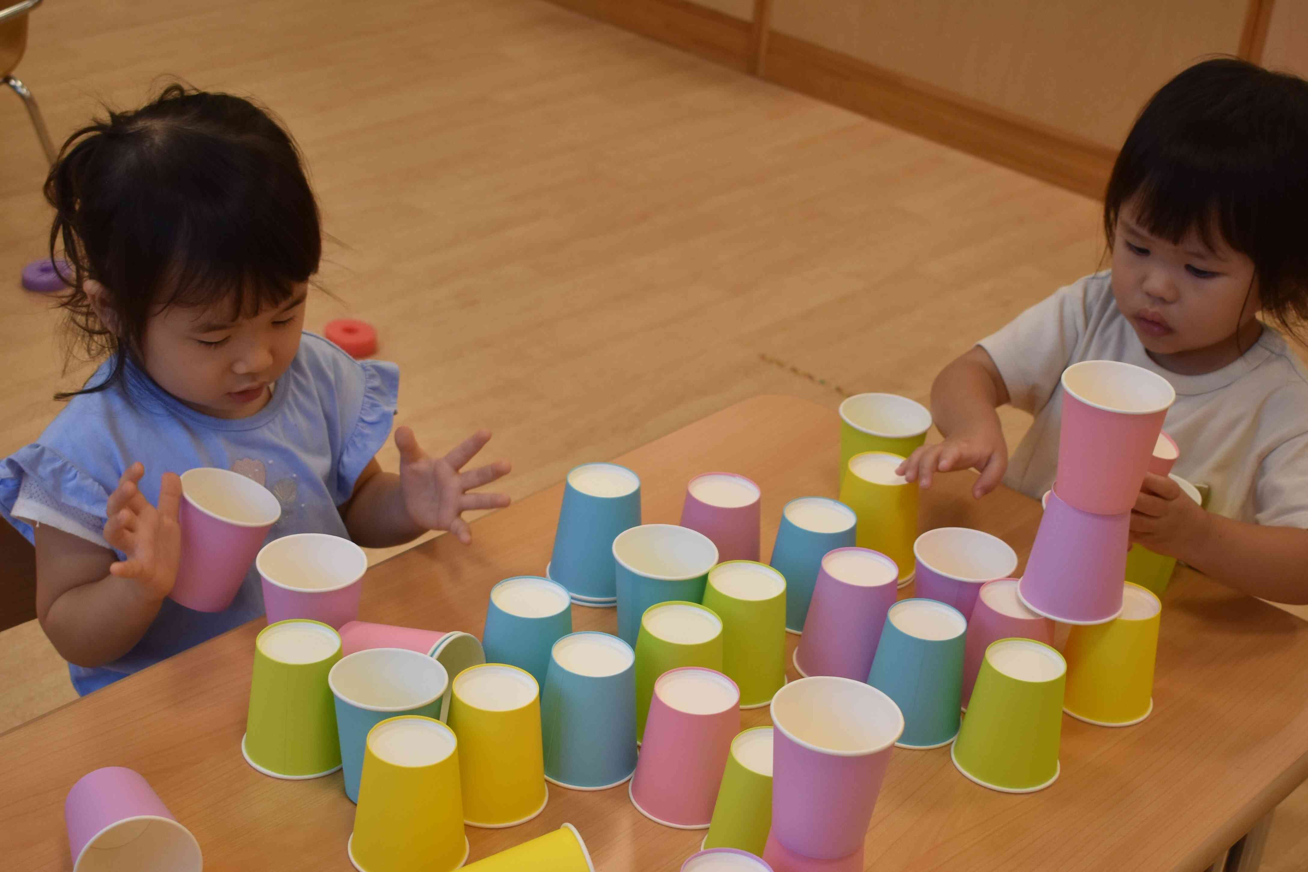 カラフルなカップを使ってタワーを作っている子どもたち。