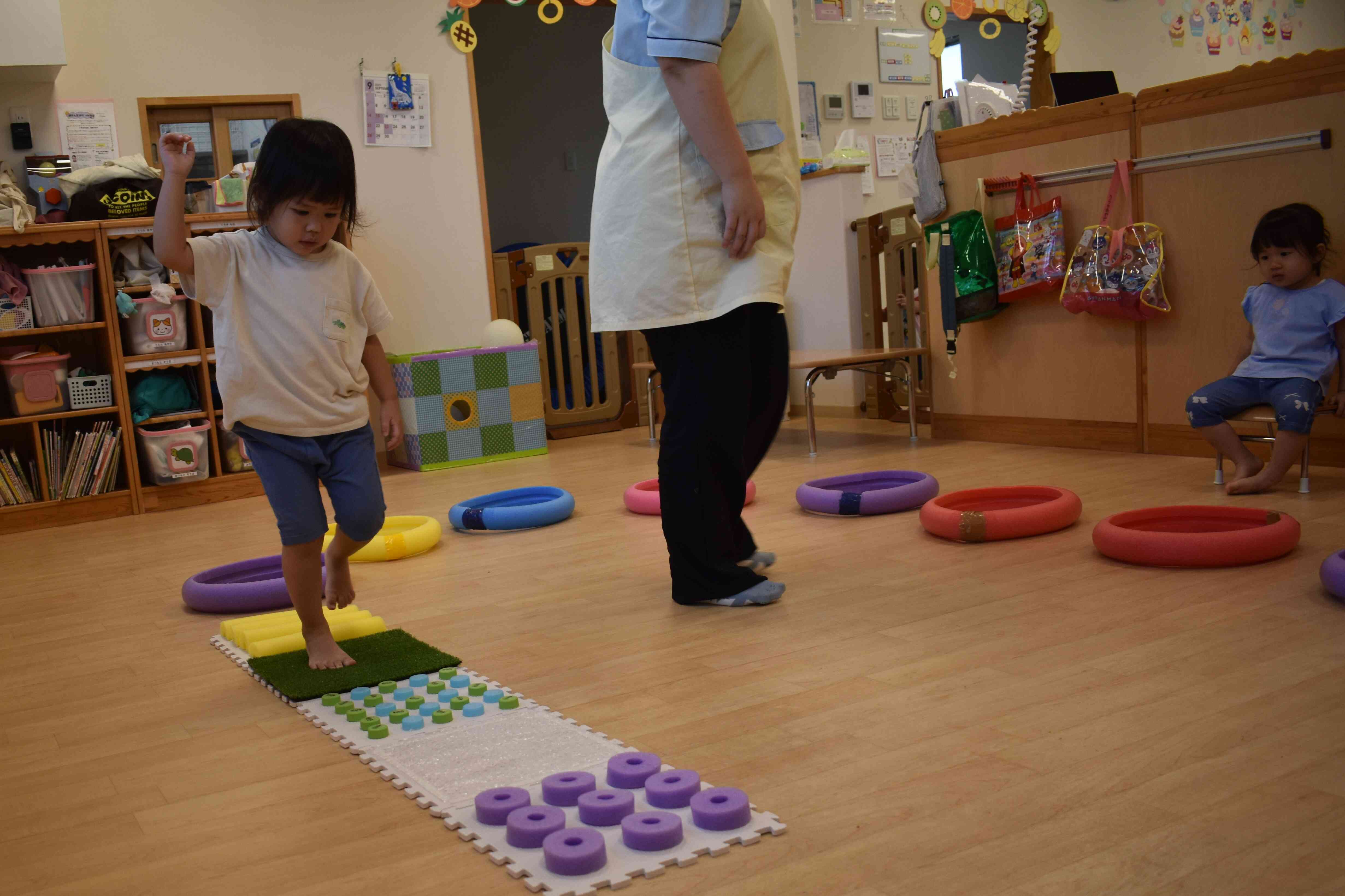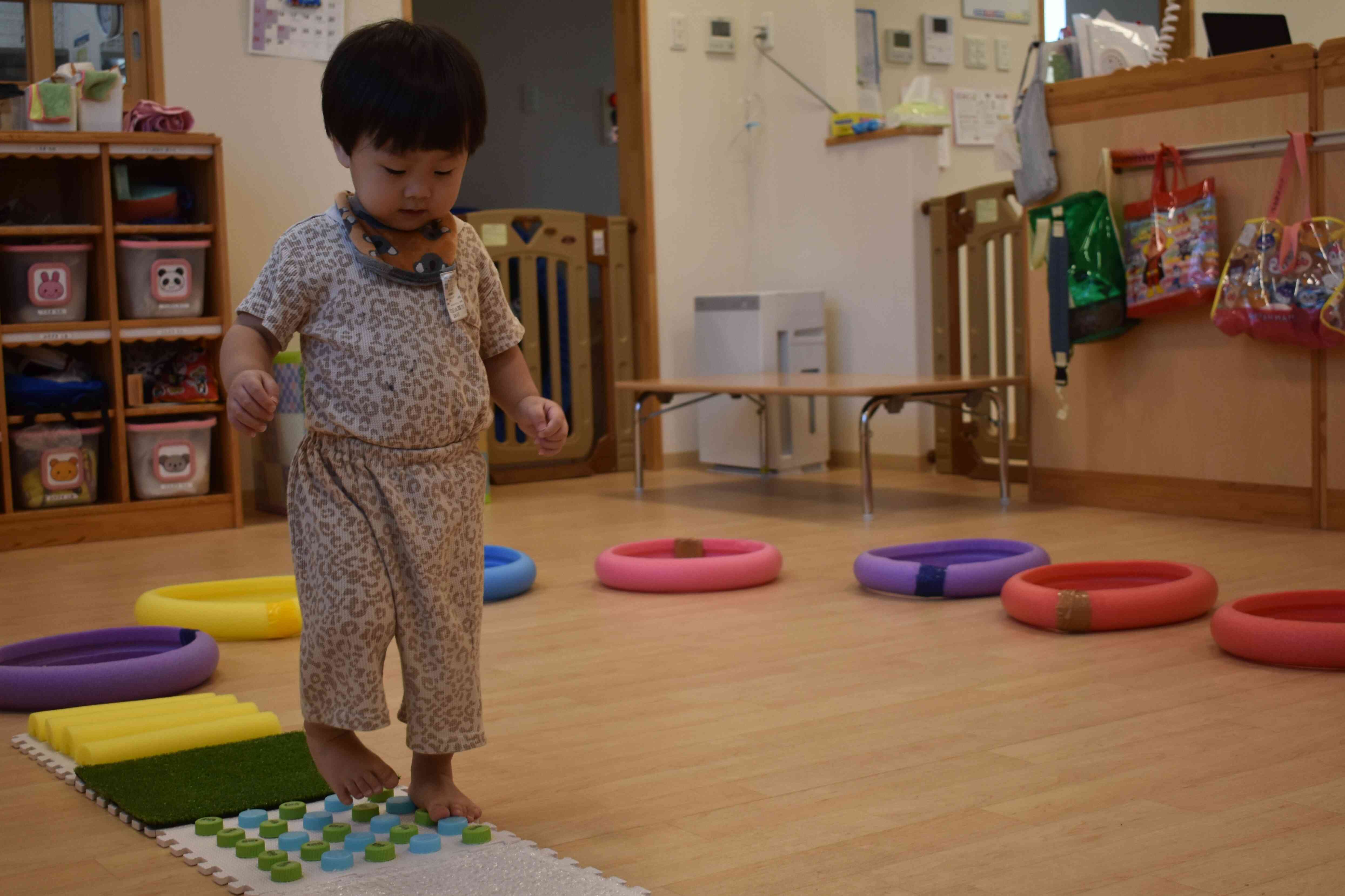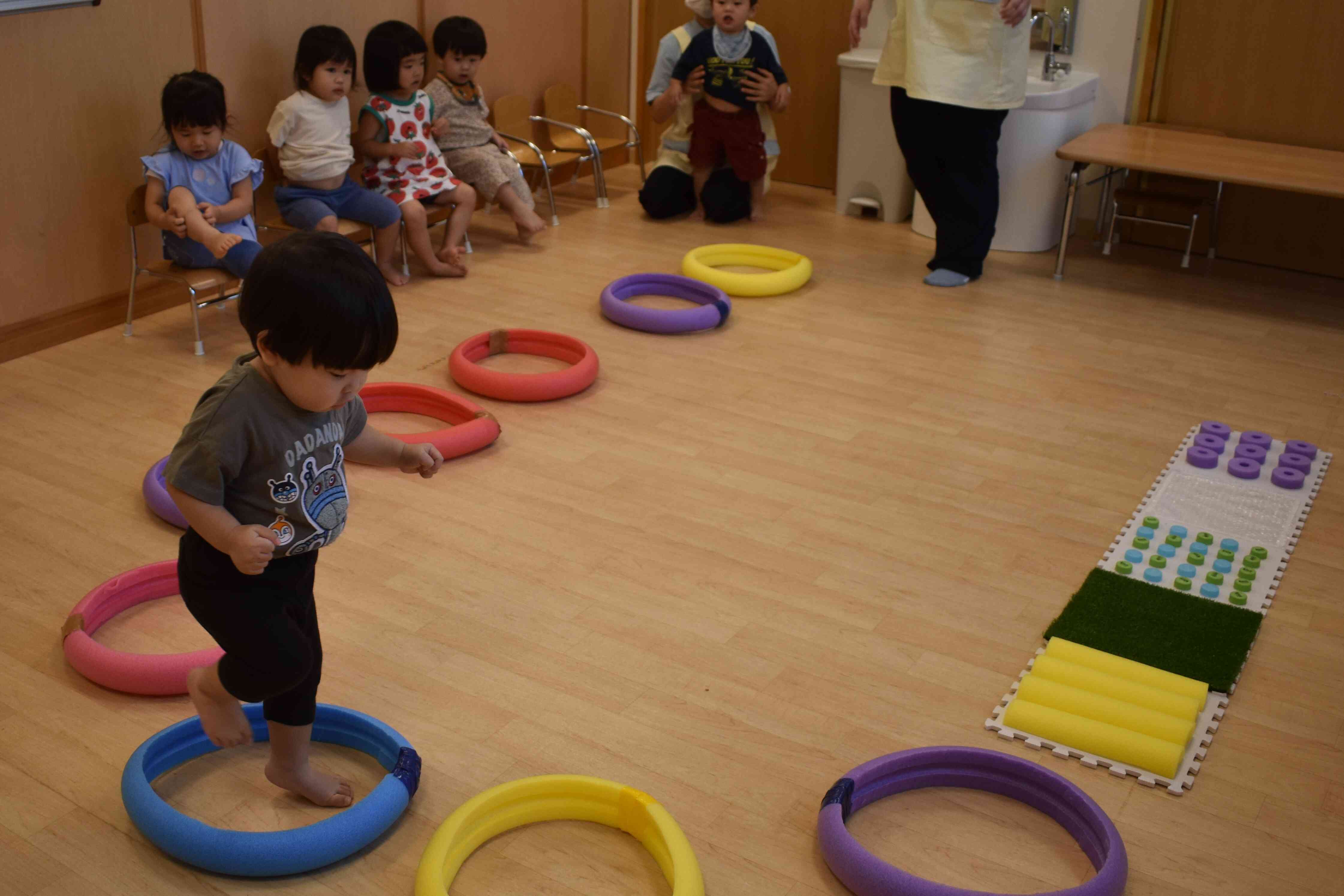丸い輪を渡ると、足裏を刺激するでこぼこゾーンがあるアスレチック遊びをしました。