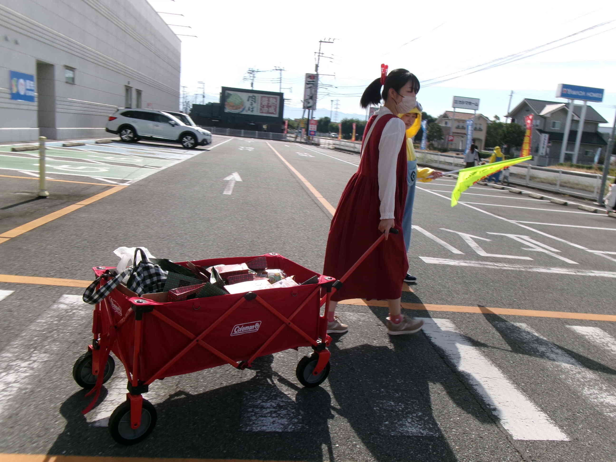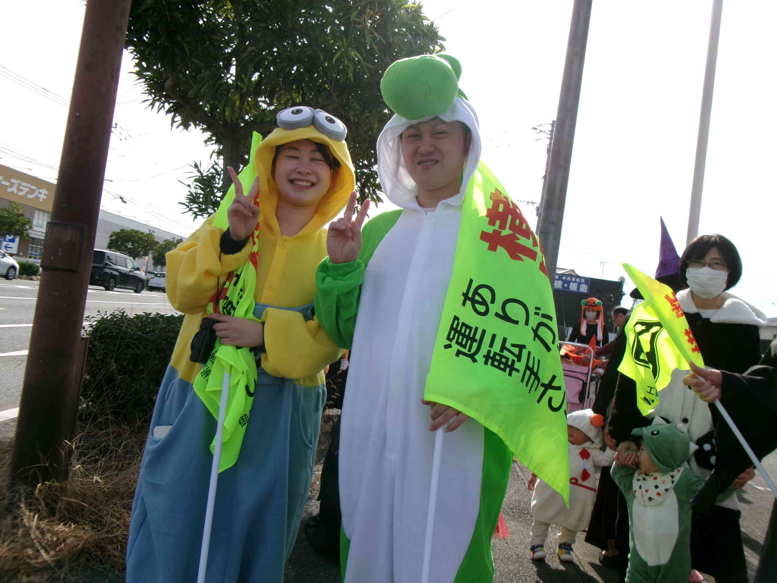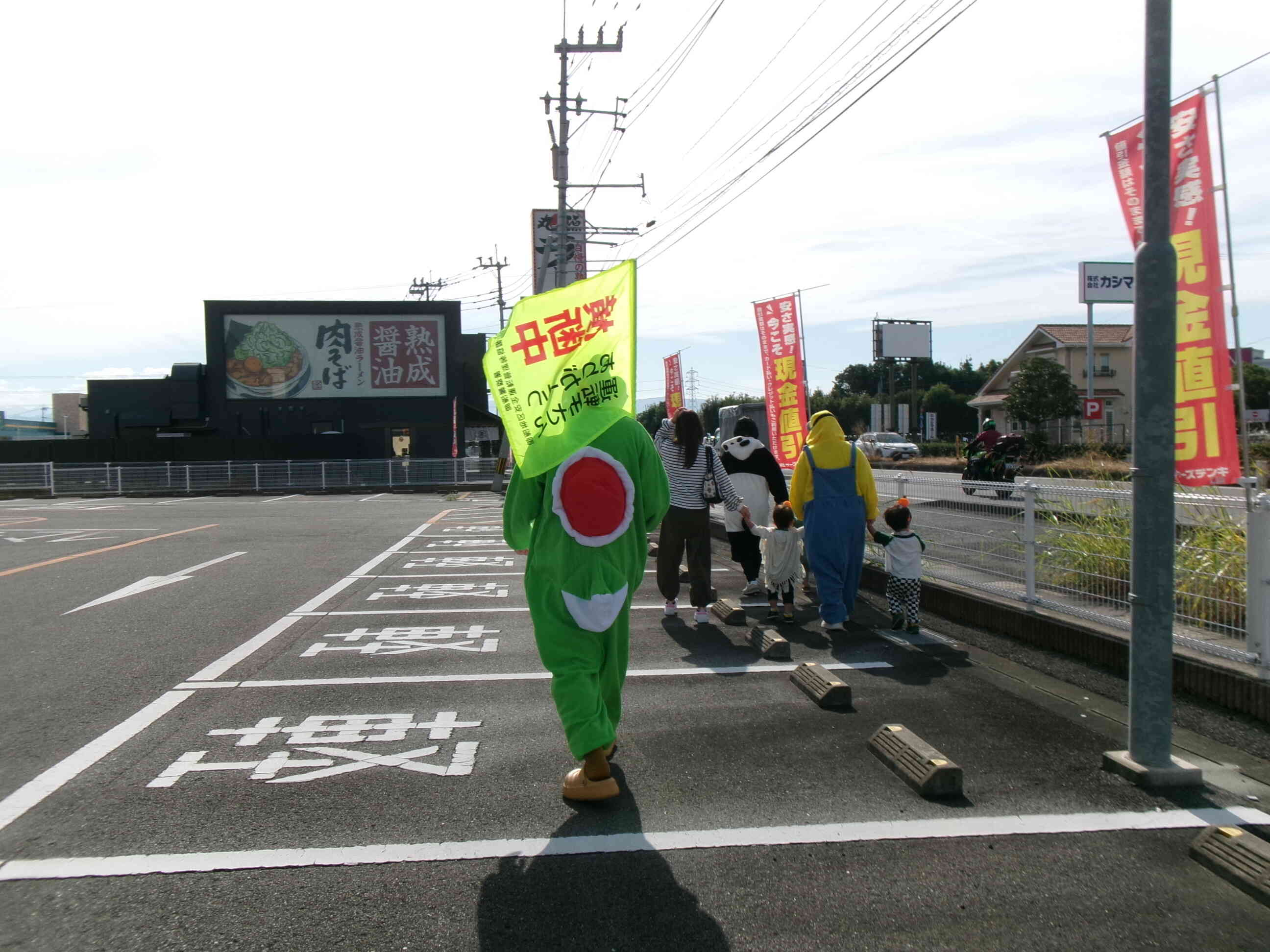 嘉島の街に繰り出すと、近くの自転車屋さんがお菓子と横断旗をもって待っていてくださいました。