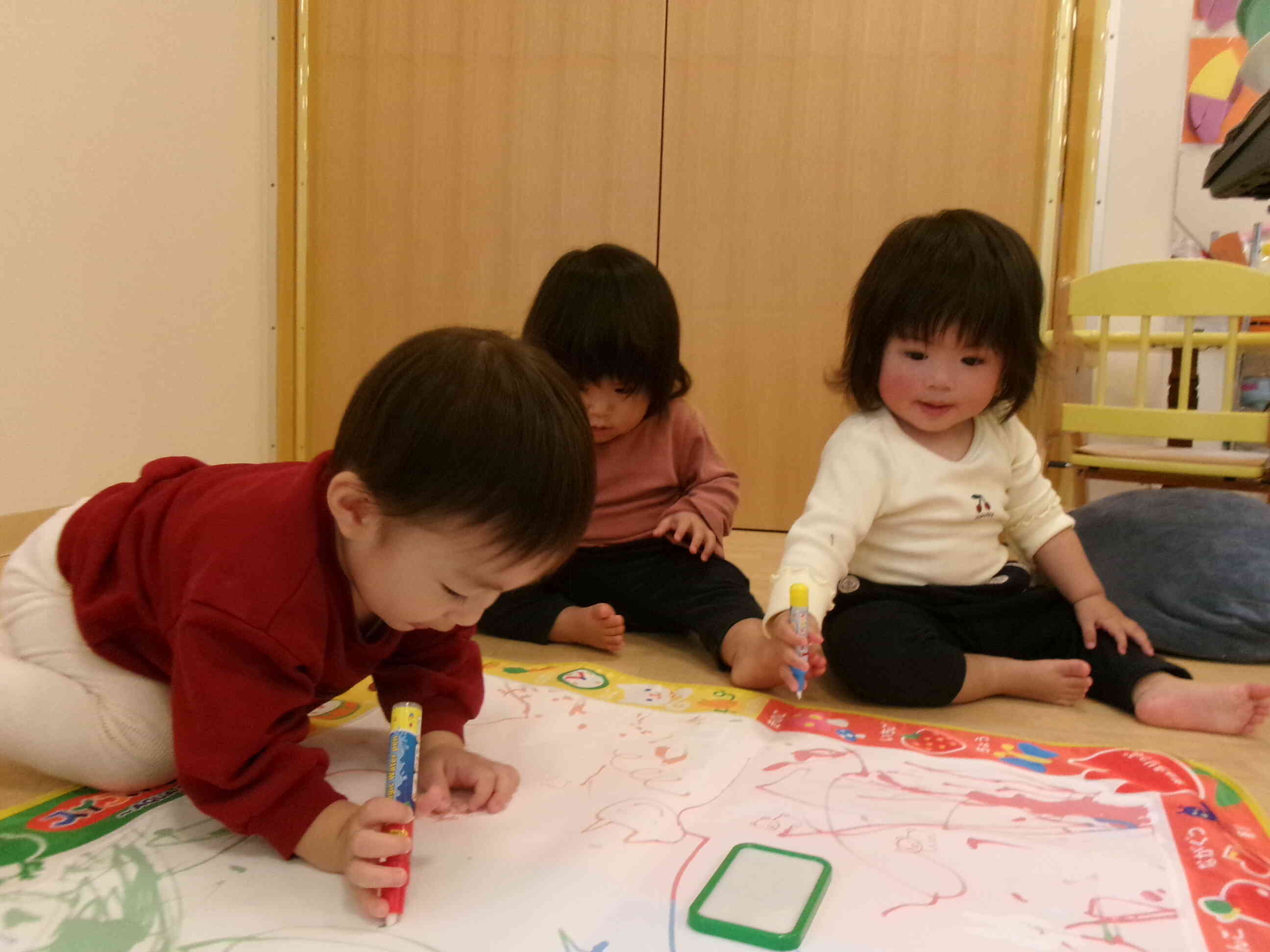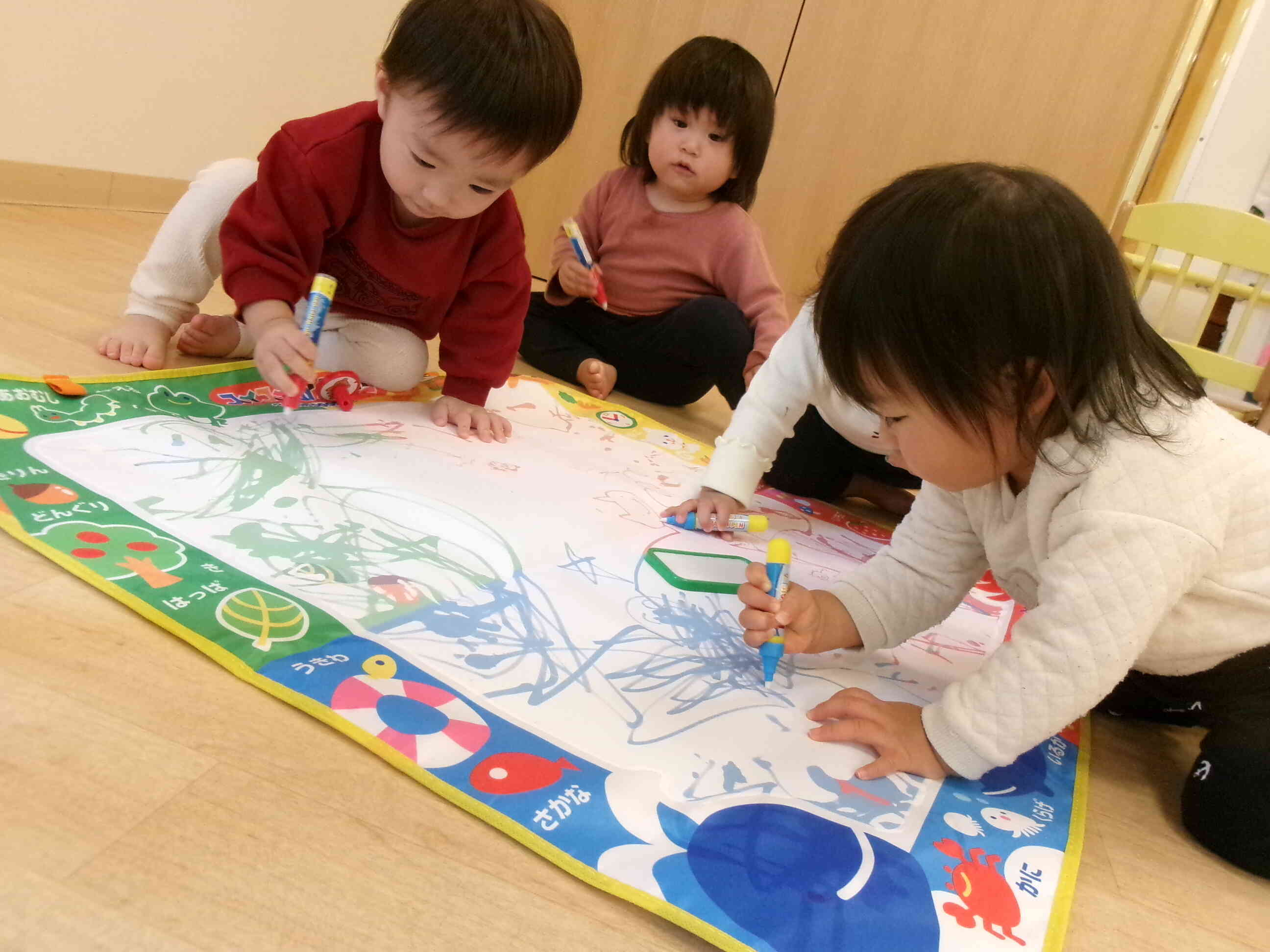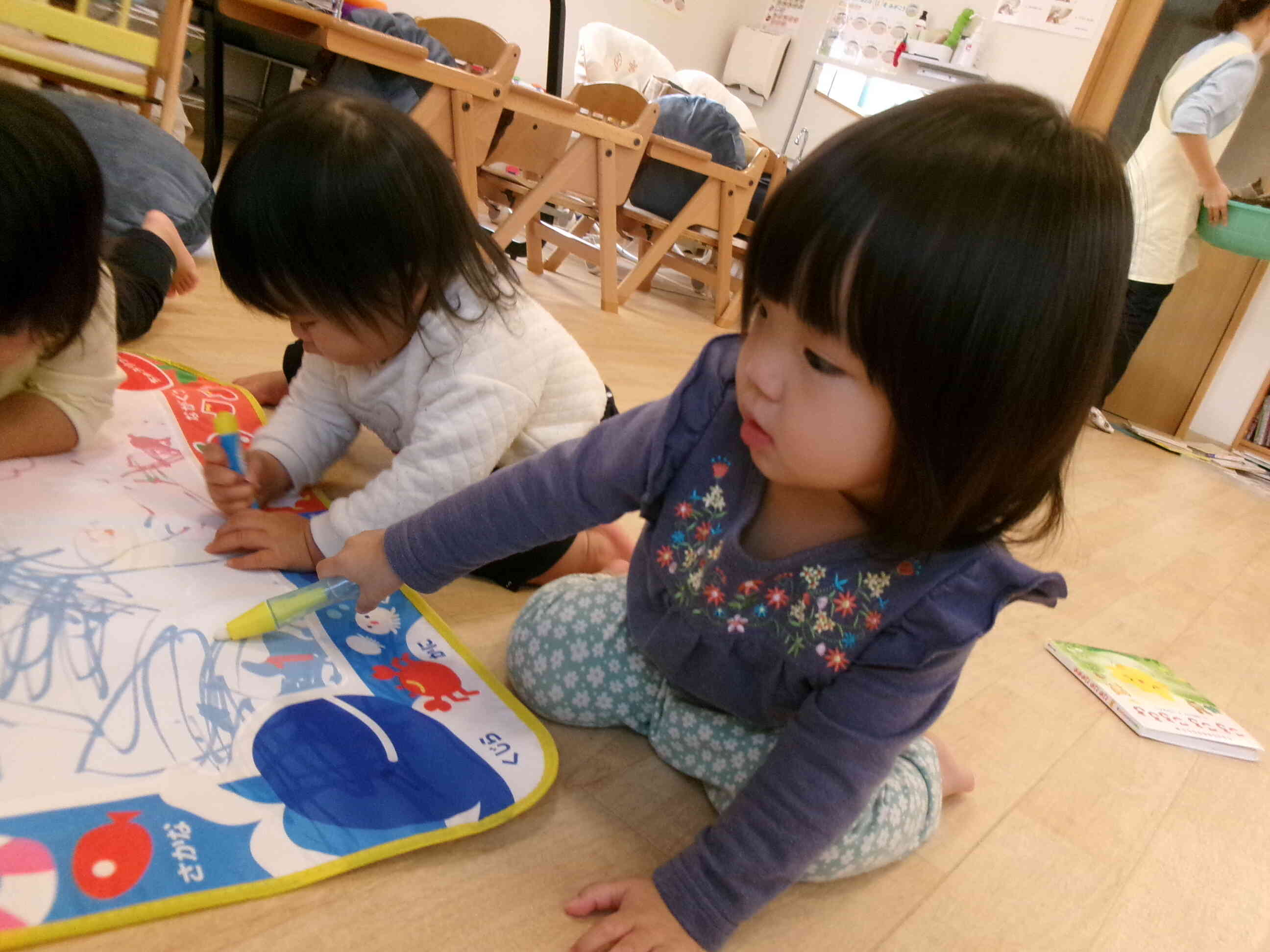 水ペンなので手や服が汚れる心配がないので、紙の上に寝転んで描いている子もいました。