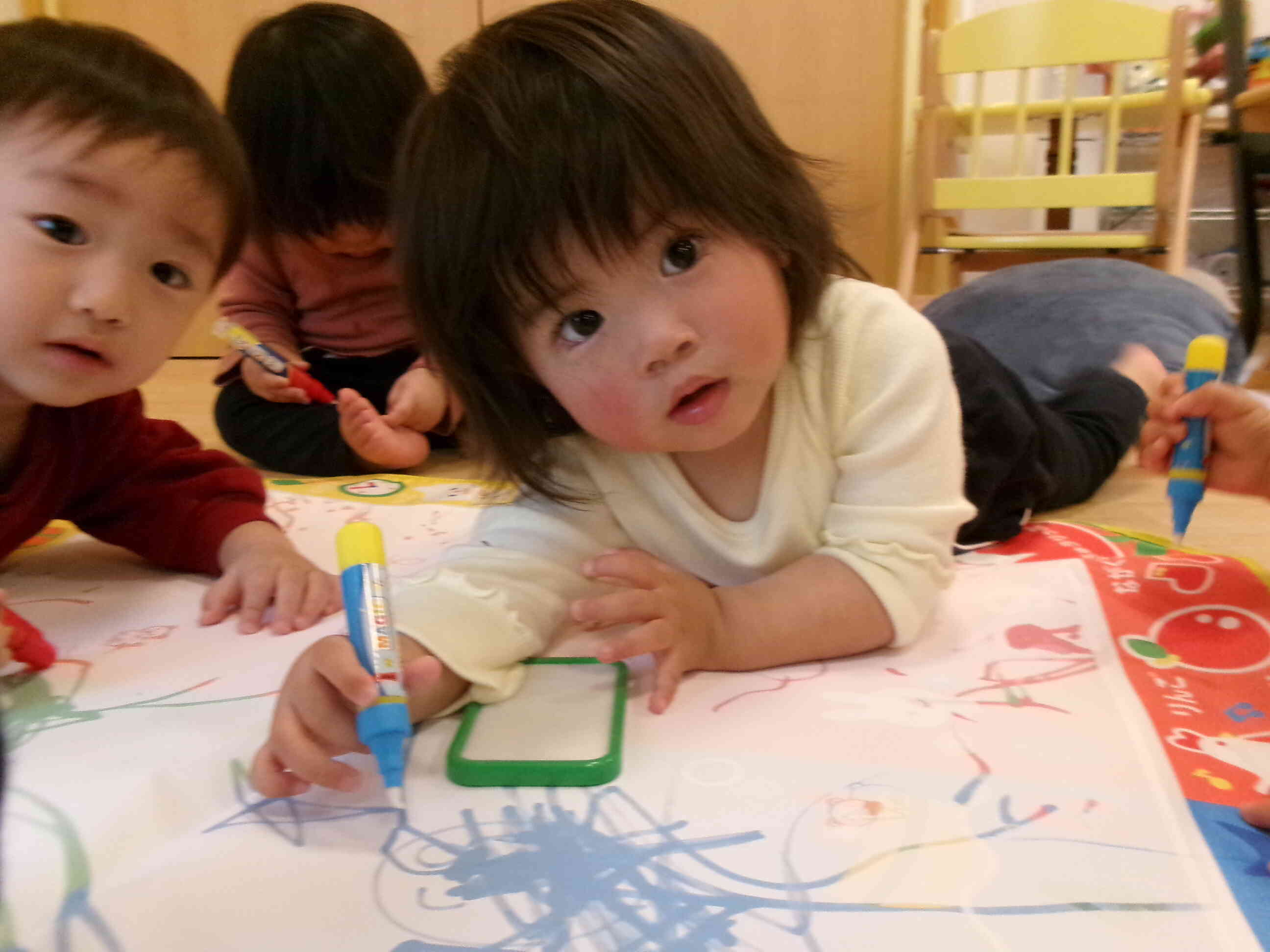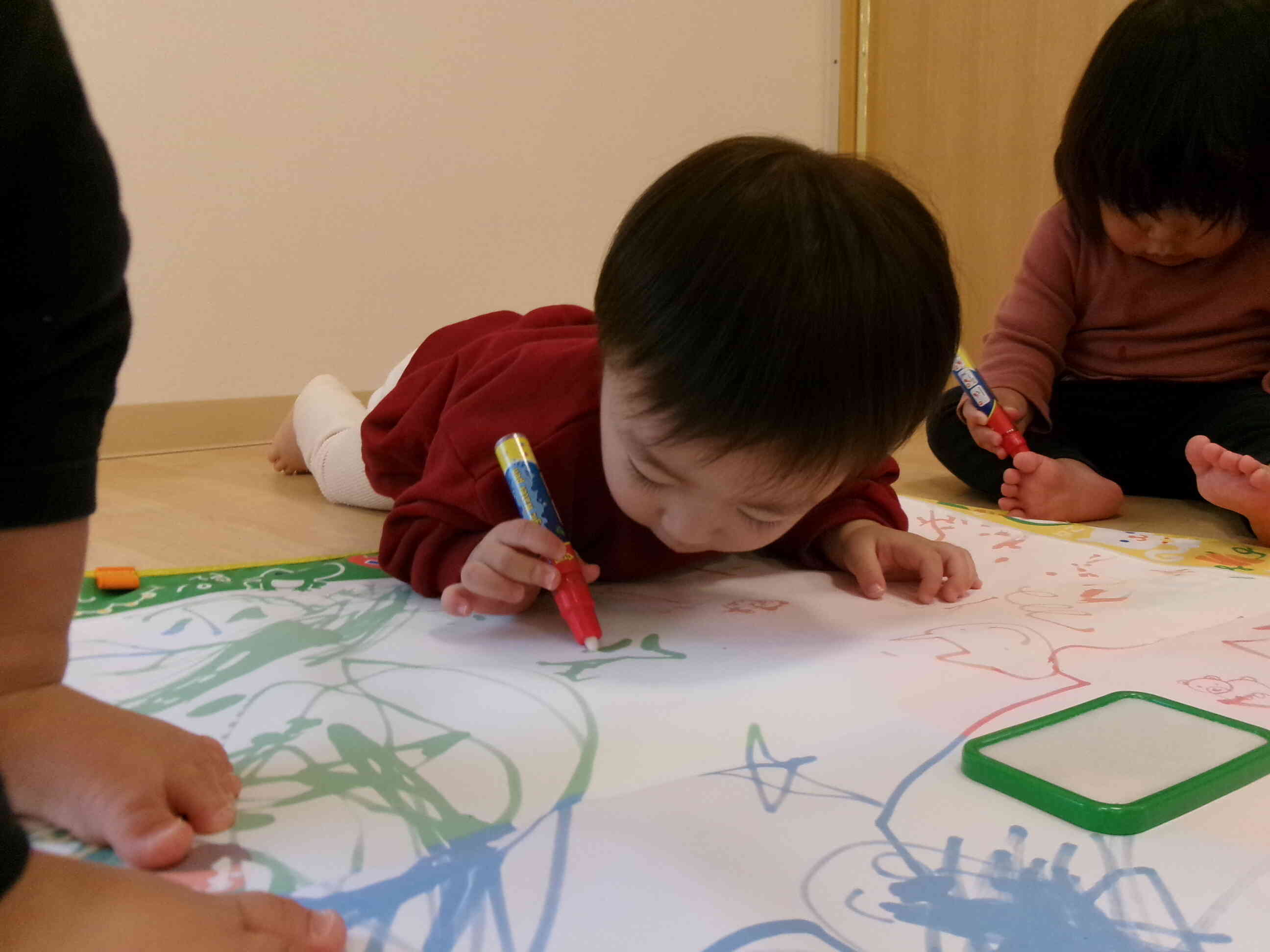 子どもたちは大きな紙に全身を使っておもいっきりお絵描きを楽しみました。