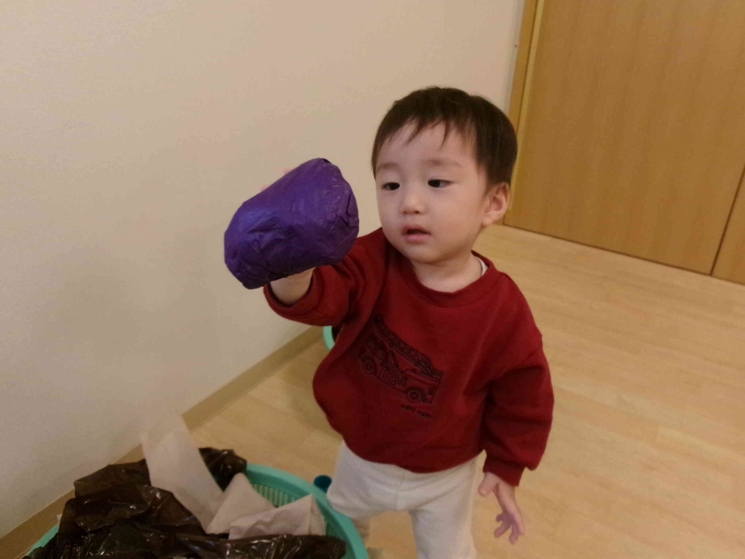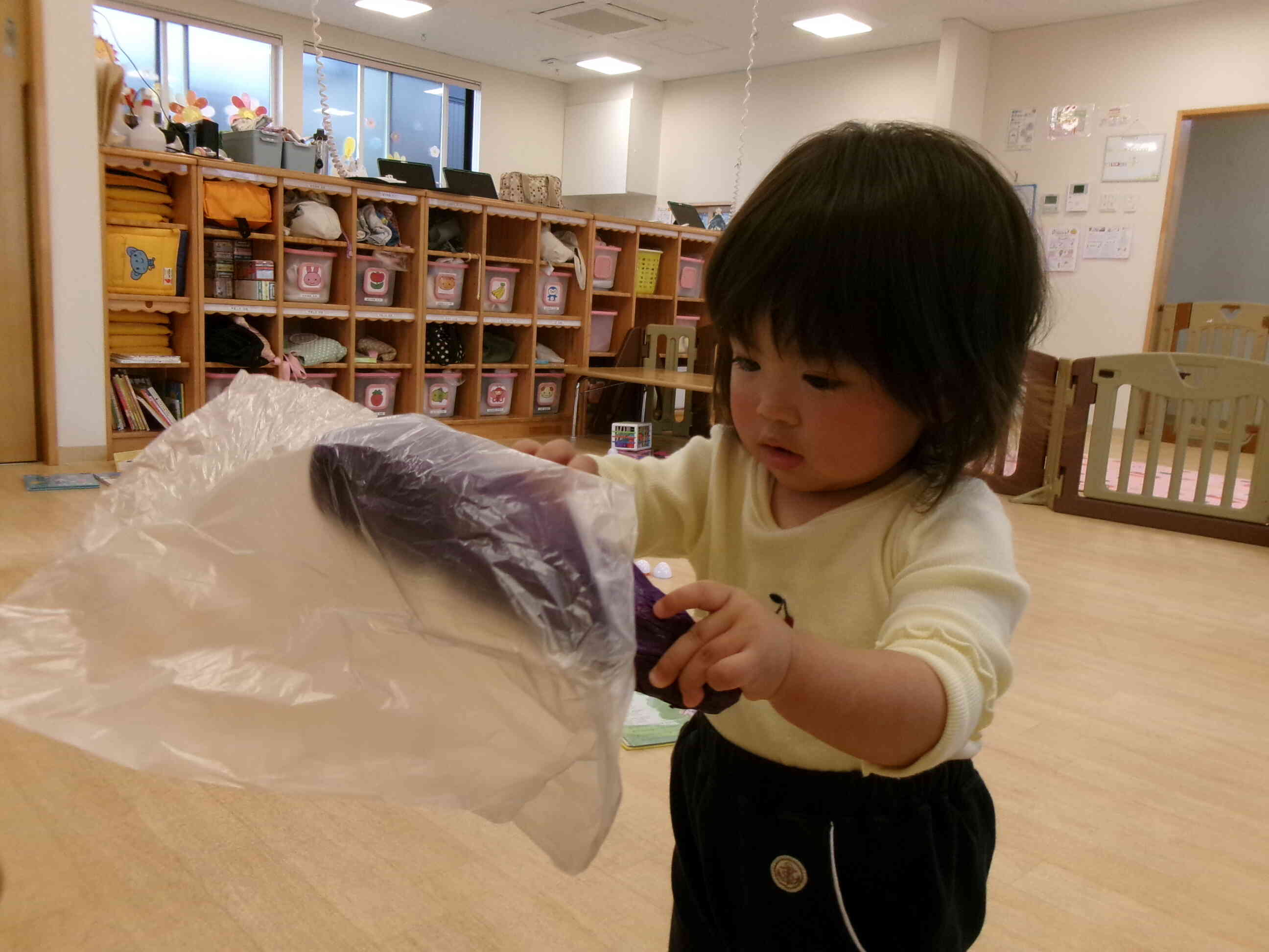 袋をもらってお芋を入れていく子どもたち。早速通園バックに入れていました。