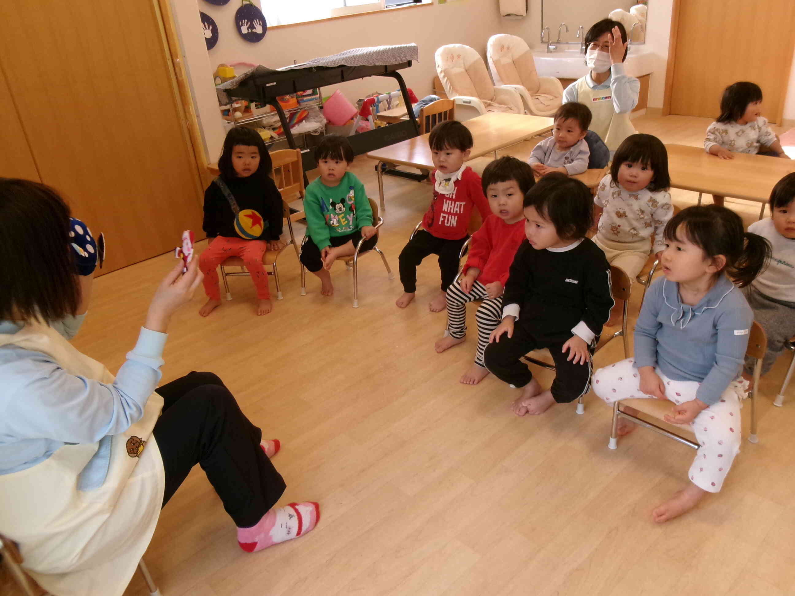 日にち、天気の確認、先生の楽しい手遊びや、絵本の読み聞かせ、お名前呼びなどです。