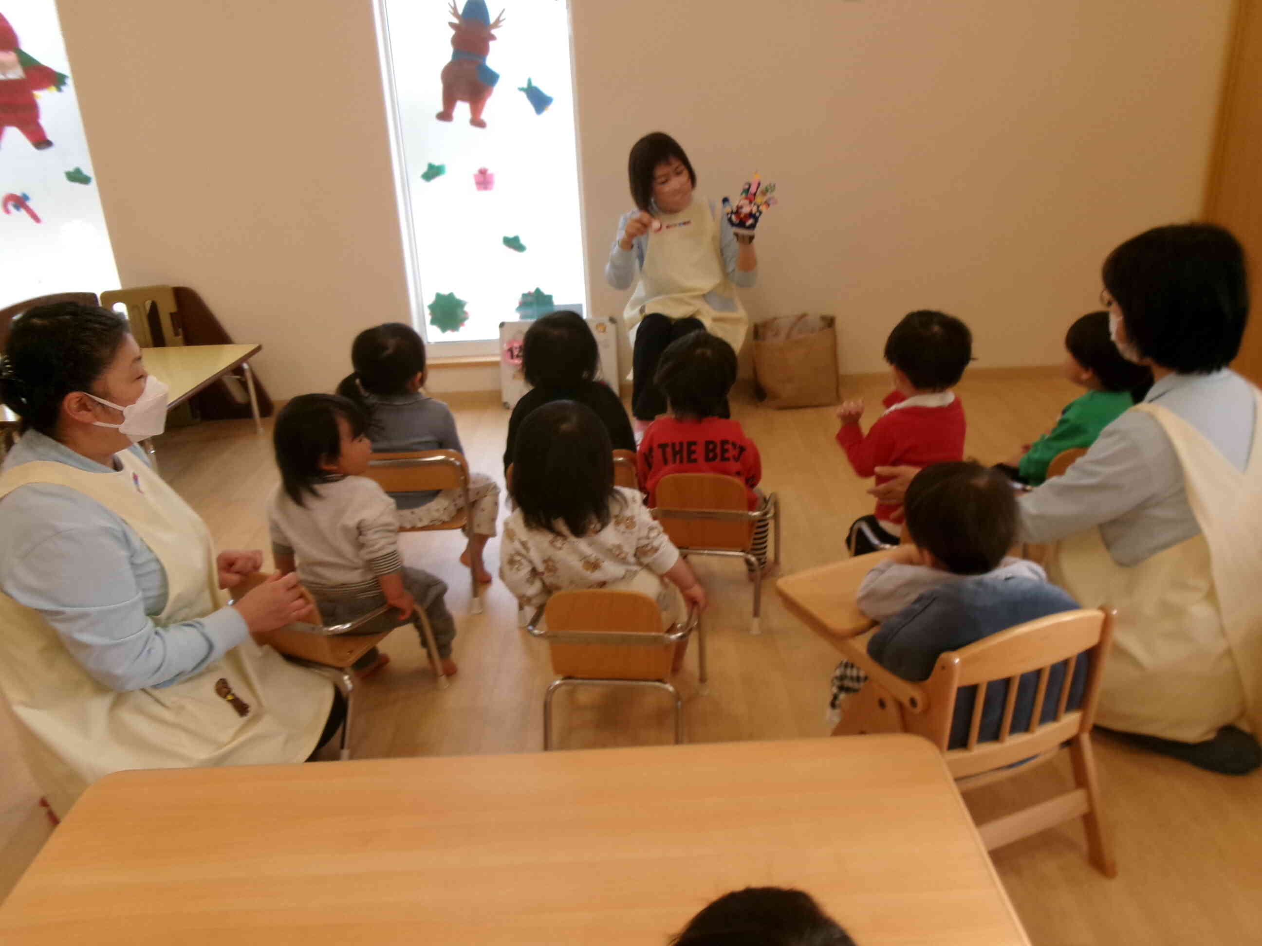 先生の手遊びや絵本の読み聞かせは、子どもたちは毎回楽しみにしていて、「今日は何のお話かな」と
