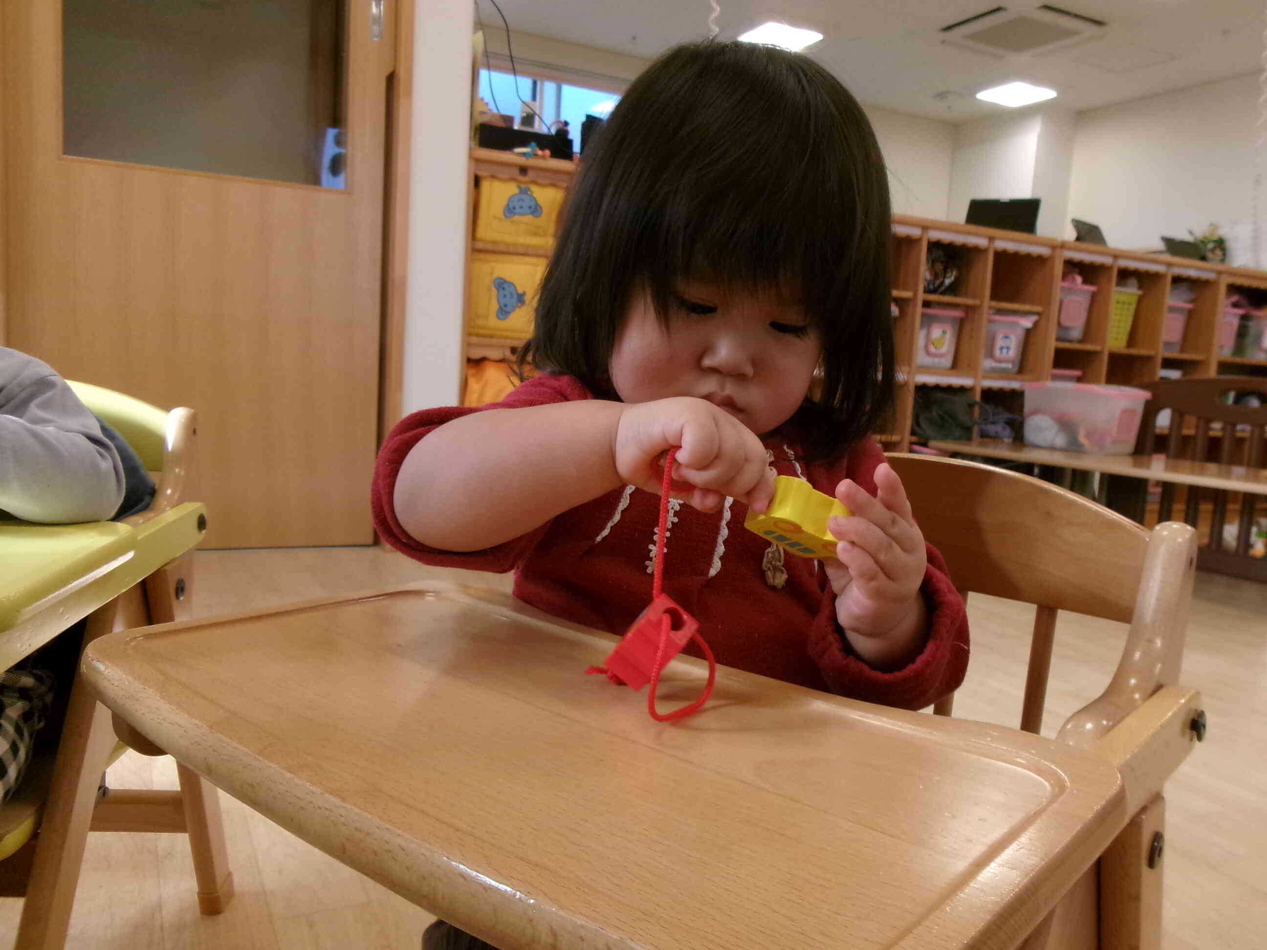 ひもの端を穴に通して引っ張るという作業ですが、なかなか思うように指が動かず苦戦中!
