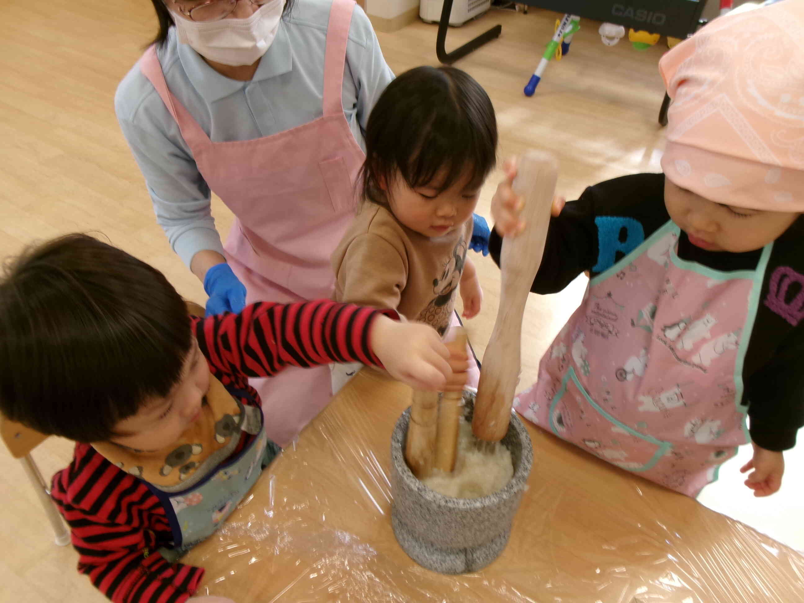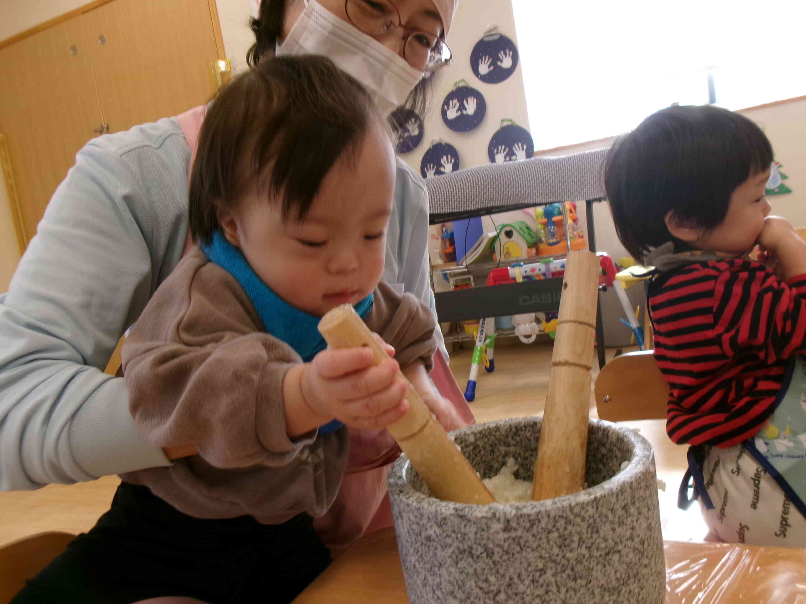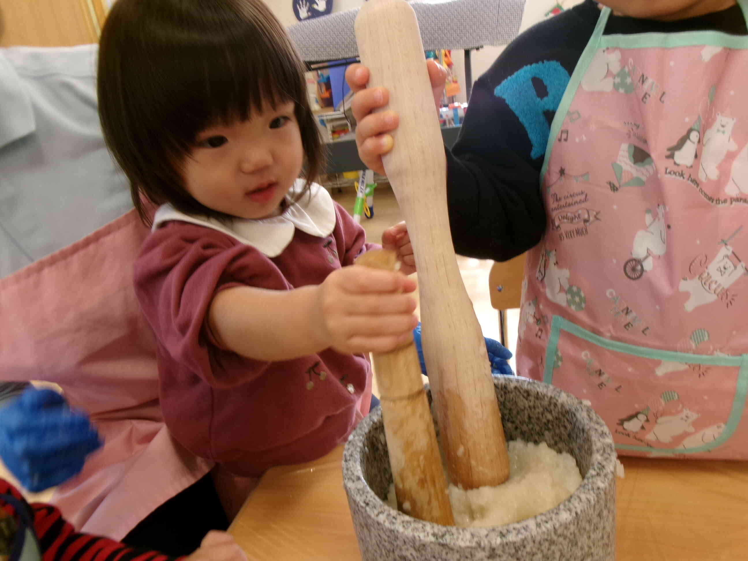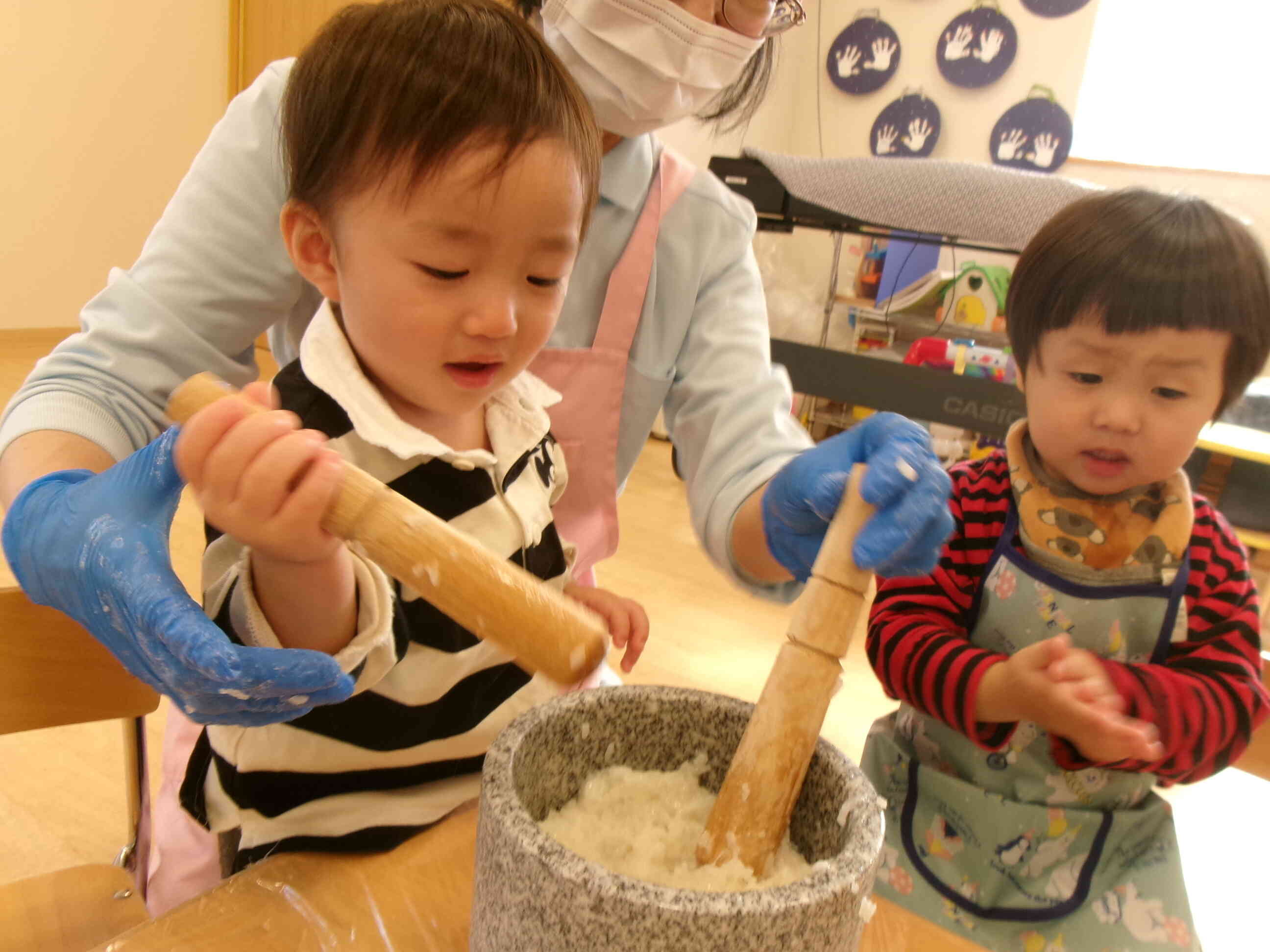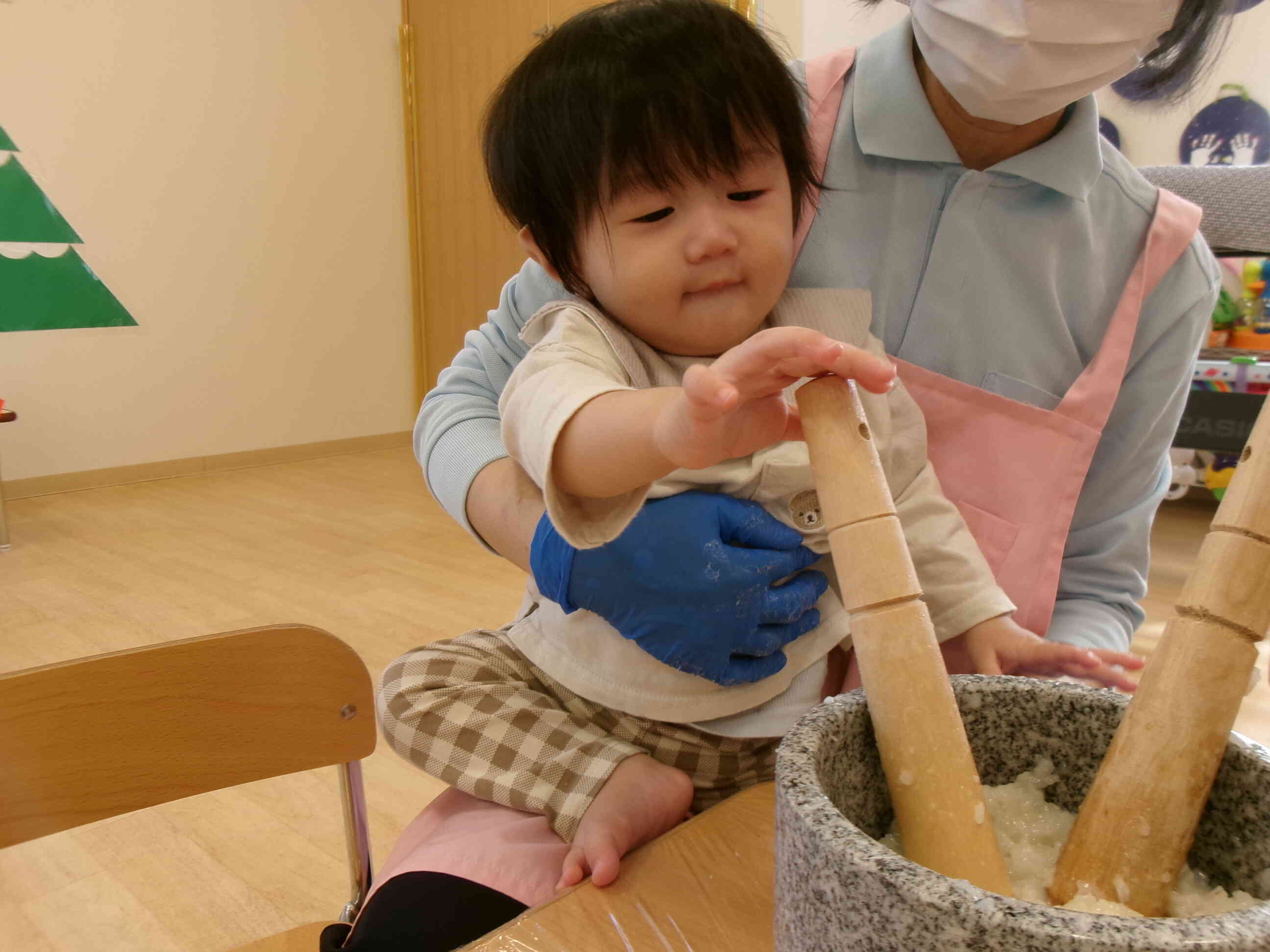 0歳児さんもぺったんぺったんと餅つきを体験してみました。