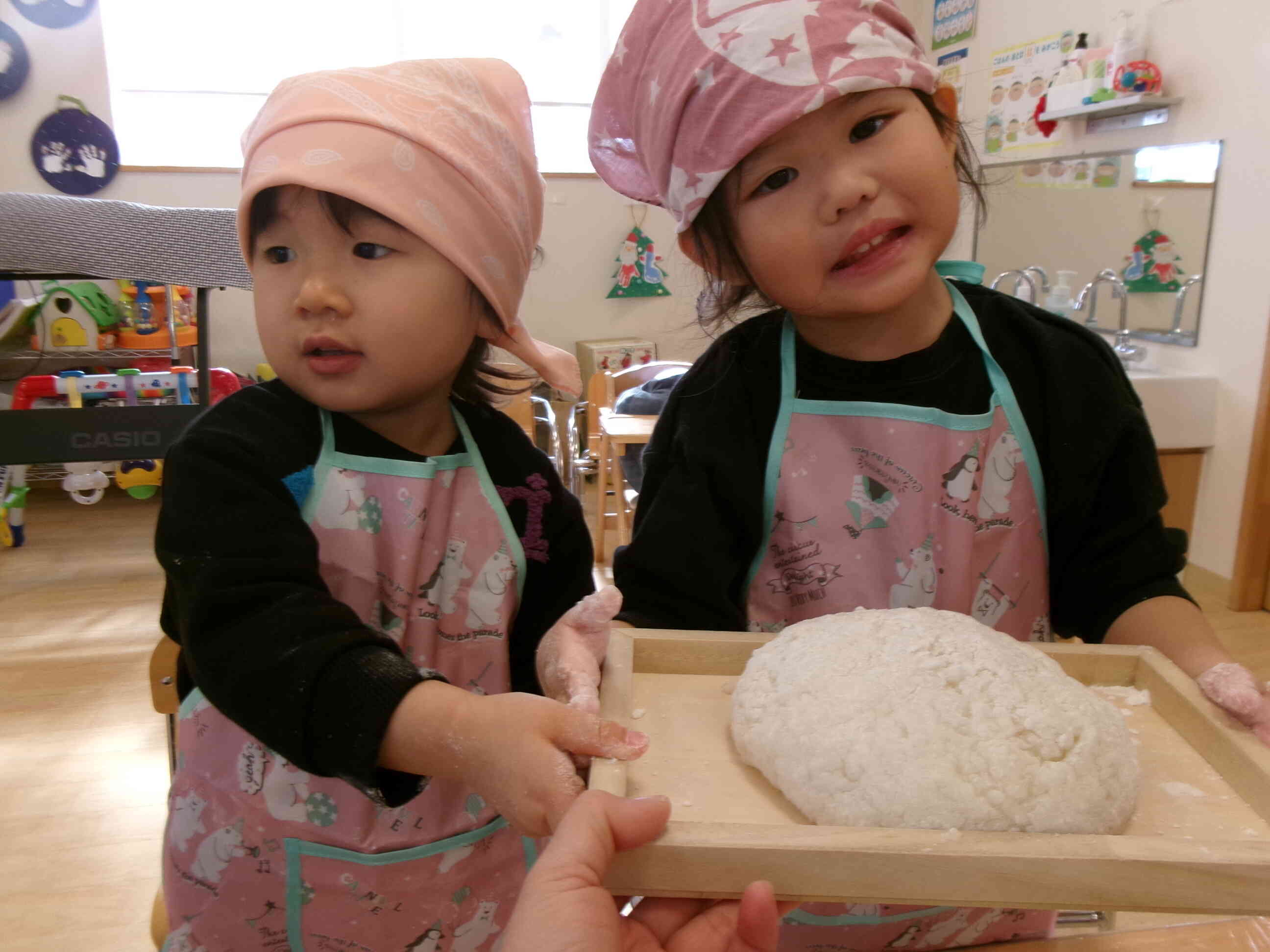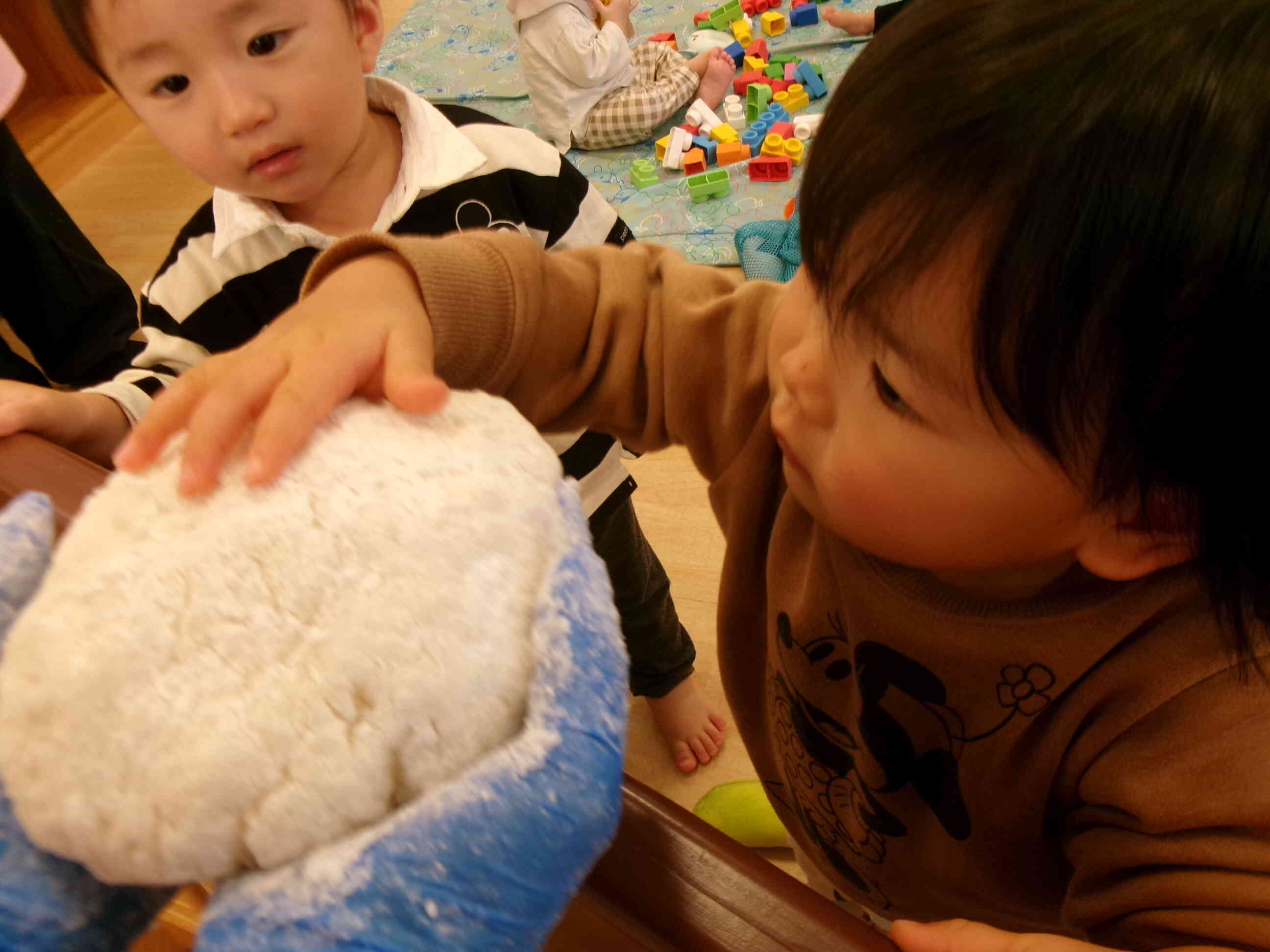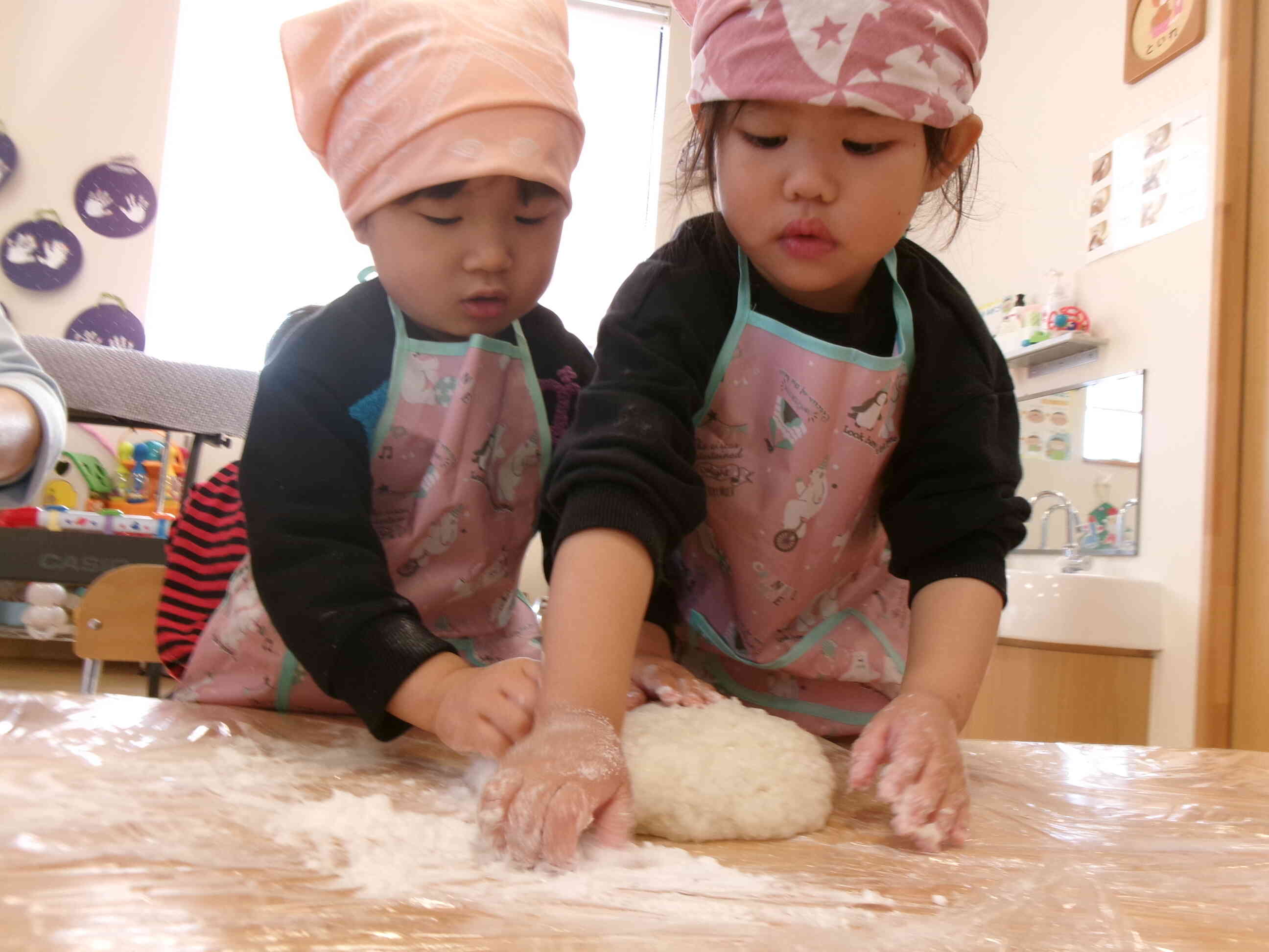 いつも粘土遊びをしているので、なかなか慣れた手つきで丸めていく2歳児さん。