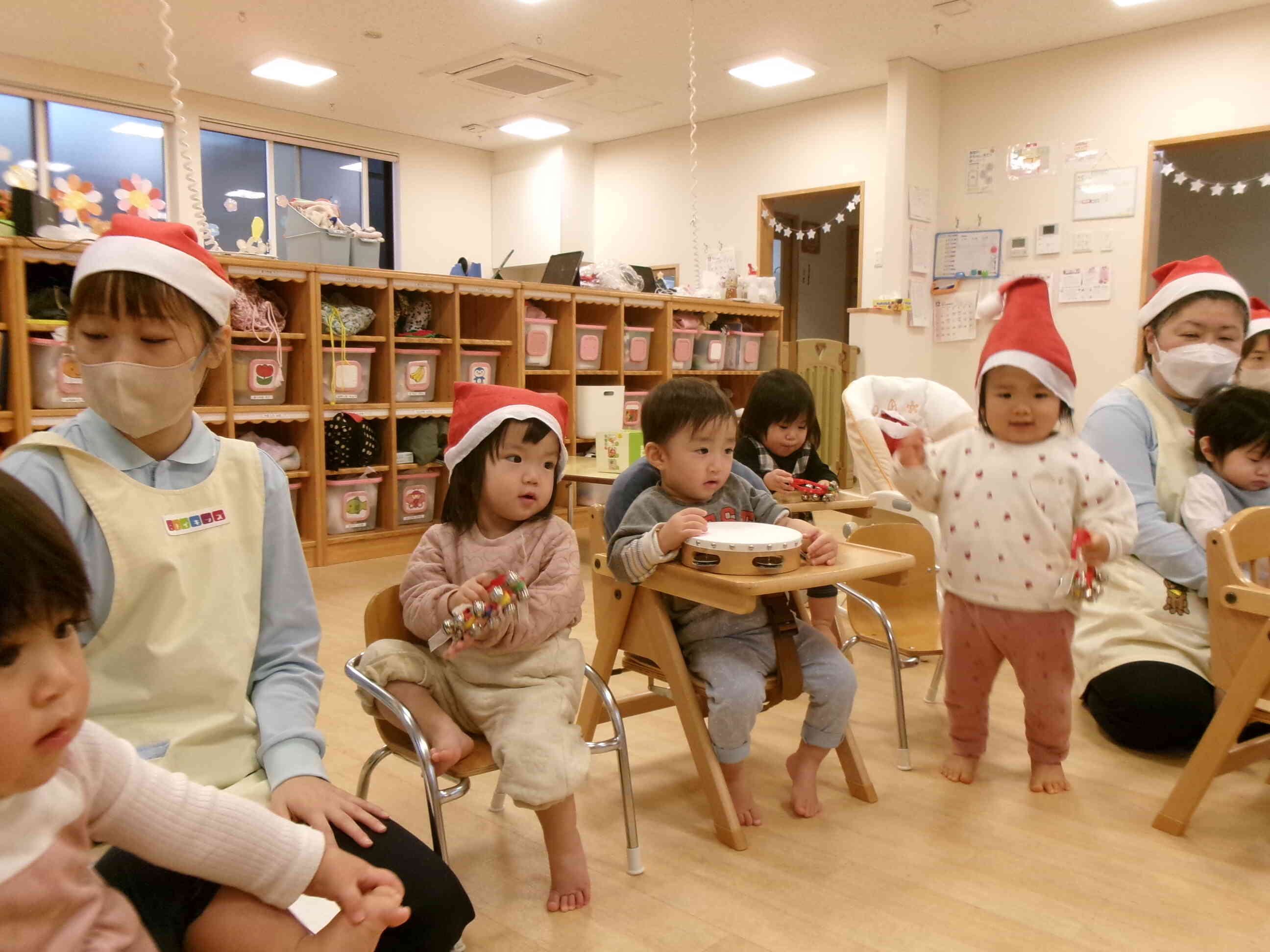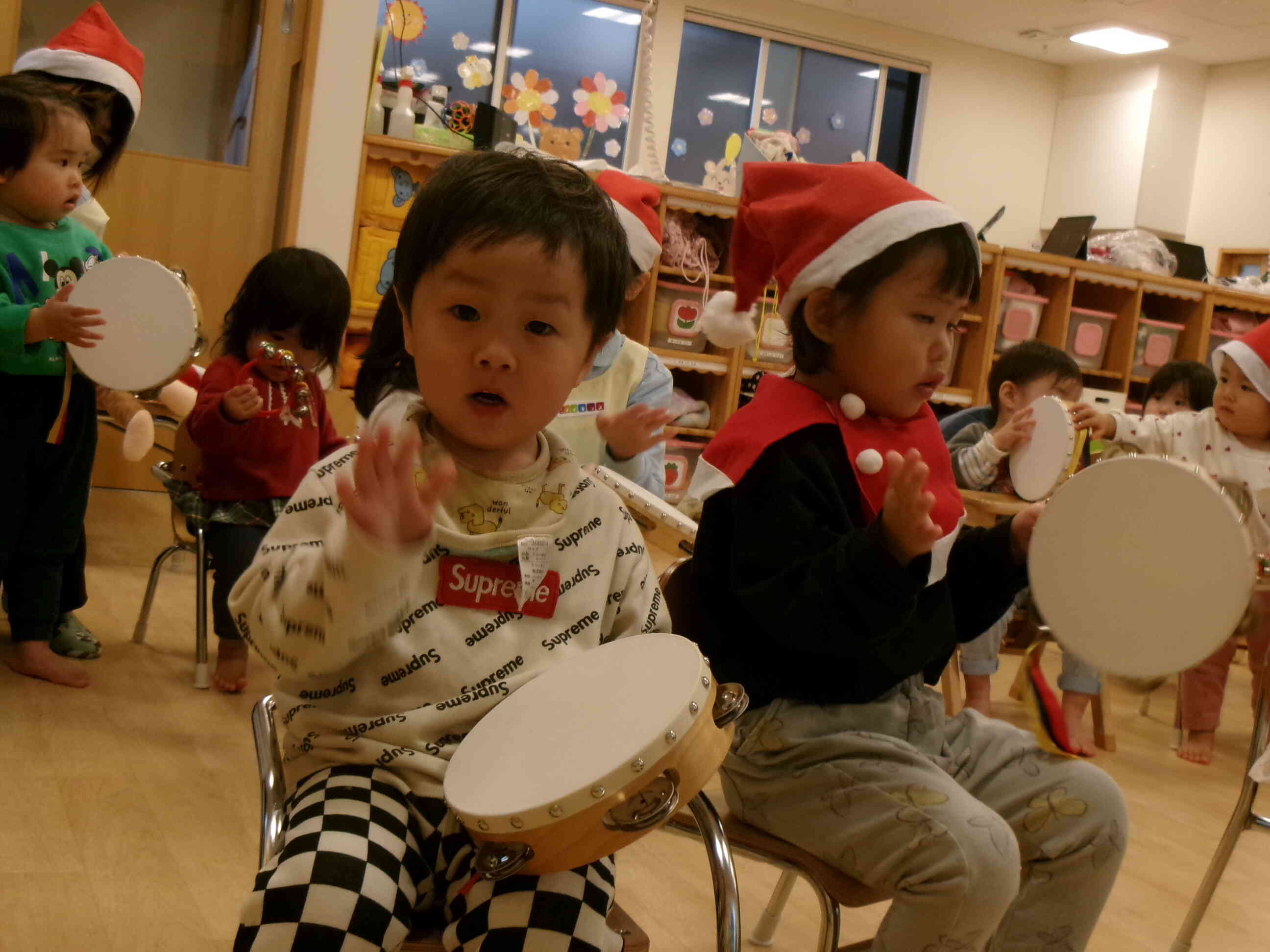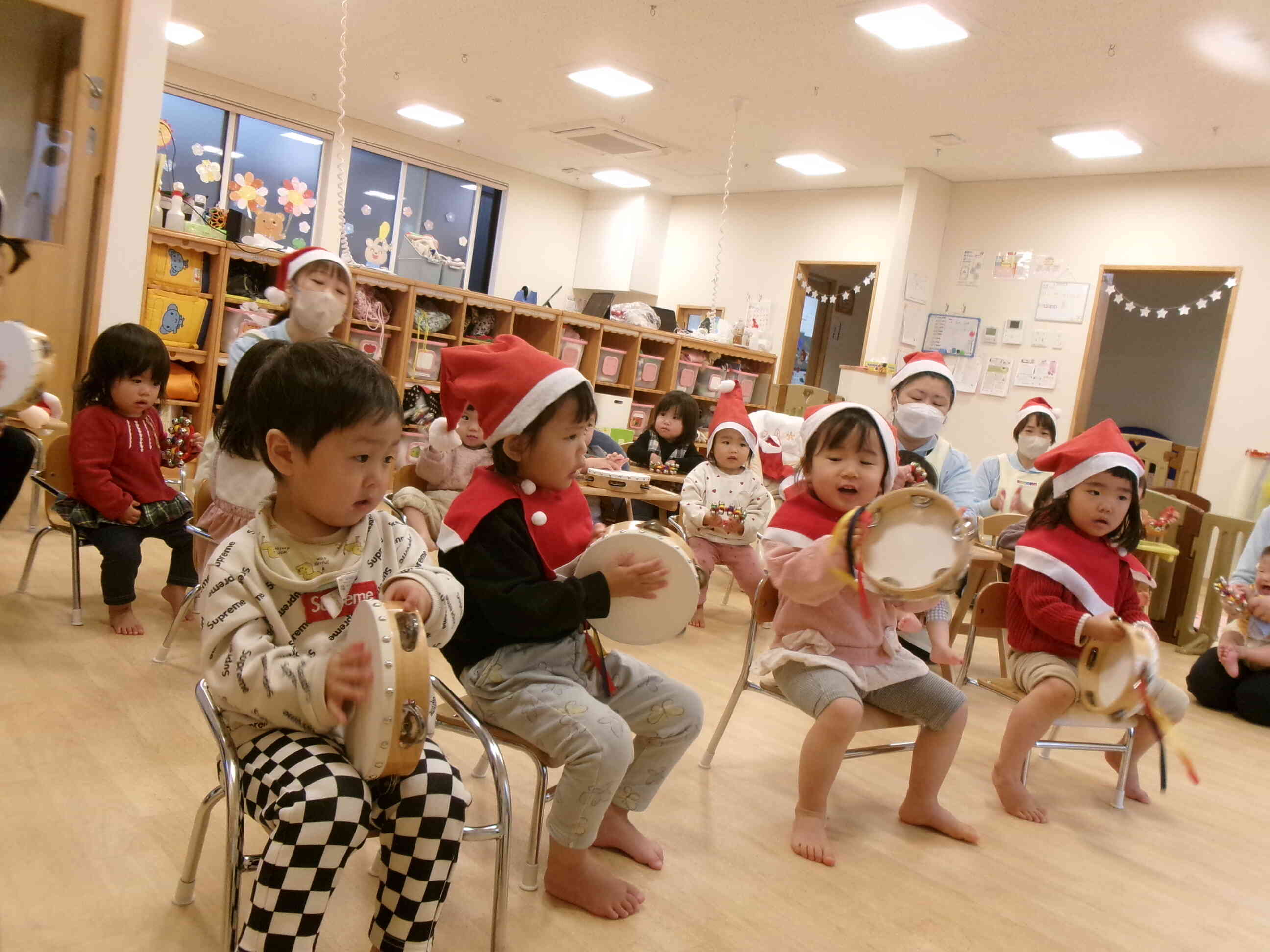 クリスマスソングをみんなで演奏しました。スズやタンバリンの音が、お空のサンタさんに聞こえるように元気に演奏しました。